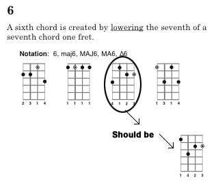 - 1/23/2005 - (20060123.2.7) page 11, 6th chords. Third chord grid in, the notes on strings 4 and 3 are on the right fret but the strings needs to be swapped. Fingering is also changed to reflect this. (see below).
