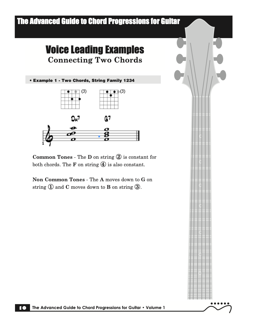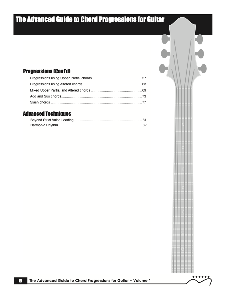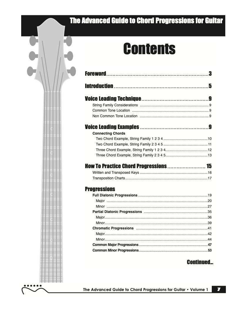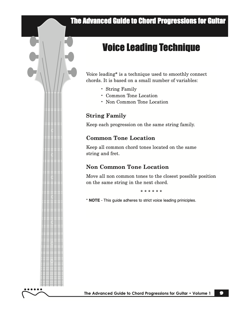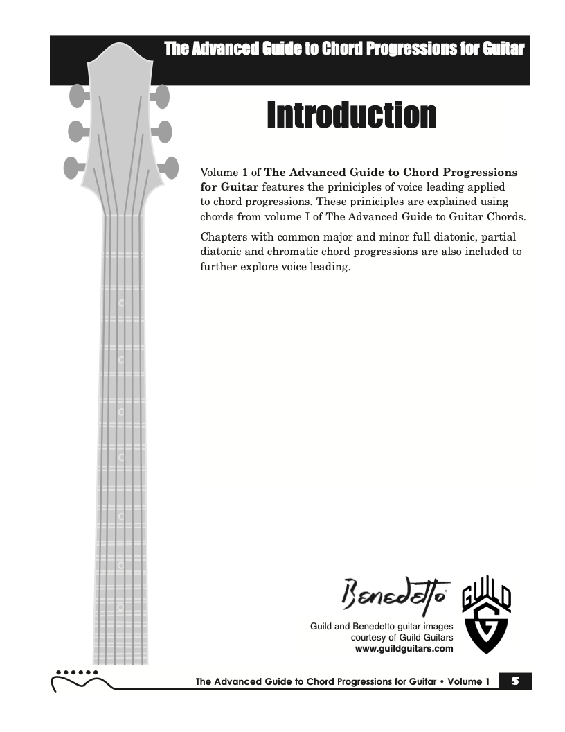 Volume I of The Advanced Guide to Chord Progressions for Guitar features the principles of voice leading applied to chord progressions. These principles, explained using chords from volume I of The Advanced Guide to Guitar Chords. Chapters with common major and minor full diatonic, partial diatonic and chromatic chord progressions are also included to further explore voice leading.