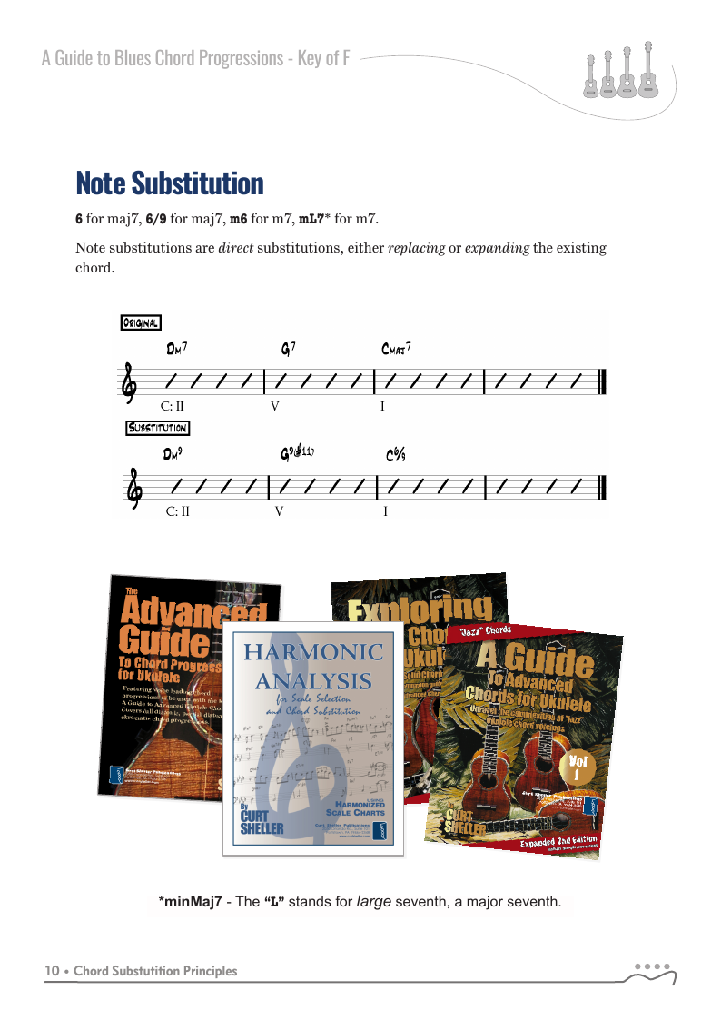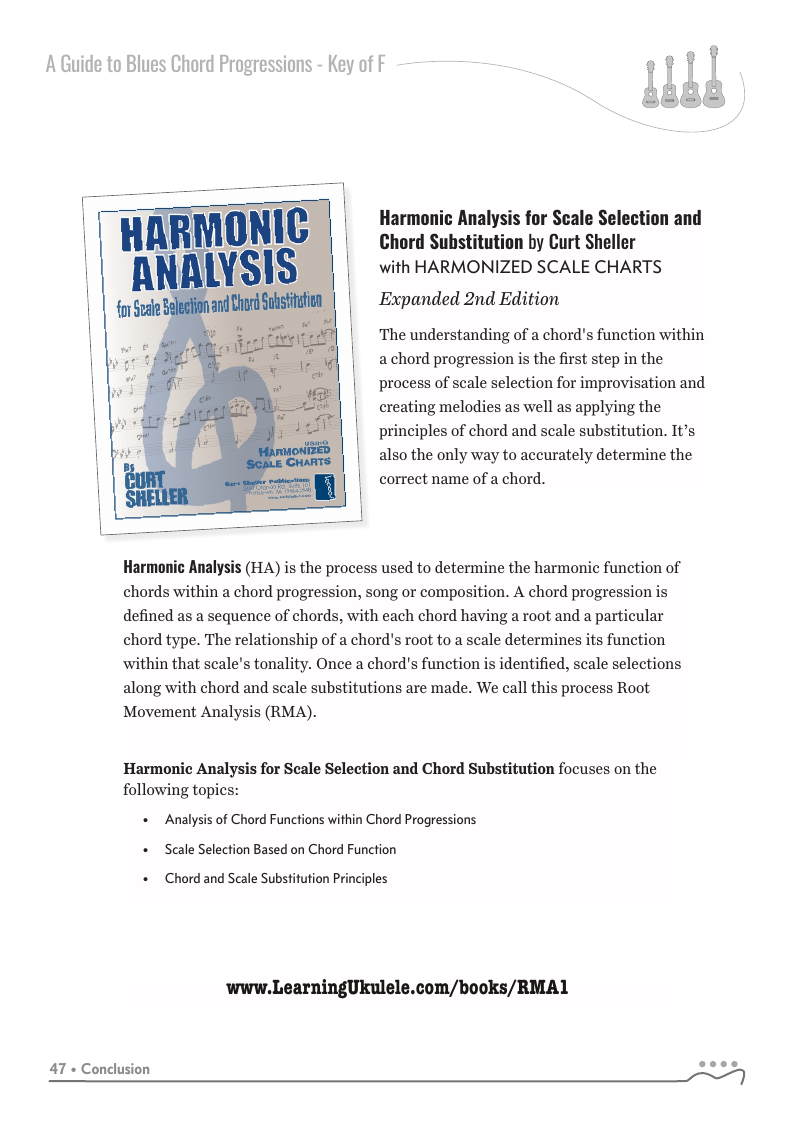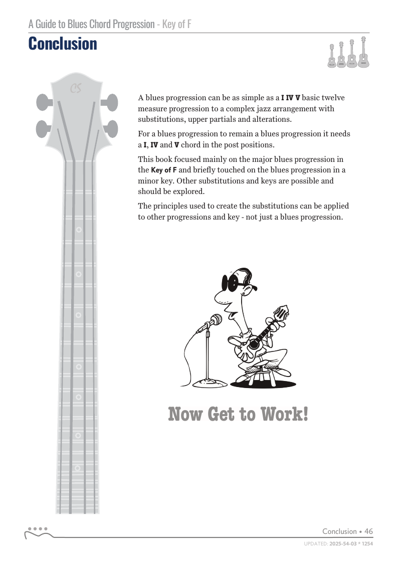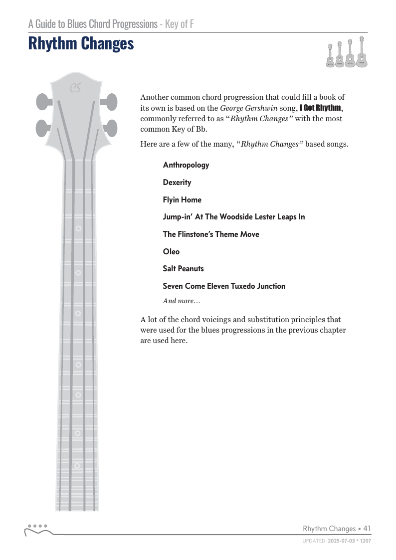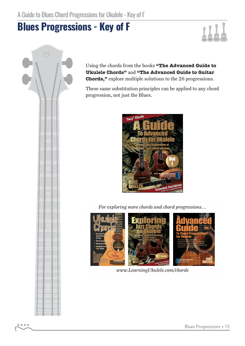 New & Updated 2nd Edition for the Key of F, ANY Tuning – Just the basic chords with out suggested chord shapes. • A Guide to Blues Chord Progressions A to Z – Key of F .