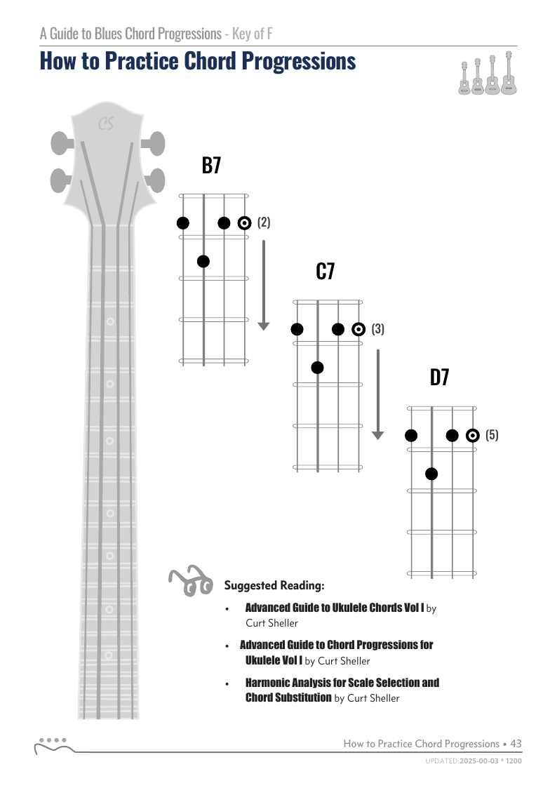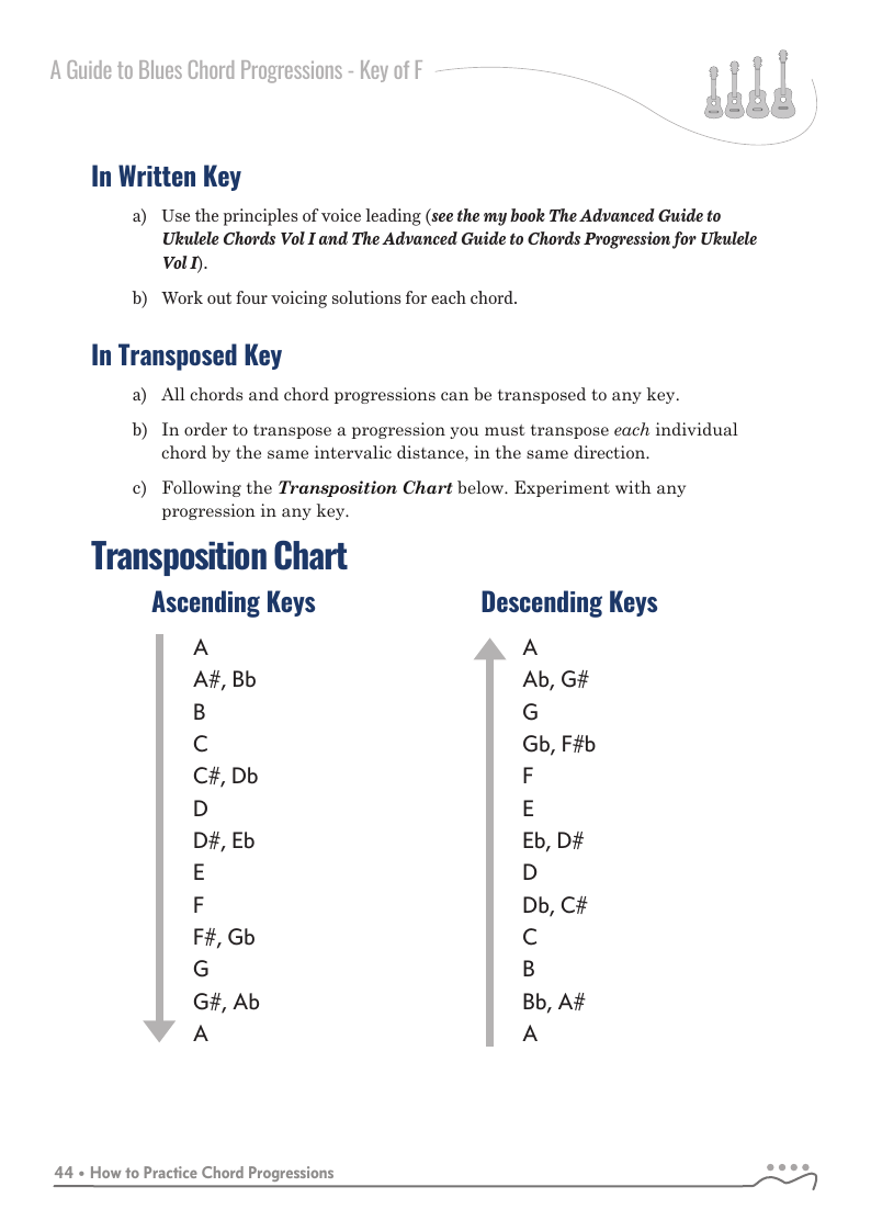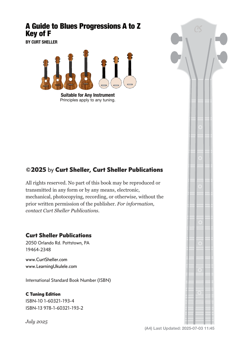 If a beginner or intermediate player it is recommended to have gone through the A Guide to Blues Chord Progressions for Ukulele A to Z, Key of C books, either the C Tuning or C Tuning editions before tackling additional new keys.