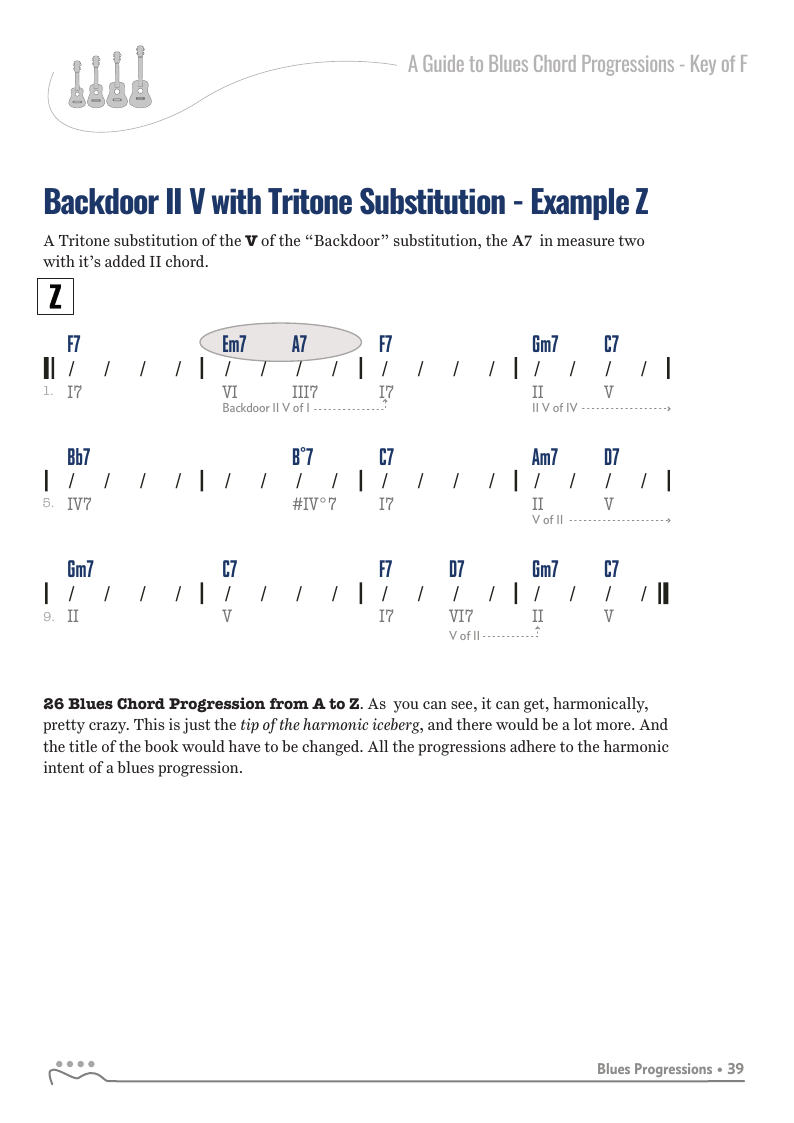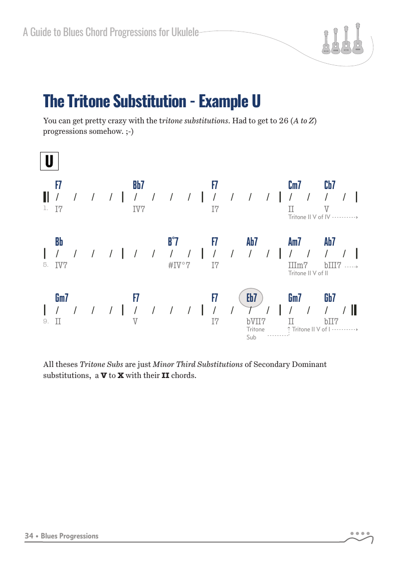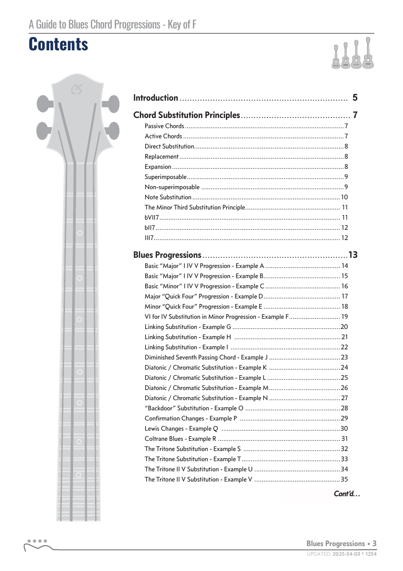 A Guide to Blues Chord Progressions for Ukulele A to Z starts with a basic three chord, 12 bar blues and progresses through 26 blues progression in C tuning up to a sophisticated jazz blues with multiple chord substitutions.