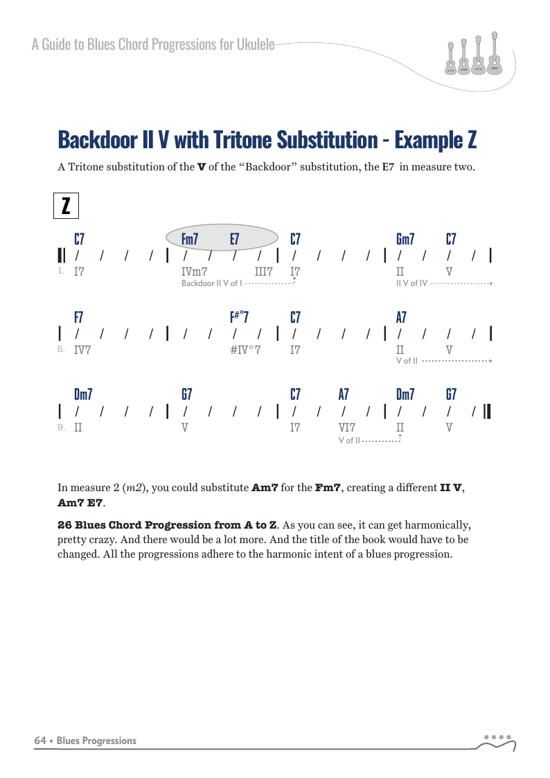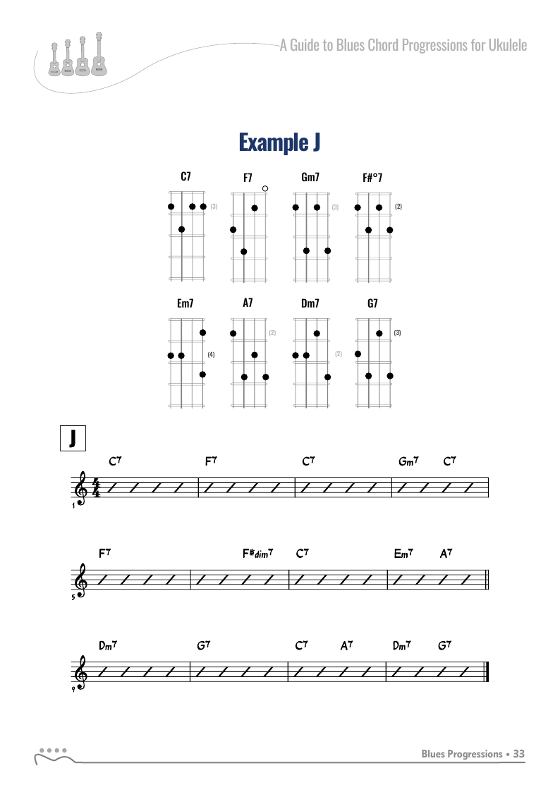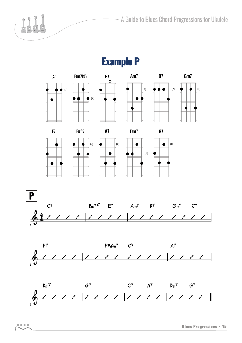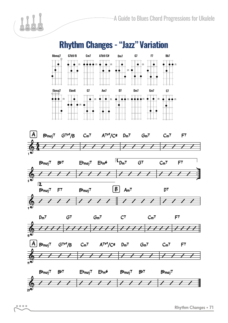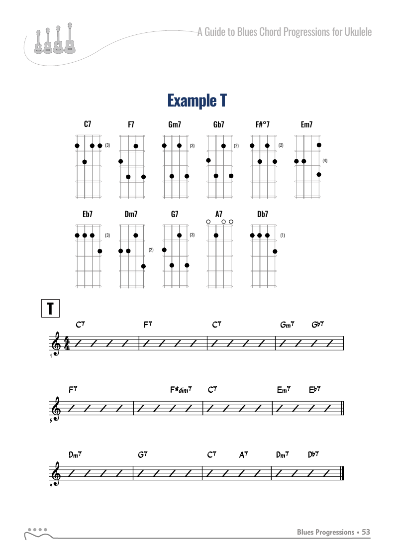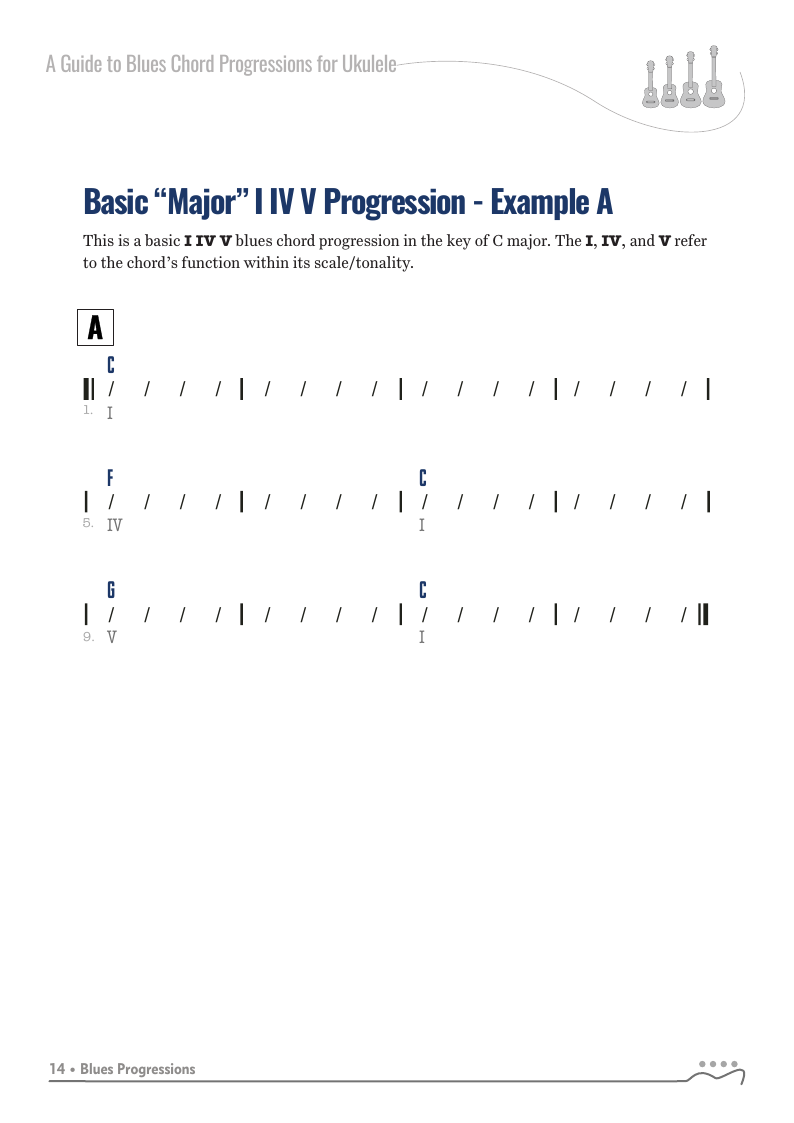 A Guide to Blues Chord Progressions for Ukulele A to Z starts with a basic three chord, 12 bar blues and progresses through 26 blues progression in C tuning up to a sophisticated jazz blues with multiple chord substitutions.
