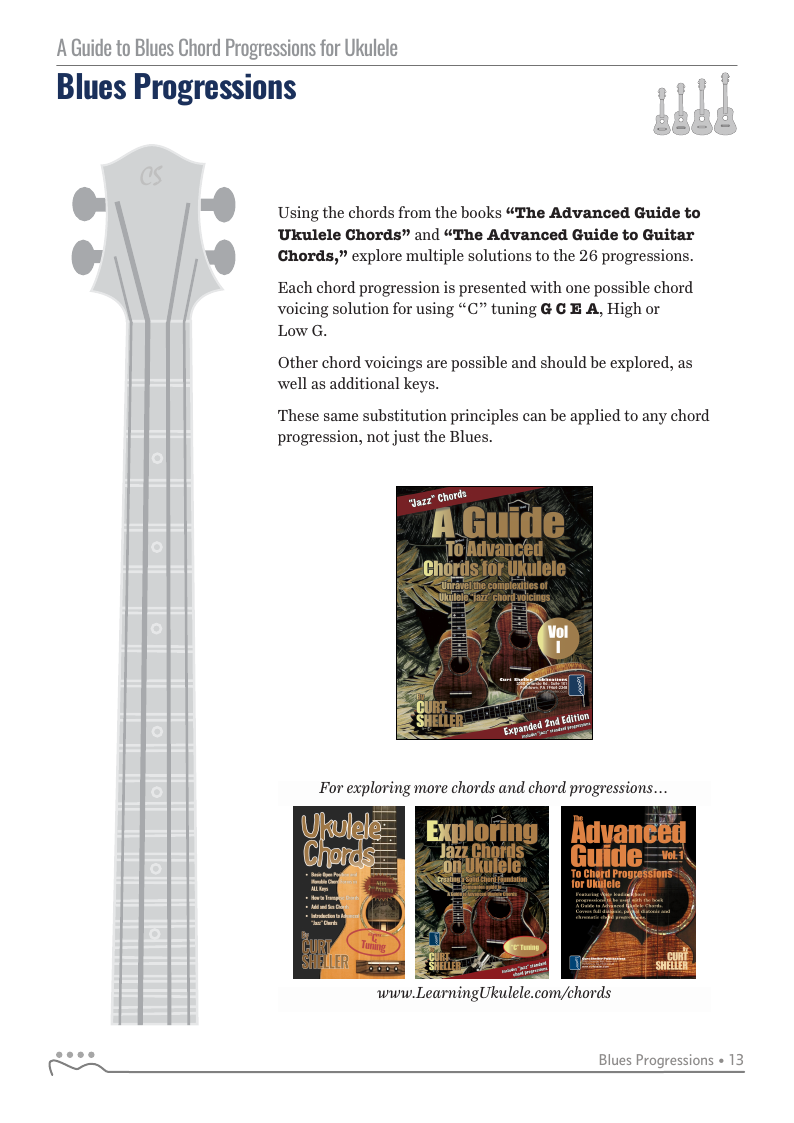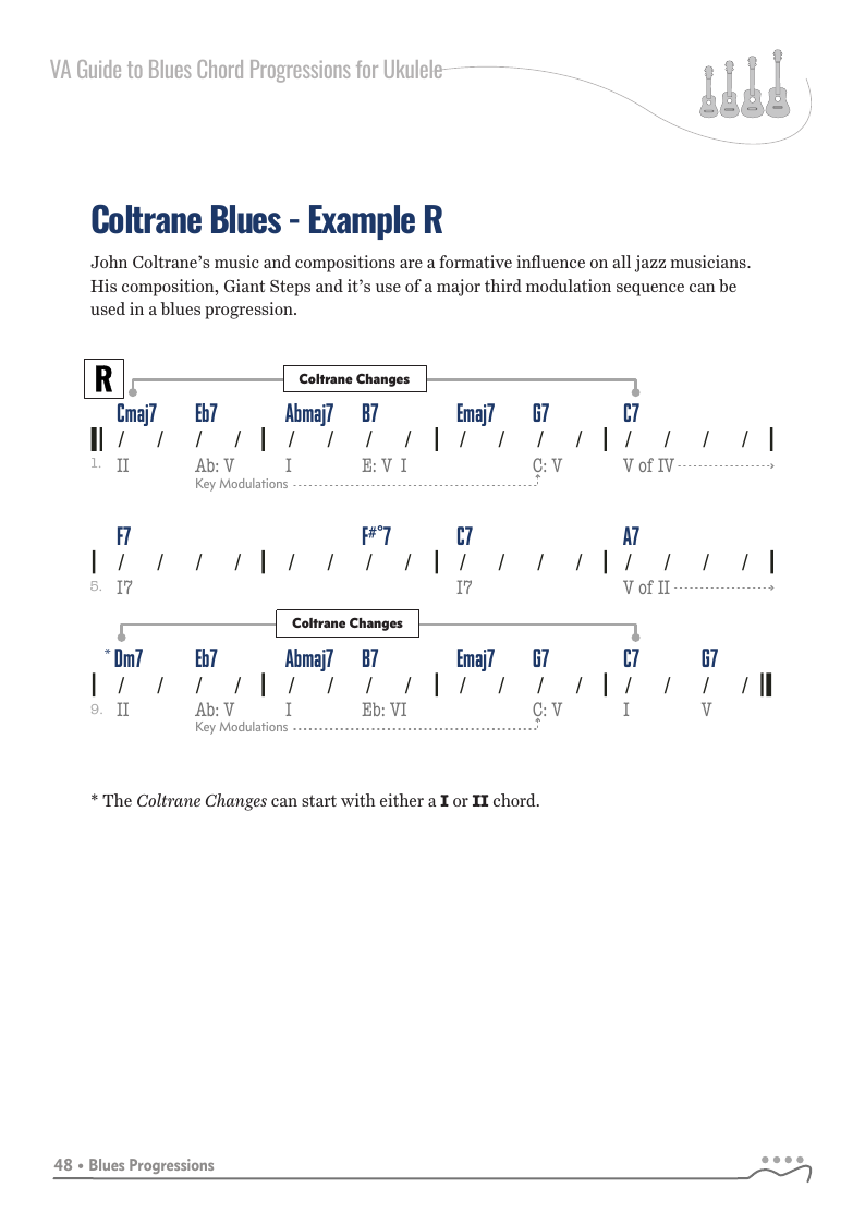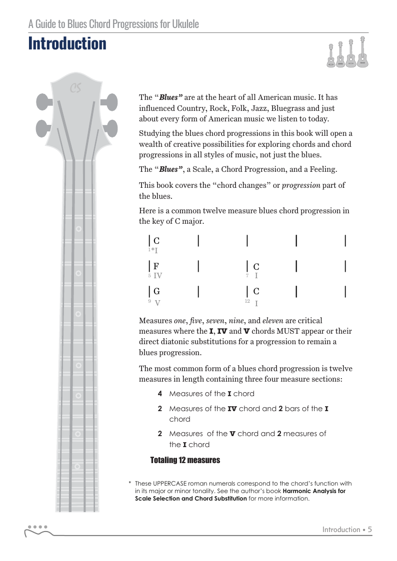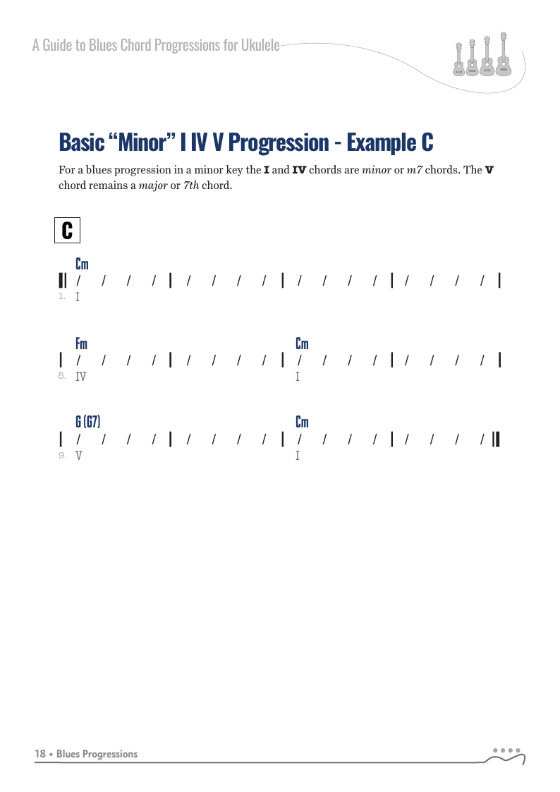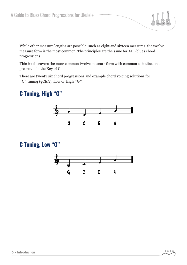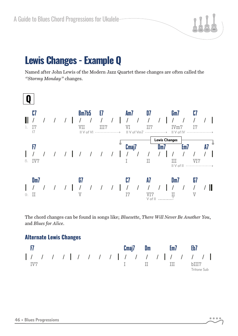 A Guide to Blues Chord Progressions for Ukulele A to Z starts with a basic three chord, 12 bar blues and progresses through 26 blues progression in C tuning up to a sophisticated jazz blues with multiple chord substitutions.