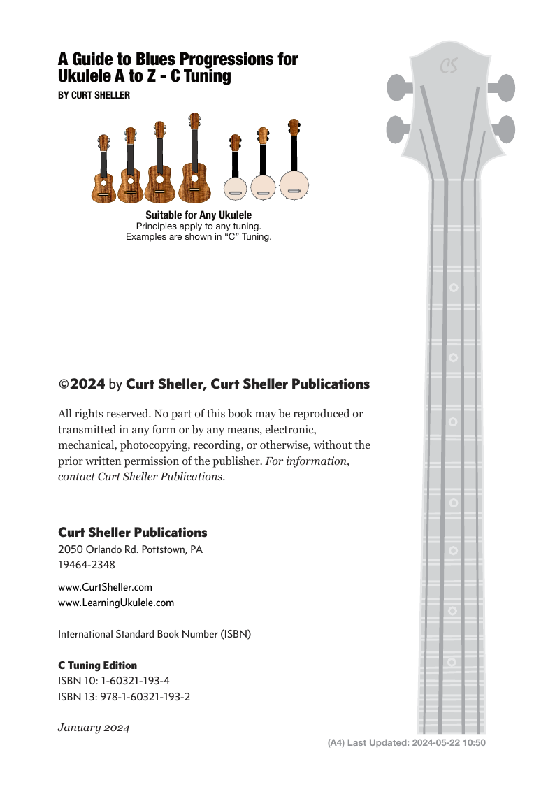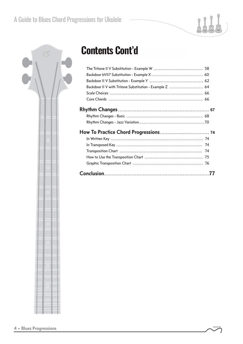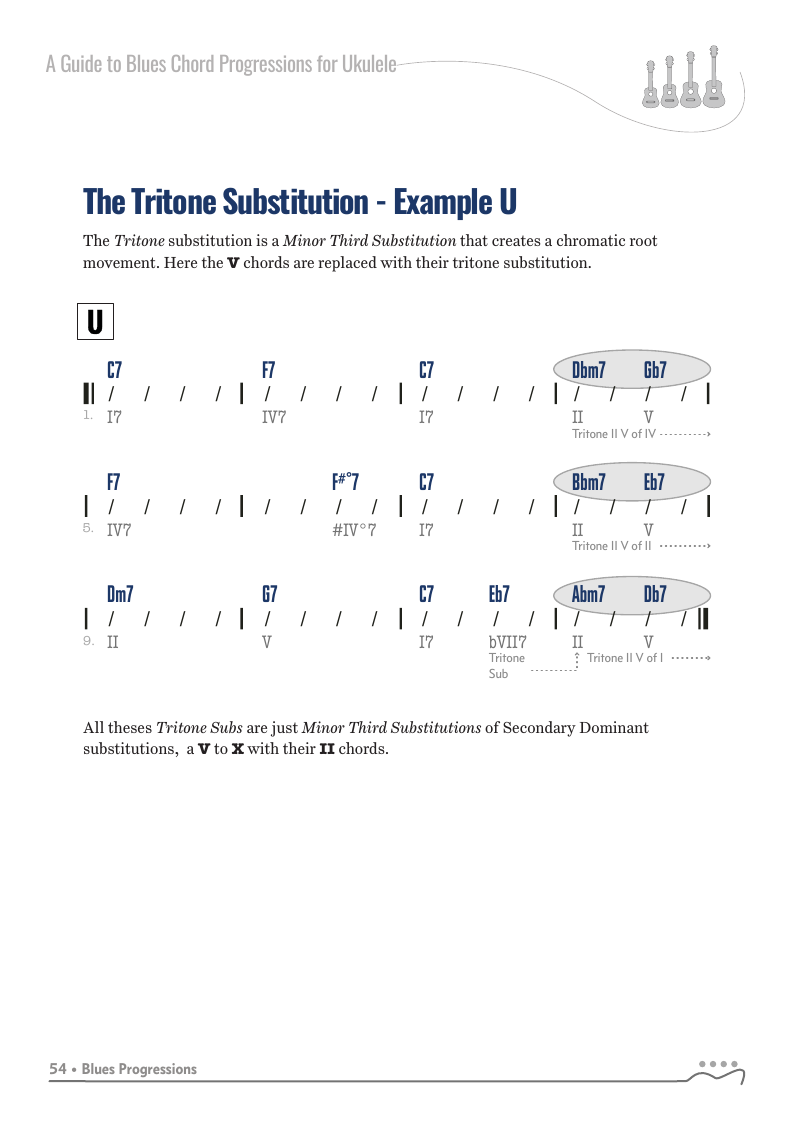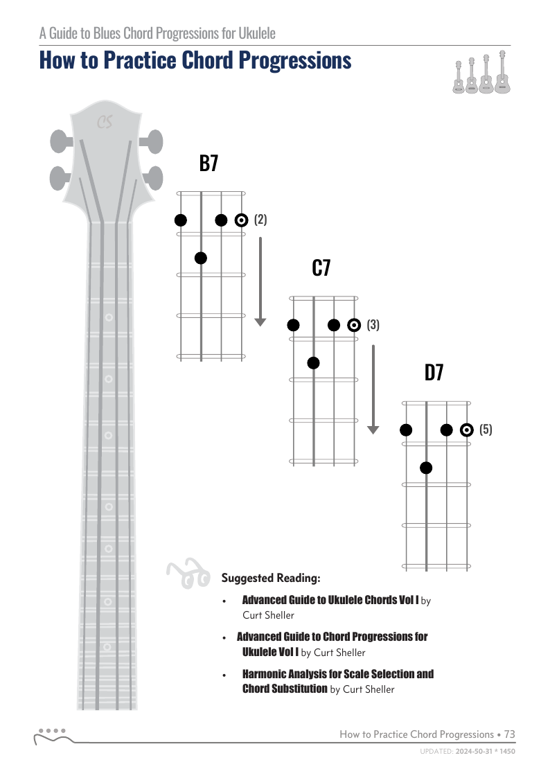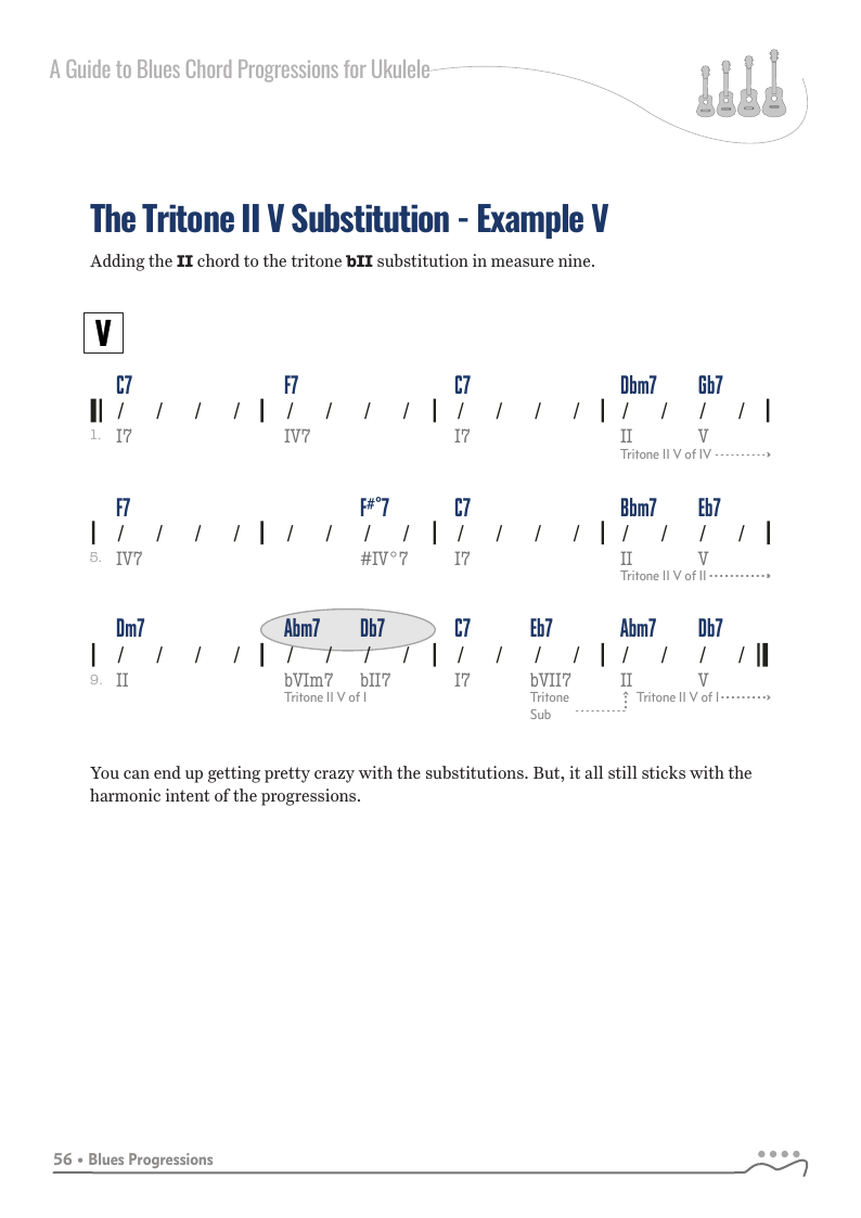 A Guide to Blues Chord Progressions for Ukulele A to Z starts with a basic three chord, 12 bar blues and progresses through 26 blues progression in C tuning up to a sophisticated jazz blues with multiple chord substitutions.
