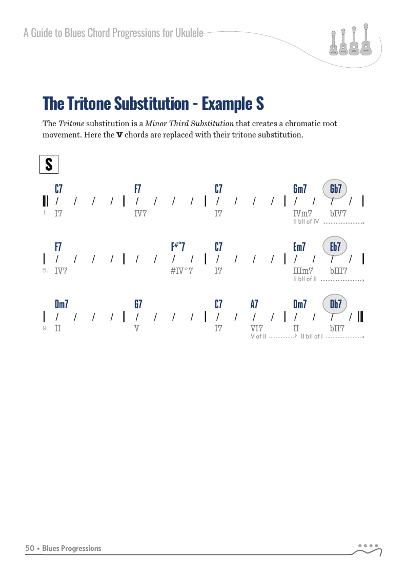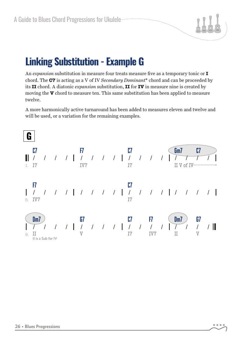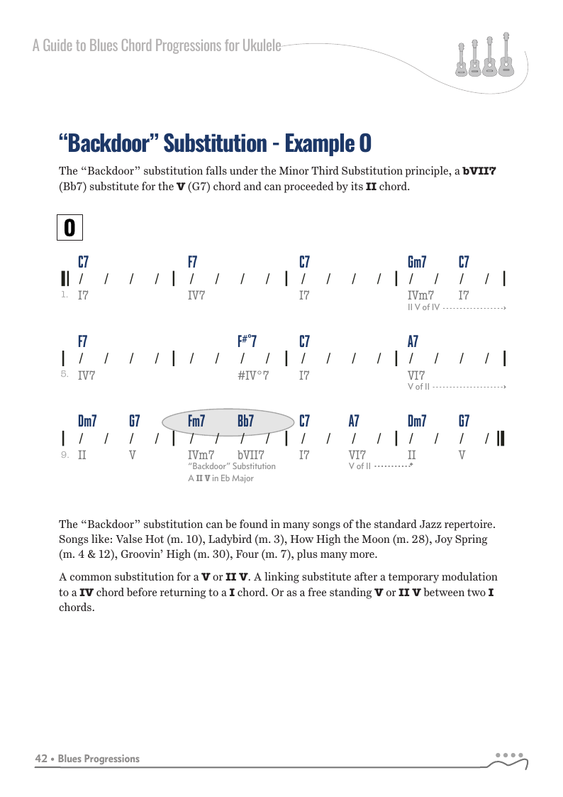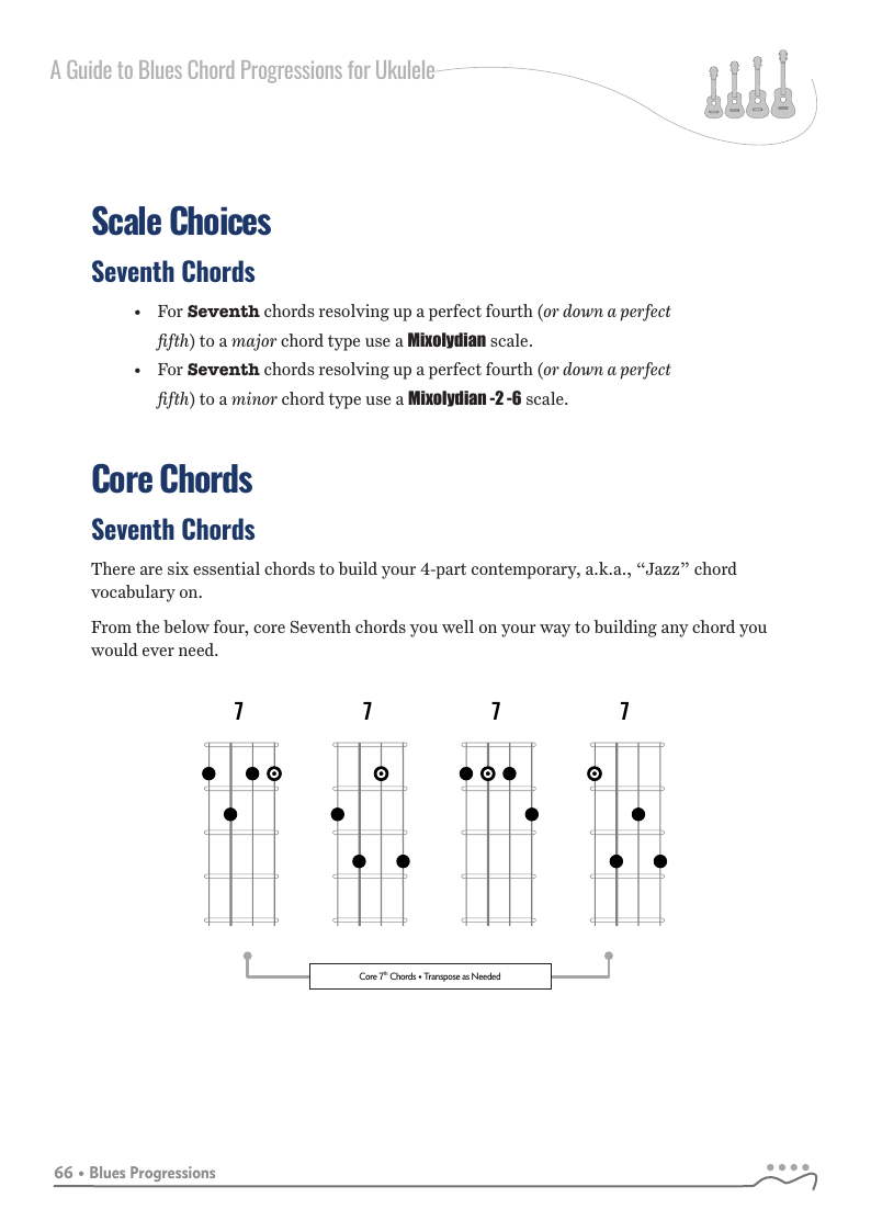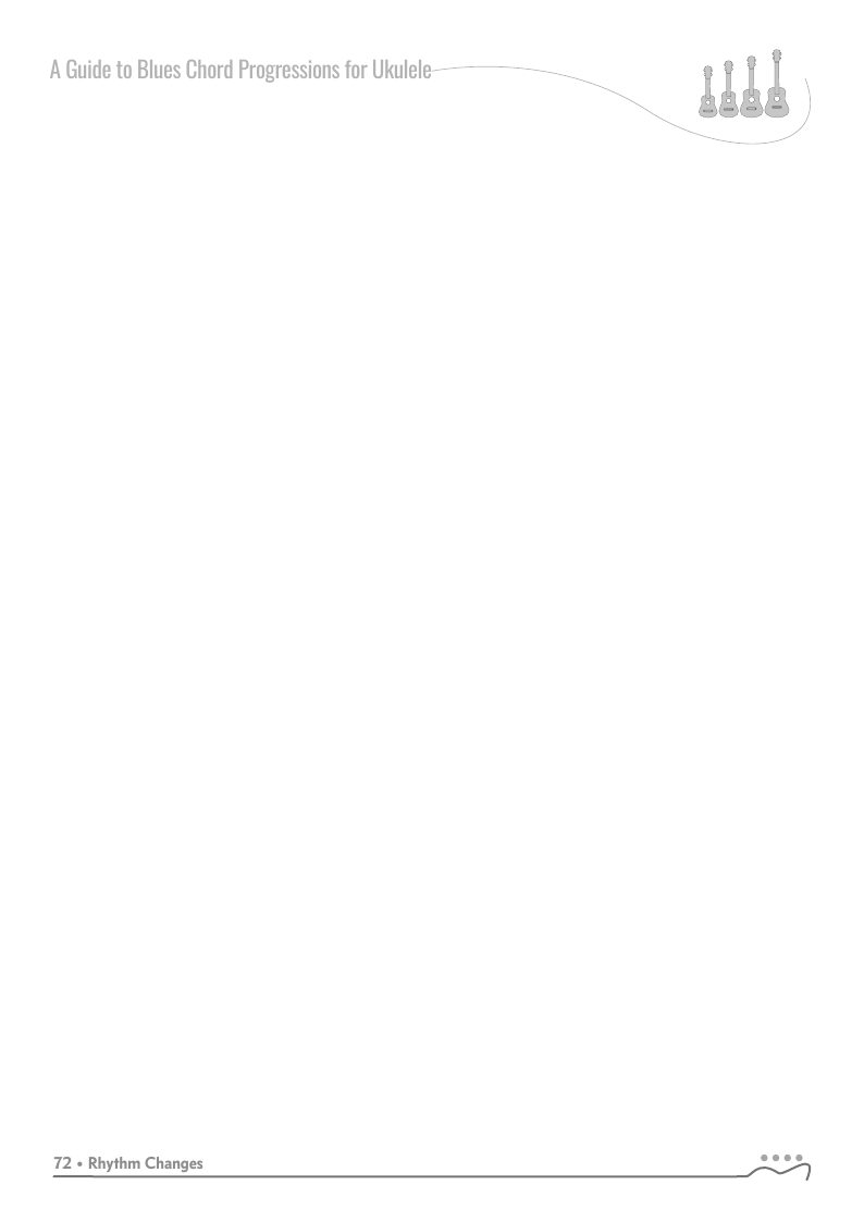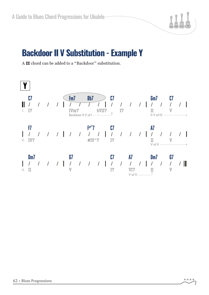 A Guide to Blues Chord Progressions for Ukulele A to Z starts with a basic three chord, 12 bar blues and progresses through 26 blues progression in C tuning up to a sophisticated jazz blues with multiple chord substitutions.