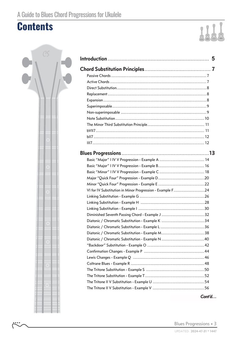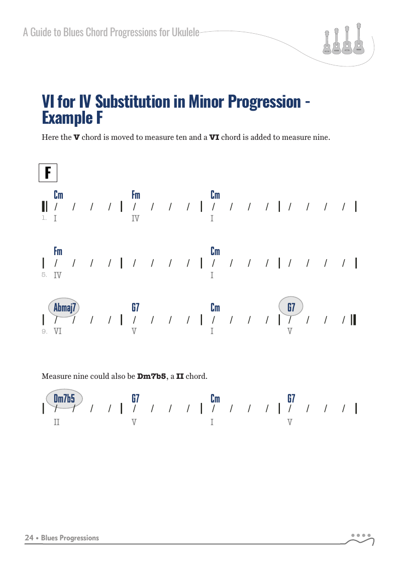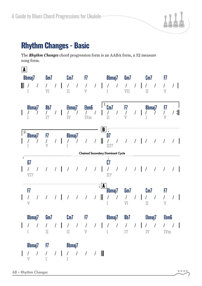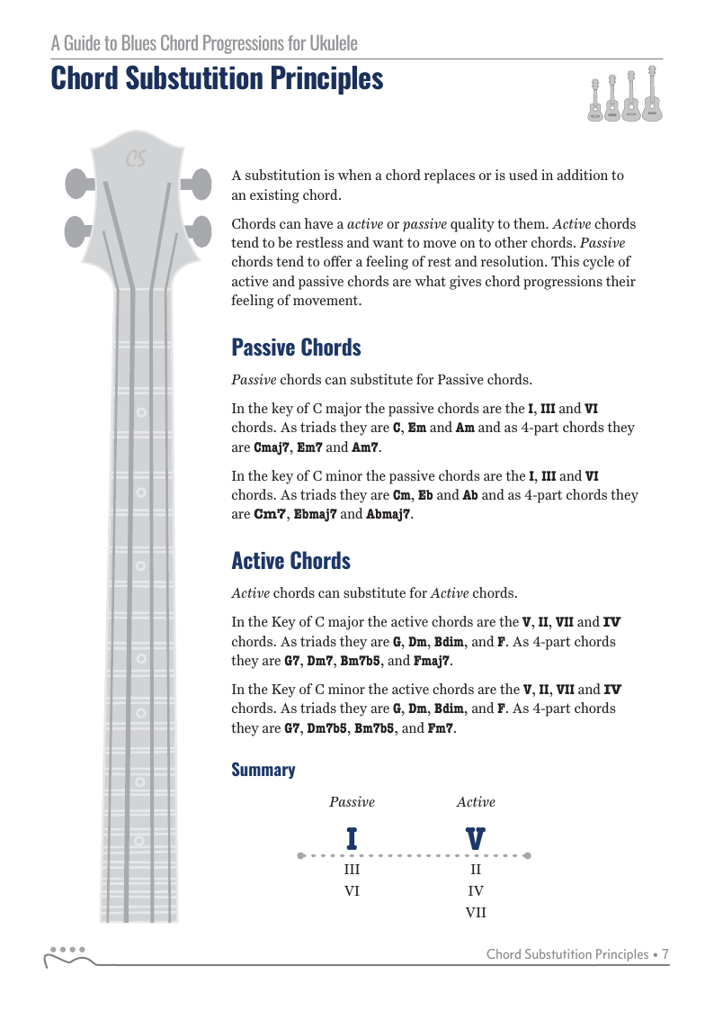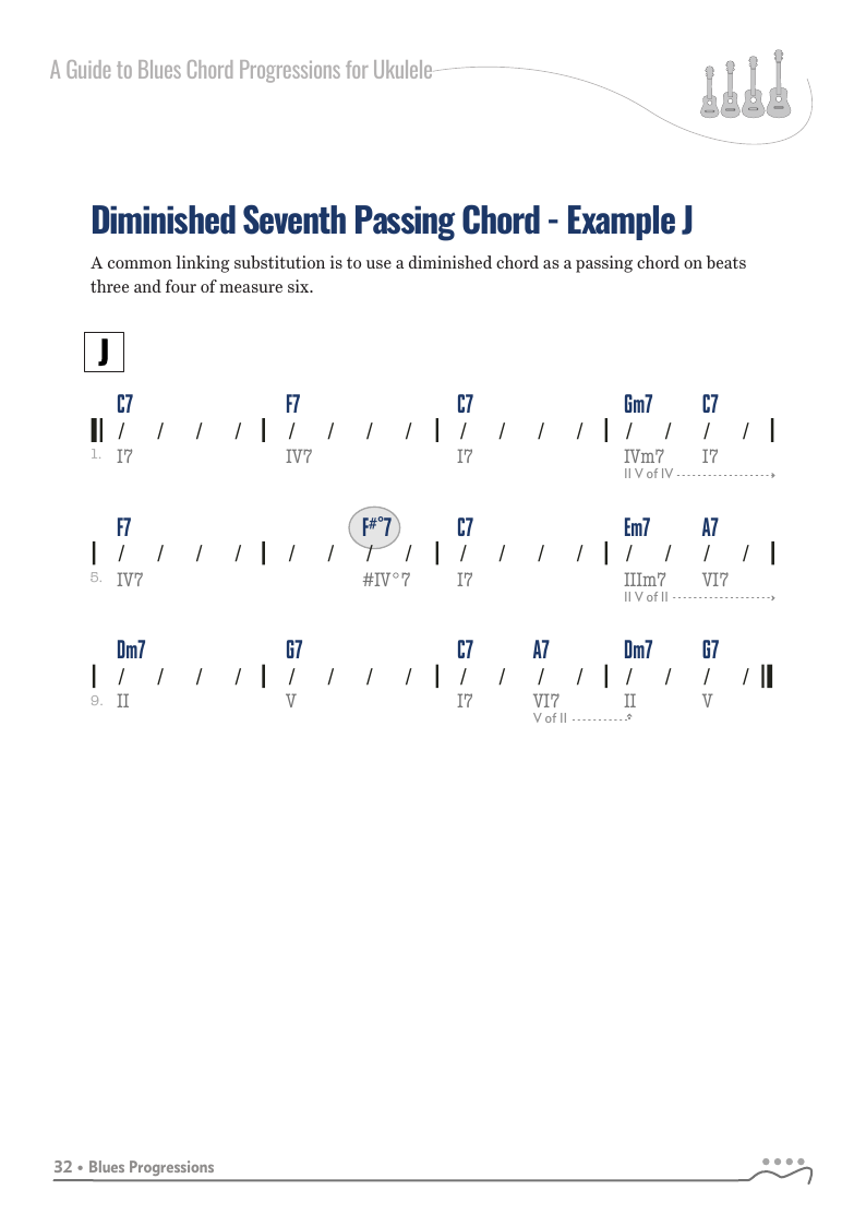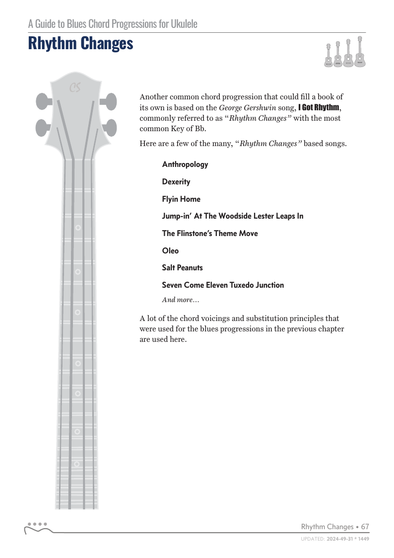 A Guide to Blues Chord Progressions for Ukulele A to Z starts with a basic three chord, 12 bar blues and progresses through 26 blues progression in C tuning up to a sophisticated jazz blues with multiple chord substitutions.