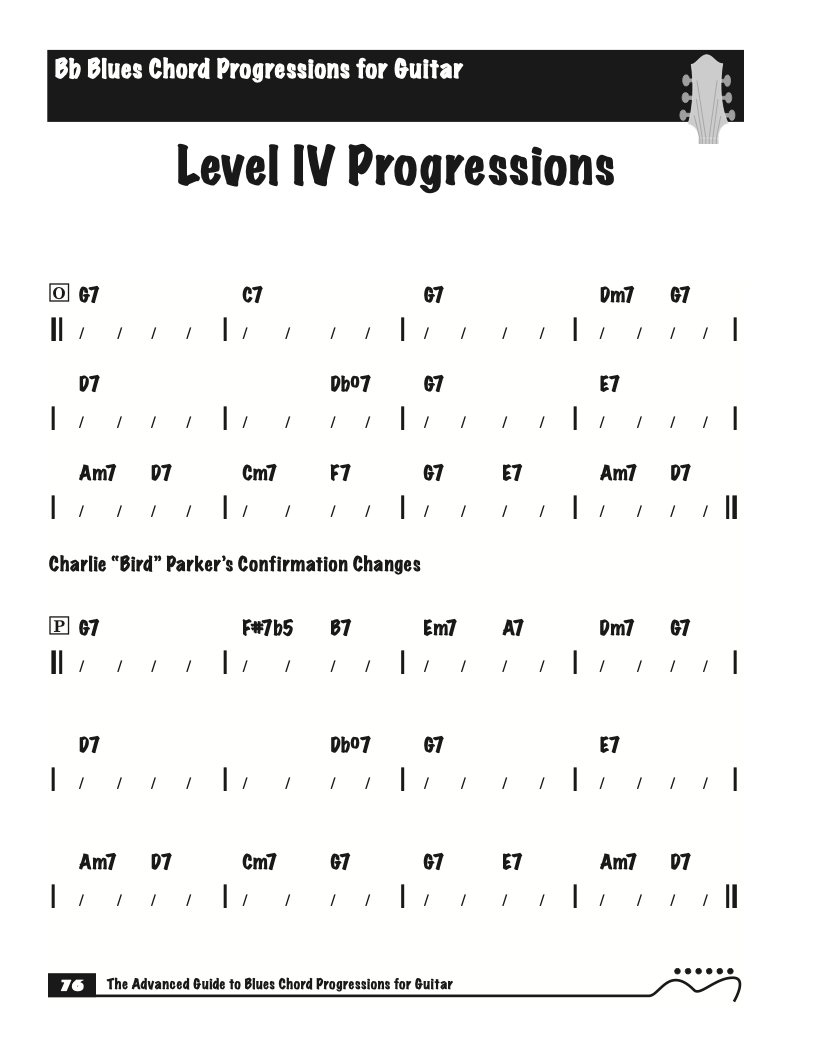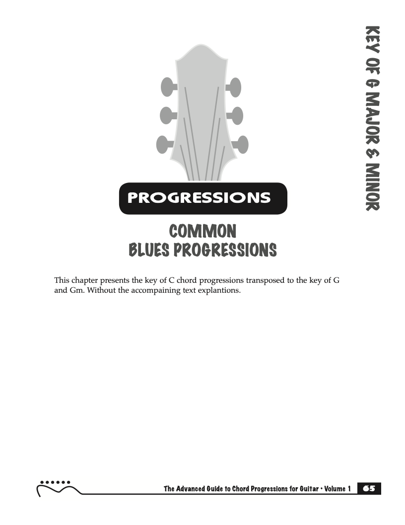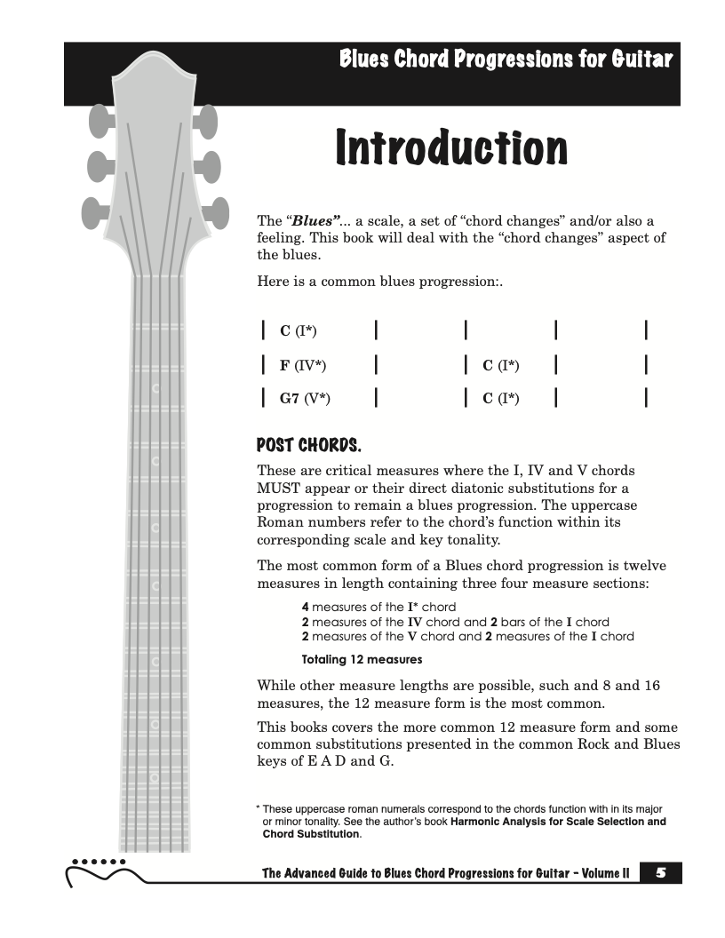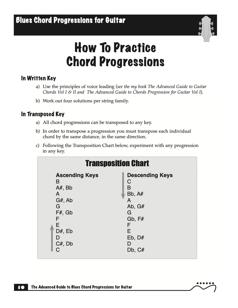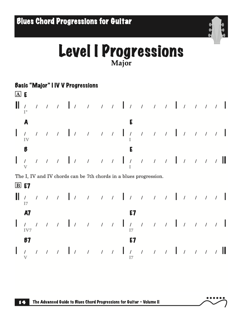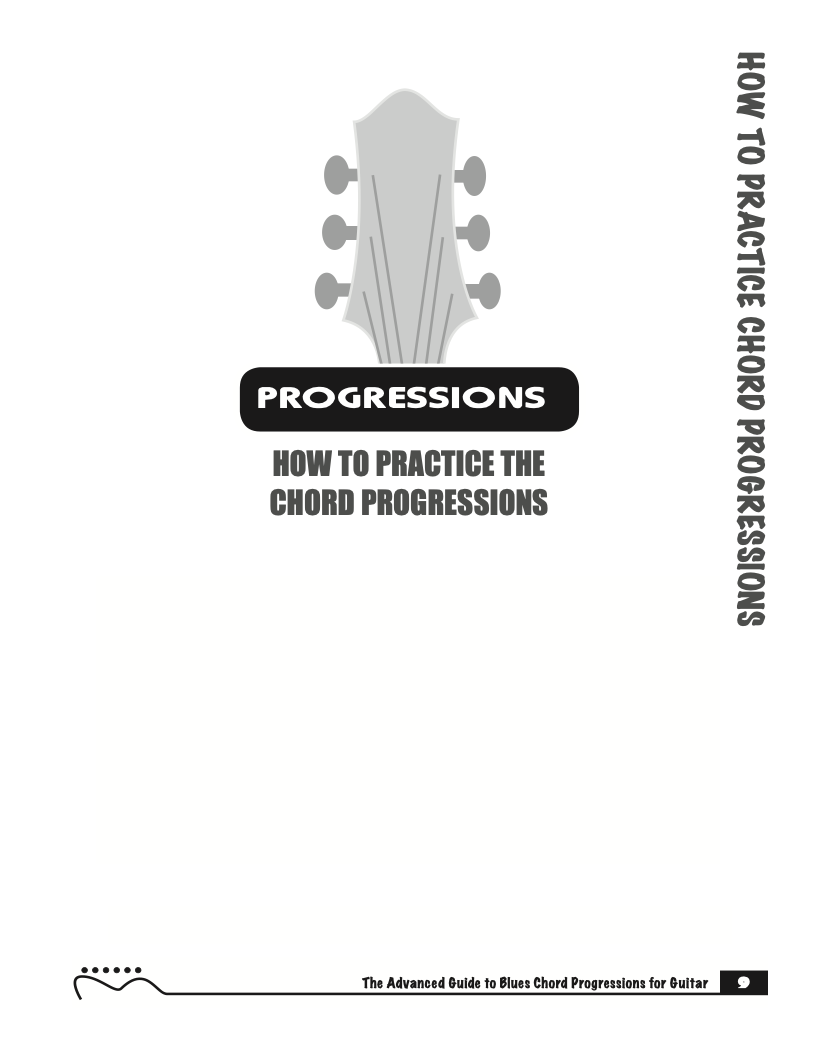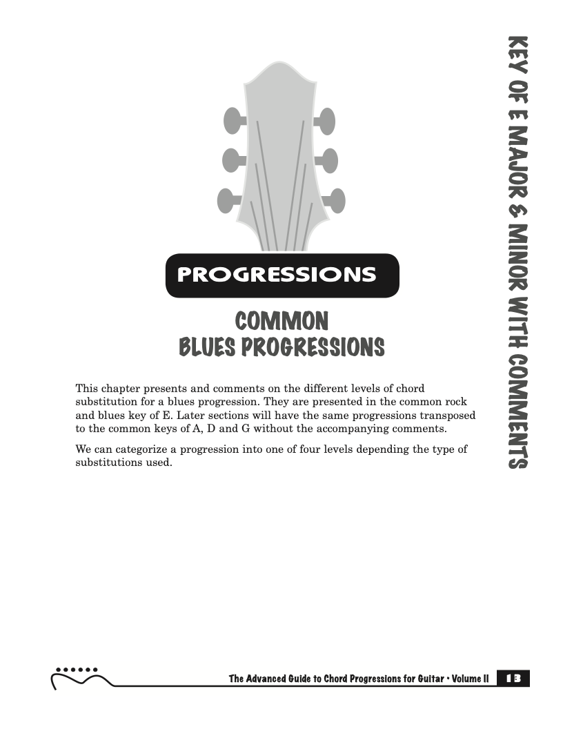 Each volume of The Advanced Guide to Blues Progressions for Guitar features basic to advanced blues chord progressions. to be used with the chord voicings from volume I , II , & III of The Advanced Guide to Guitar Chords.