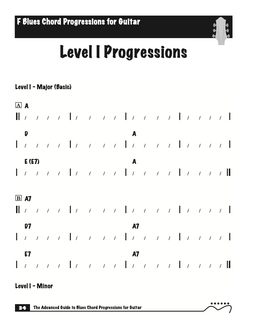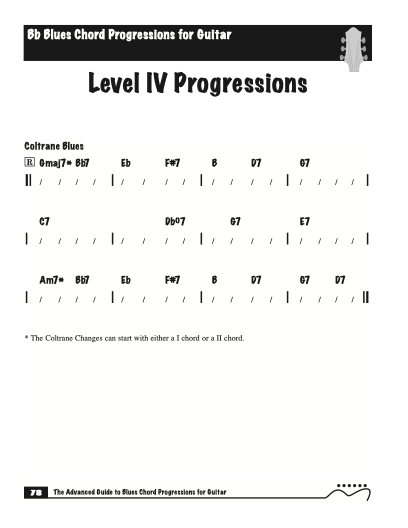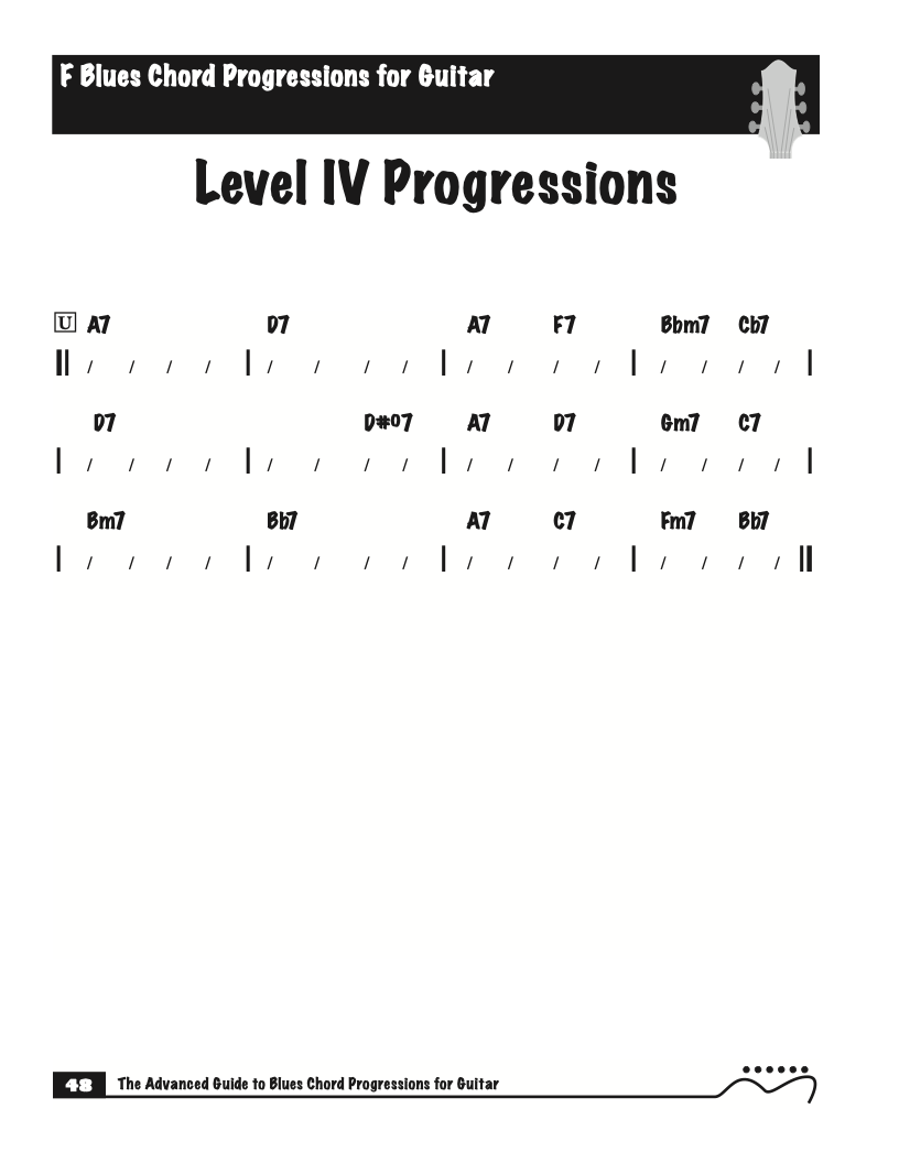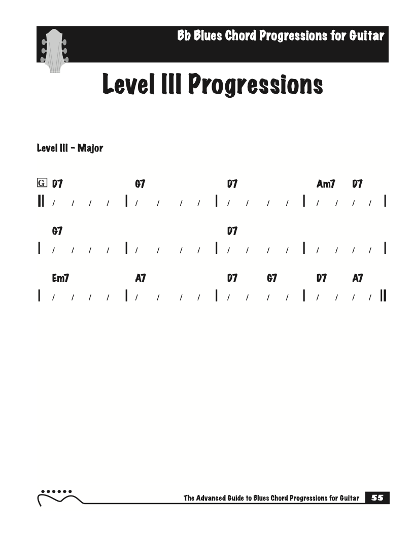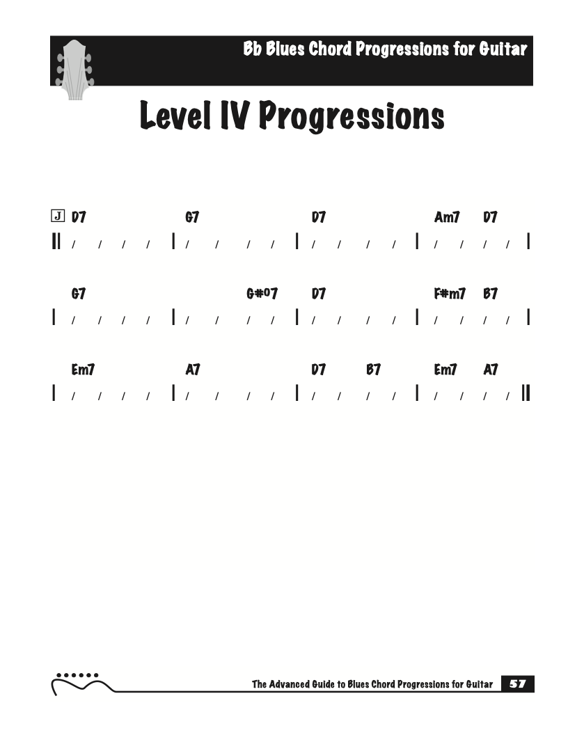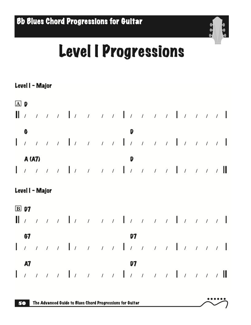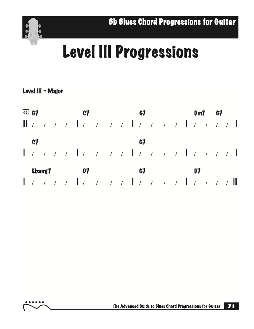 Each volume of The Advanced Guide to Blues Progressions for Guitar features basic to advanced blues chord progressions. to be used with the chord voicings from volume I , II , & III of The Advanced Guide to Guitar Chords.