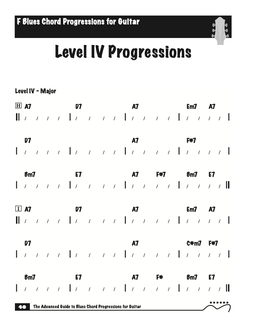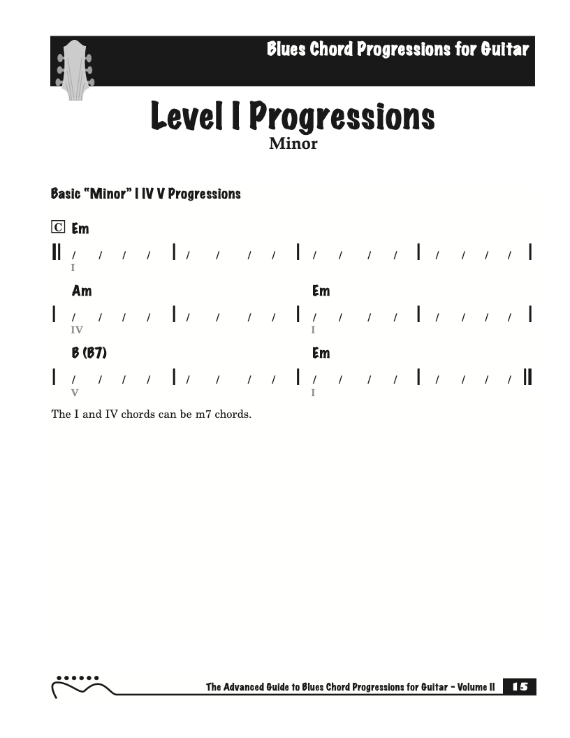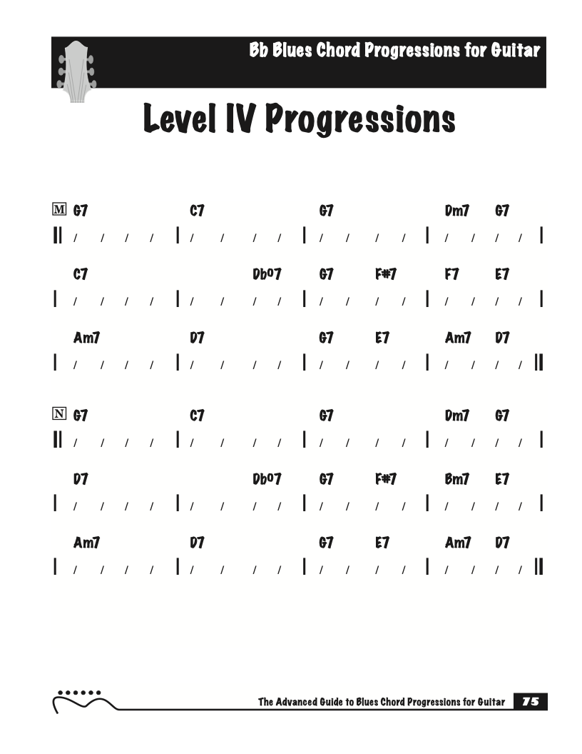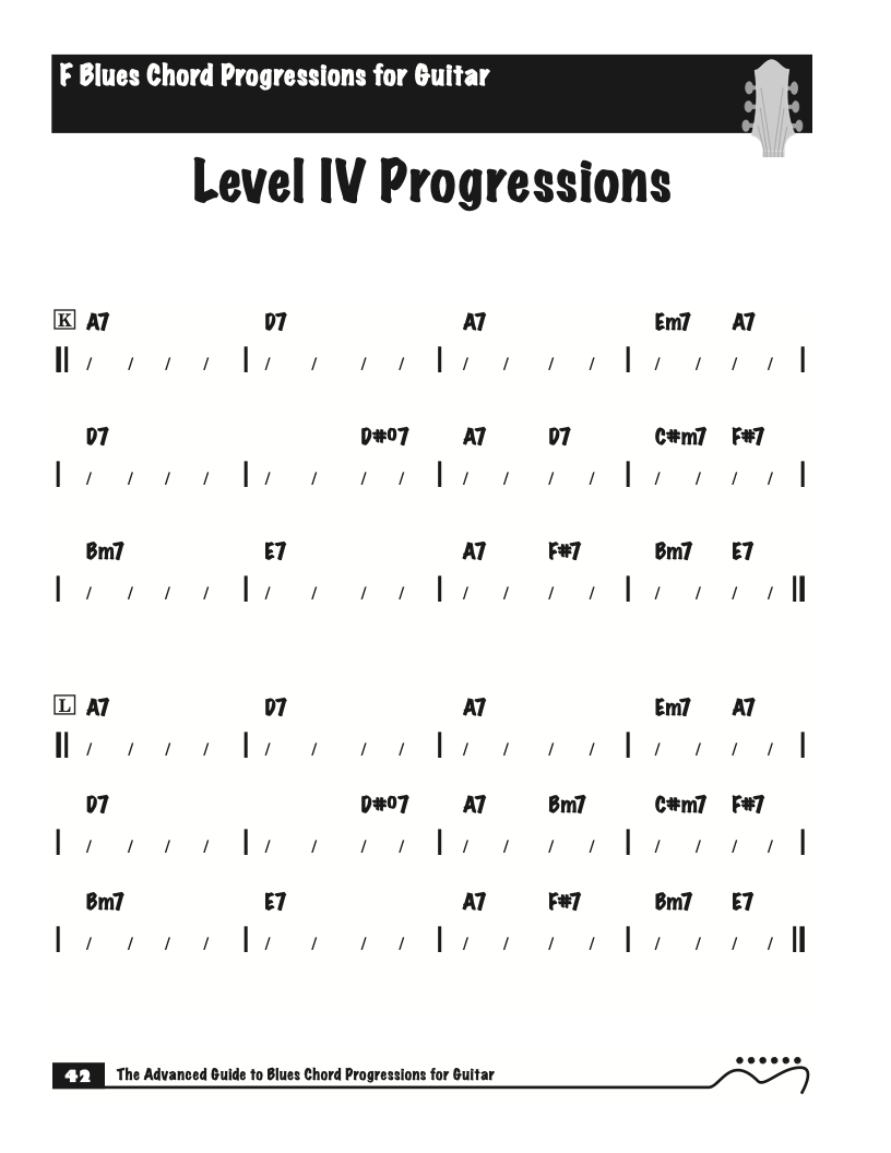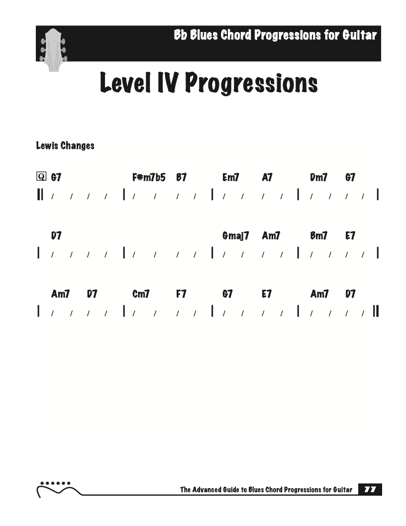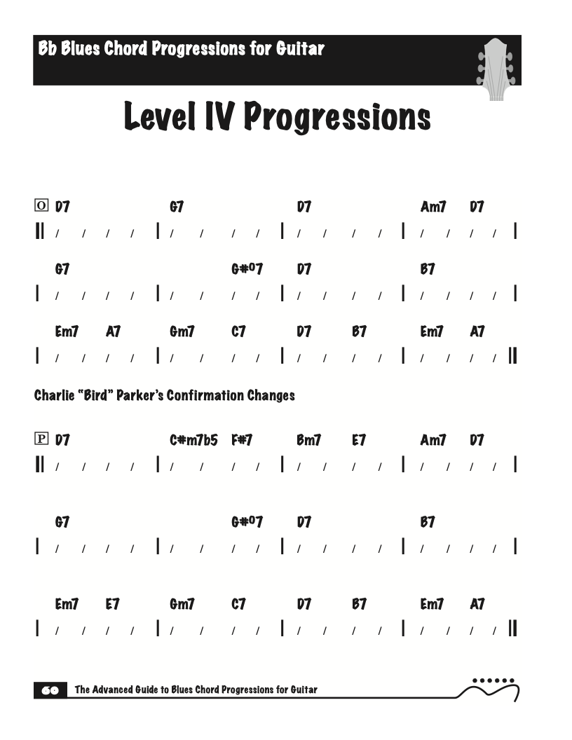 Each volume of The Advanced Guide to Blues Progressions for Guitar features basic to advanced blues chord progressions. to be used with the chord voicings from volume I , II , & III of The Advanced Guide to Guitar Chords.