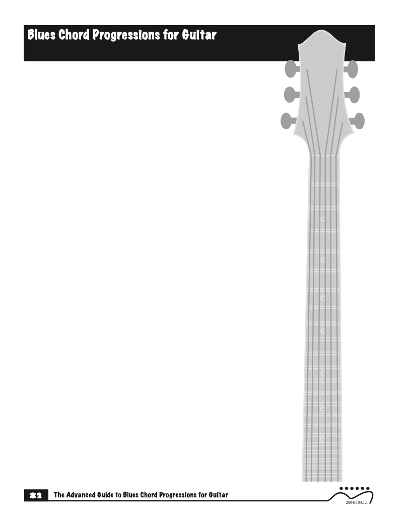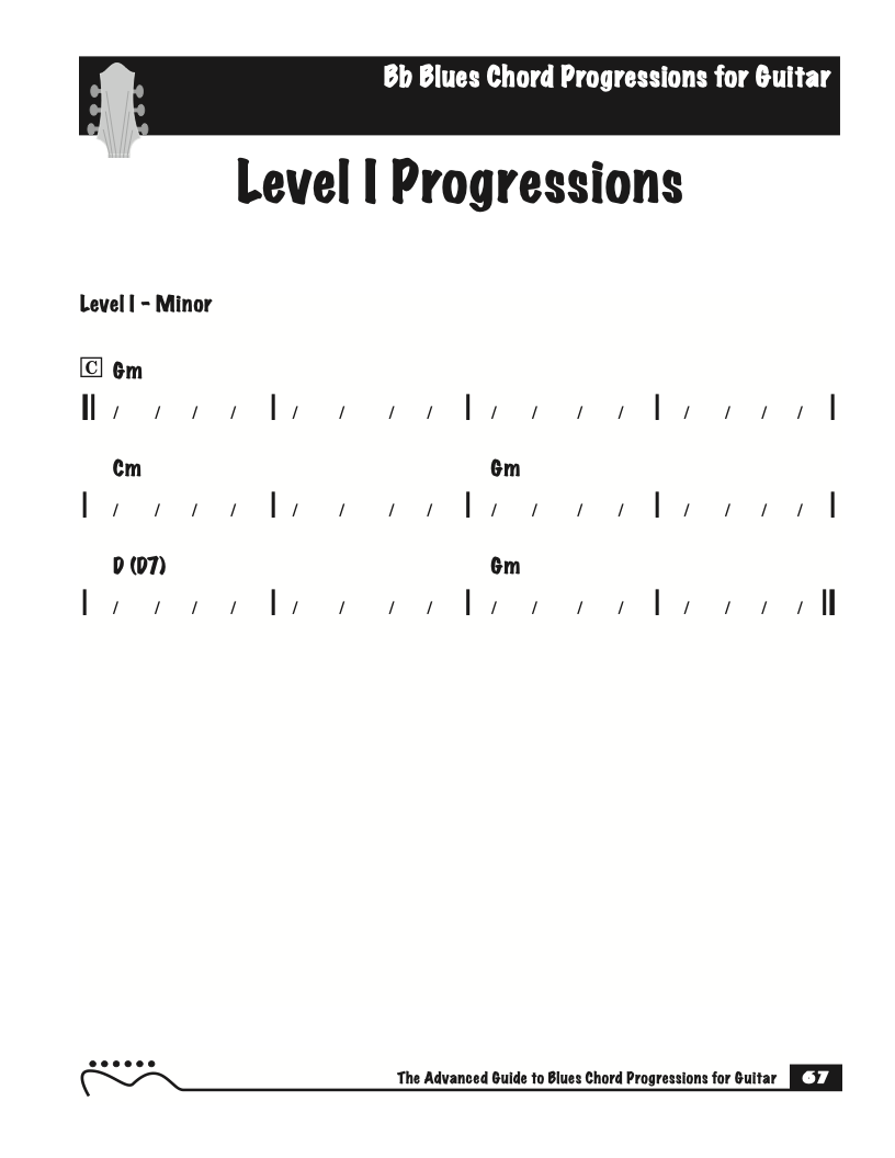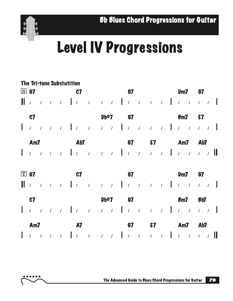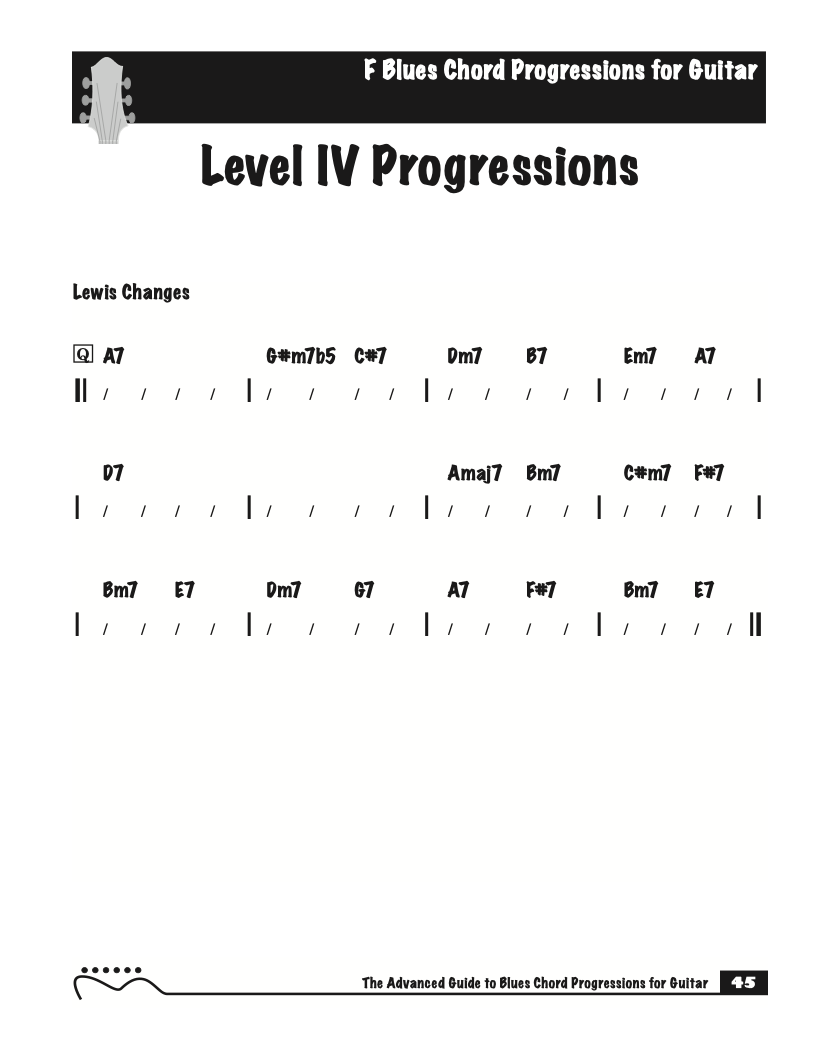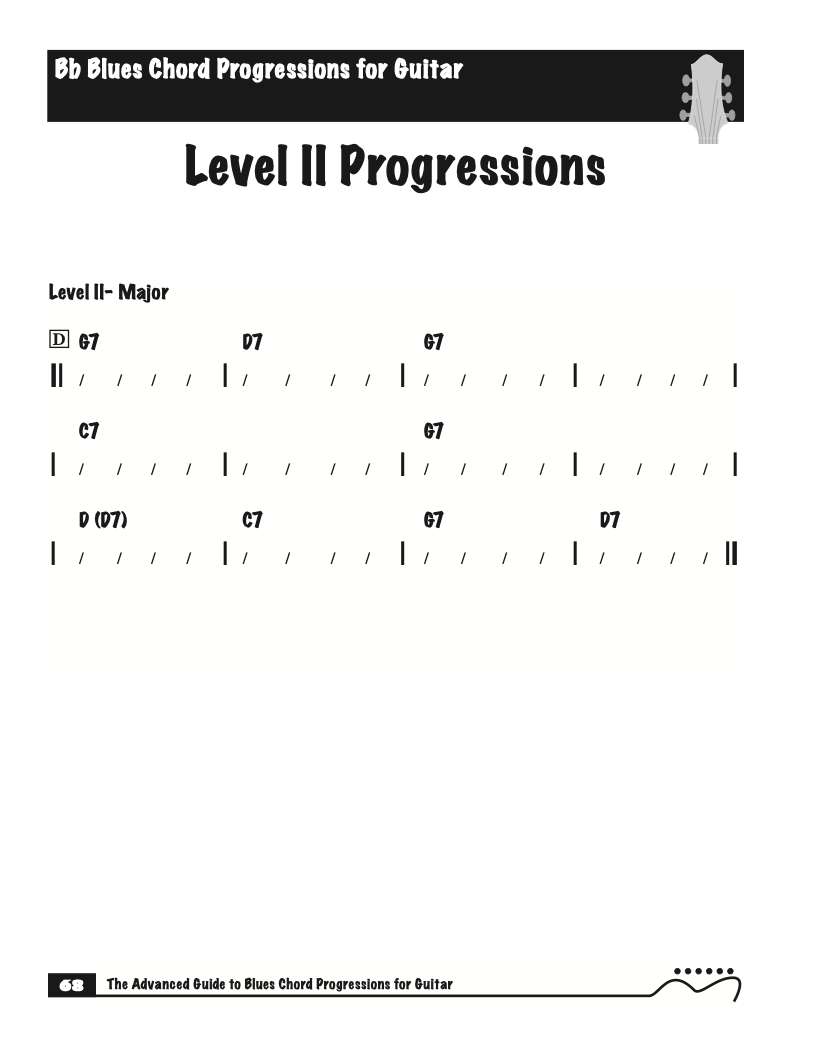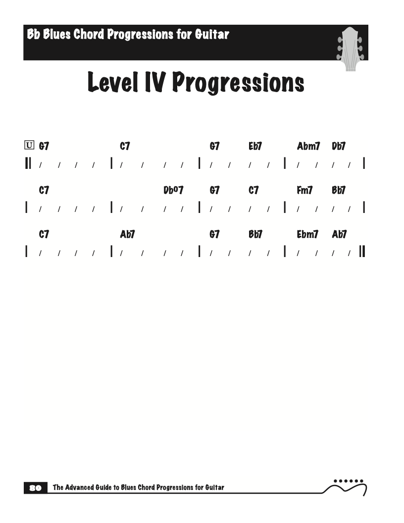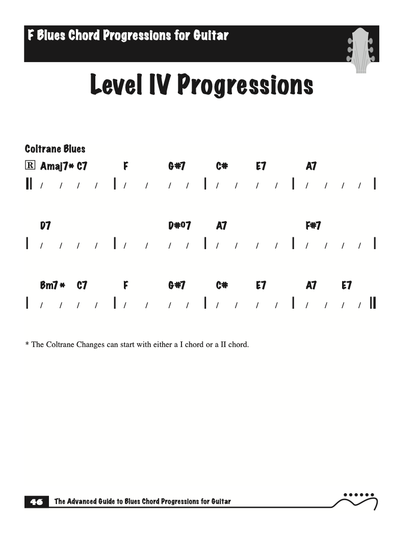 Each volume of The Advanced Guide to Blues Progressions for Guitar features basic to advanced blues chord progressions. to be used with the chord voicings from volume I , II , & III of The Advanced Guide to Guitar Chords.