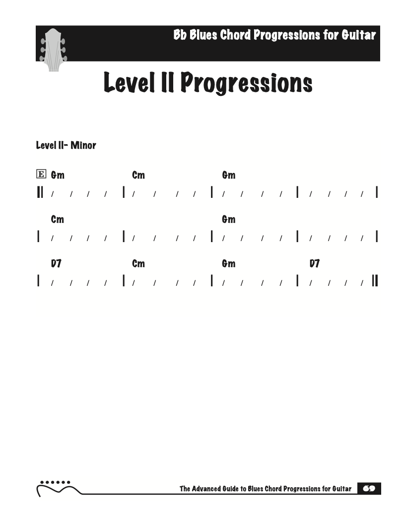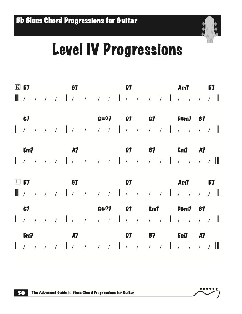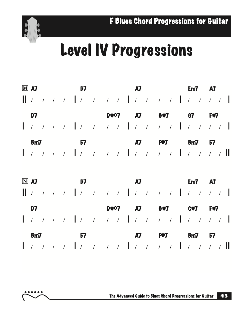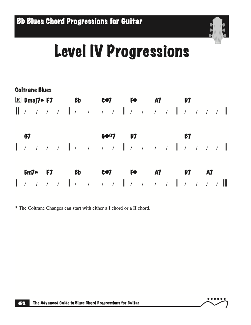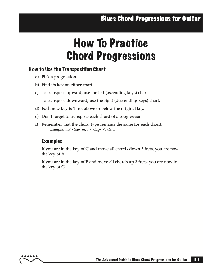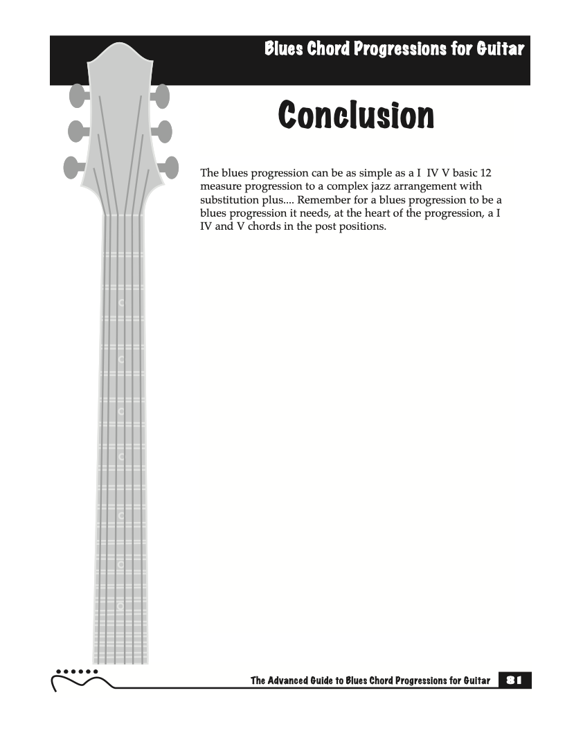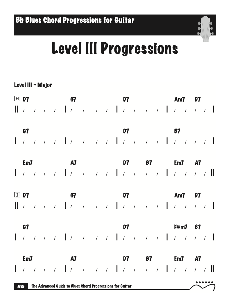 Each volume of The Advanced Guide to Blues Progressions for Guitar features basic to advanced blues chord progressions. to be used with the chord voicings from volume I , II , & III of The Advanced Guide to Guitar Chords.
