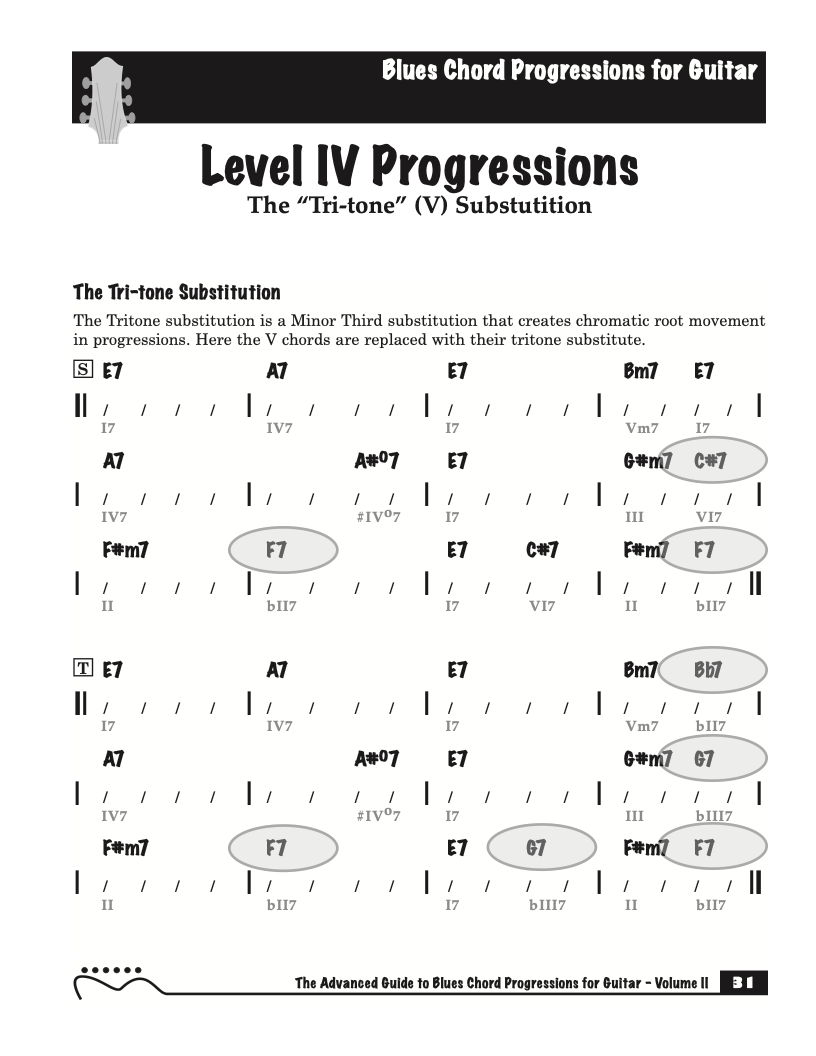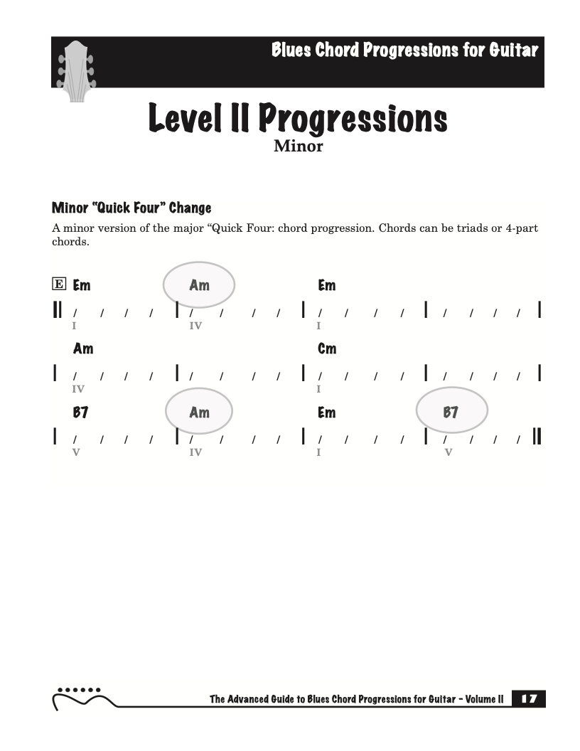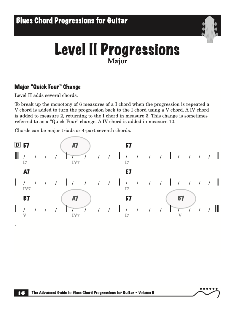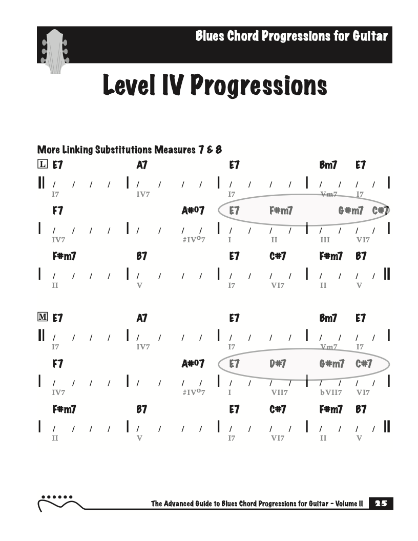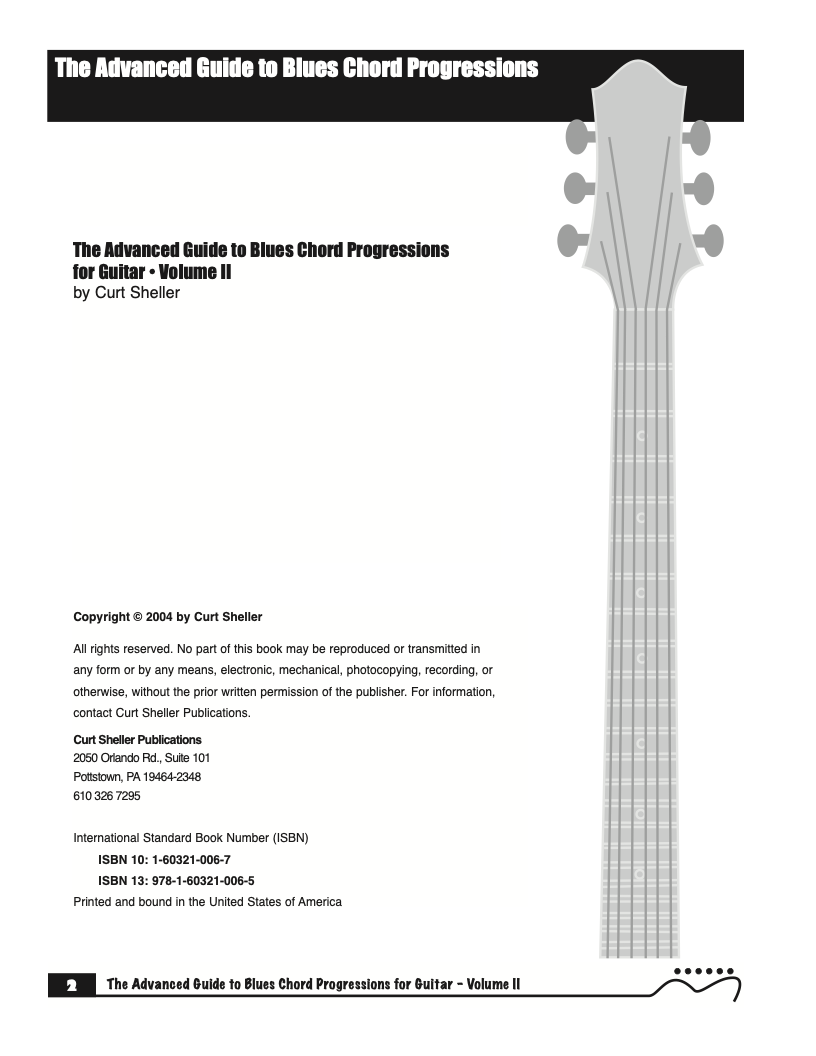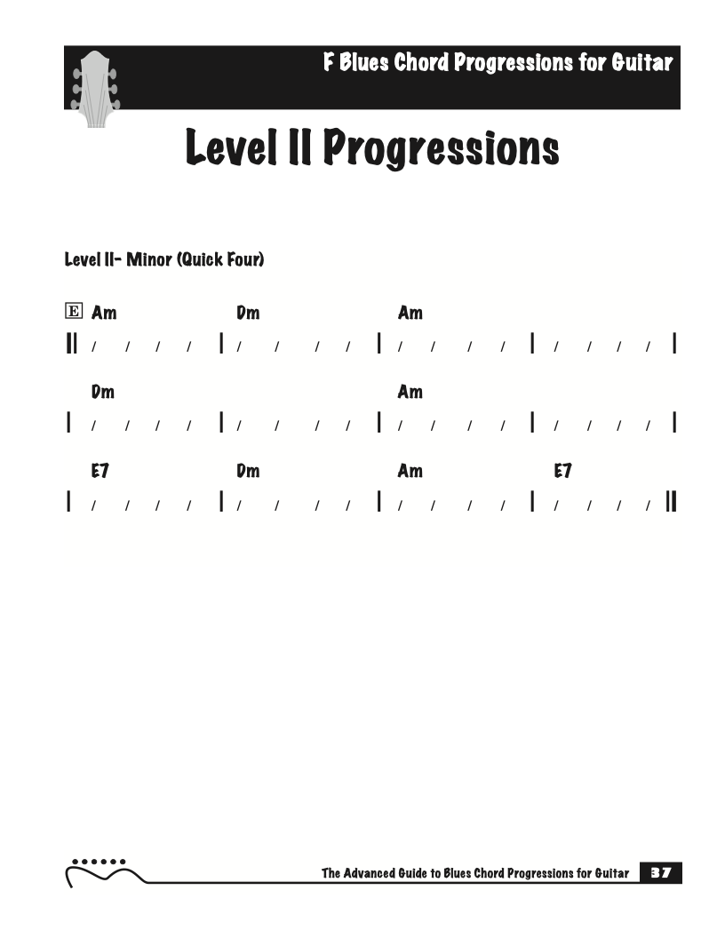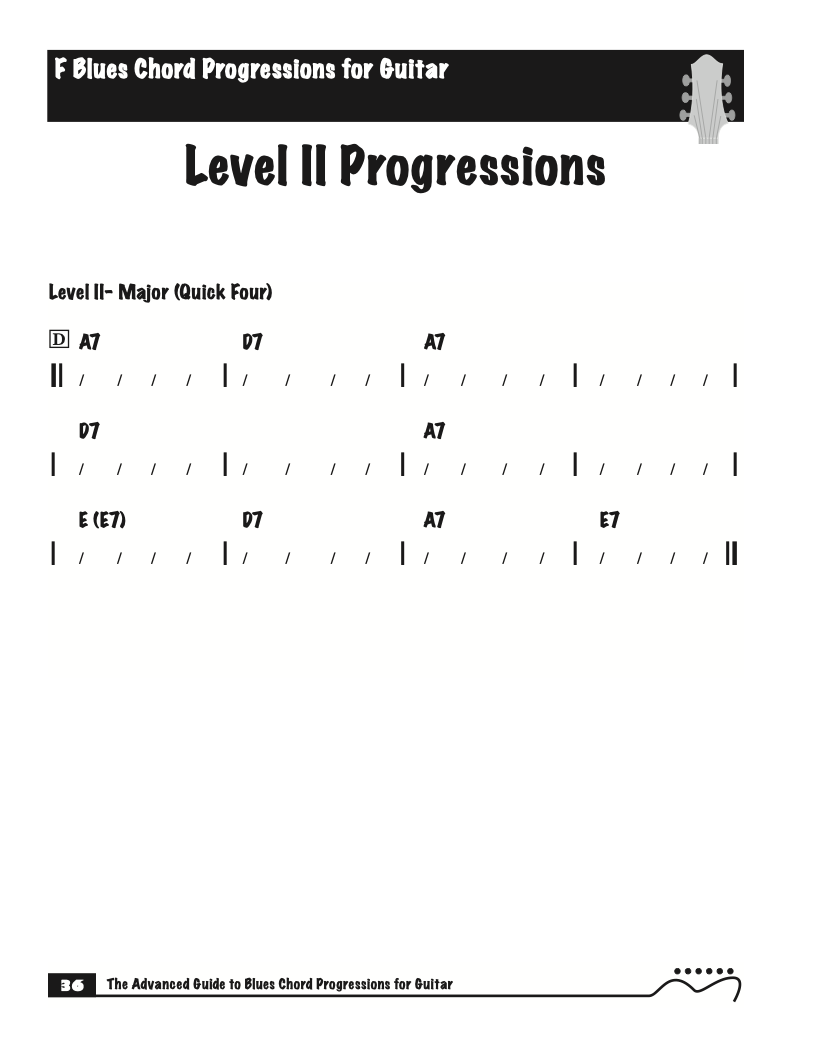 Each volume of The Advanced Guide to Blues Progressions for Guitar features basic to advanced blues chord progressions. to be used with the chord voicings from volume I , II , & III of The Advanced Guide to Guitar Chords.