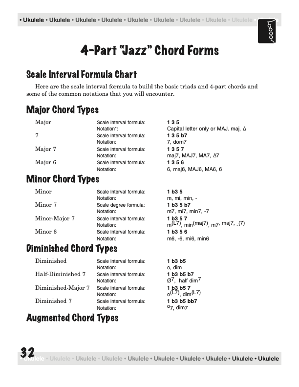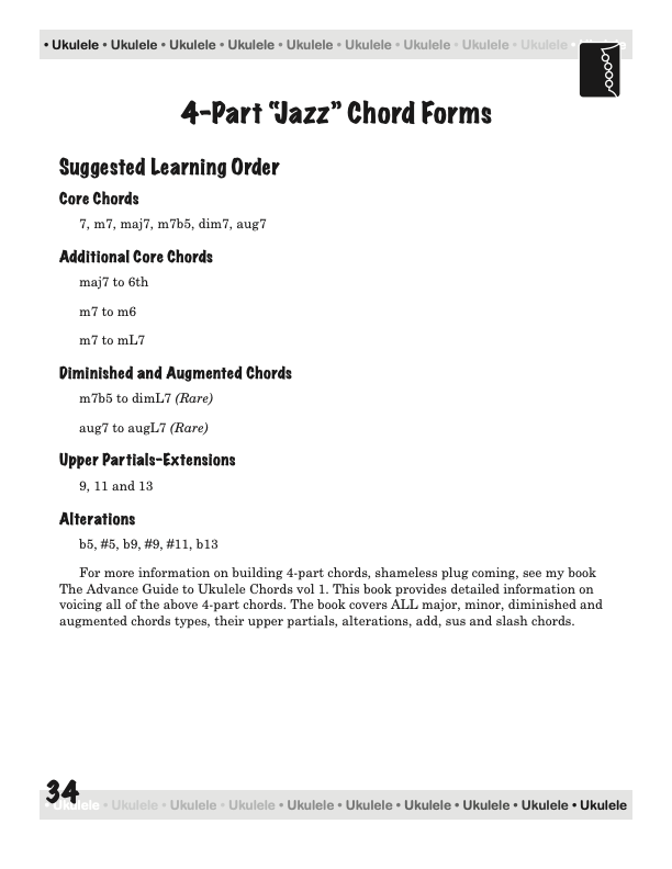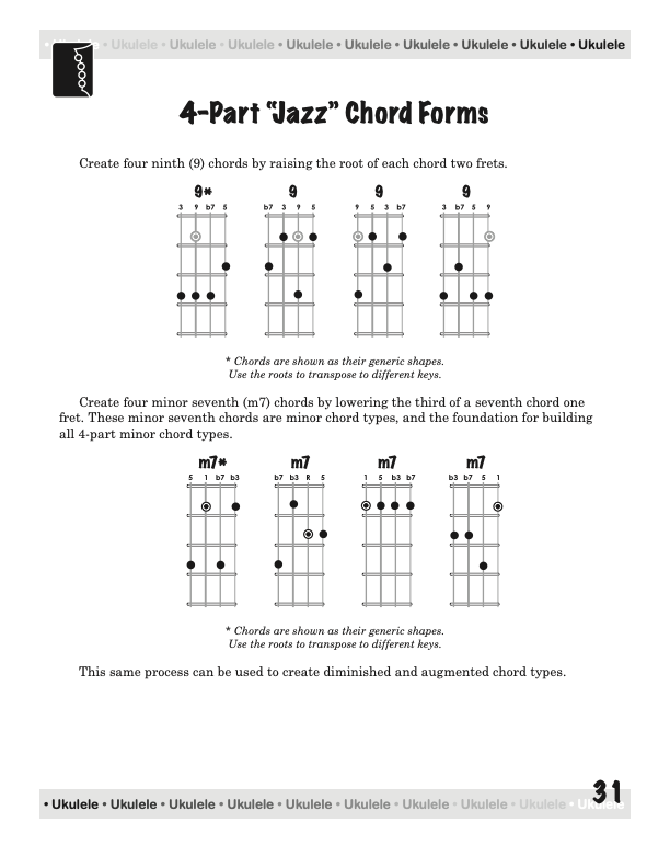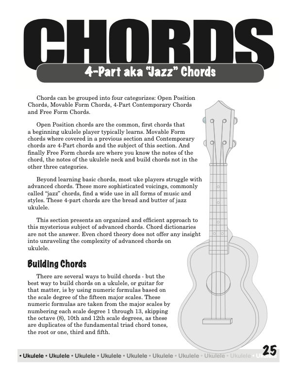 After playing jazz guitar for 20 years, I rediscovered the ukulele. Then I learned that ukulele players struggle (like guitar players) with movable chord forms and the more advanced chords, commonly called “jazz” chords. There was no clear, concise, organized book for guiding an aspiring ukulele player through this maze of chords, so I decided to write one.