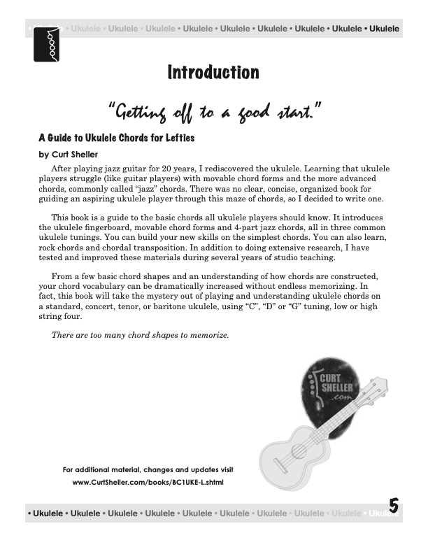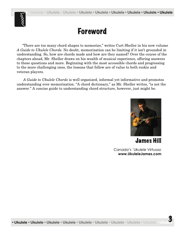 “There are too many chord shapes to memorize,” writes Curt Sheller in his new volume A Guide to Ukulele Chords. No doubt, memorization can be limiting if it isn’t grounded in understanding. So, how are chords made and how are they named? Over the course of the chapters ahead, Mr. Sheller draws on his wealth of musical experience, offering answers to these questions and more. Beginning with the most accessible chords and progressing to the more challenging ones, the lessons that follow are of value to both rookie and veteran players.