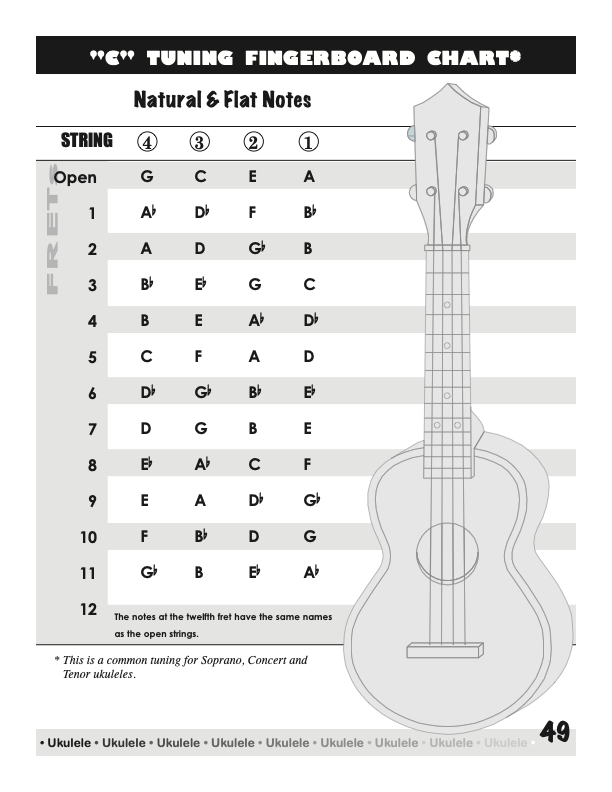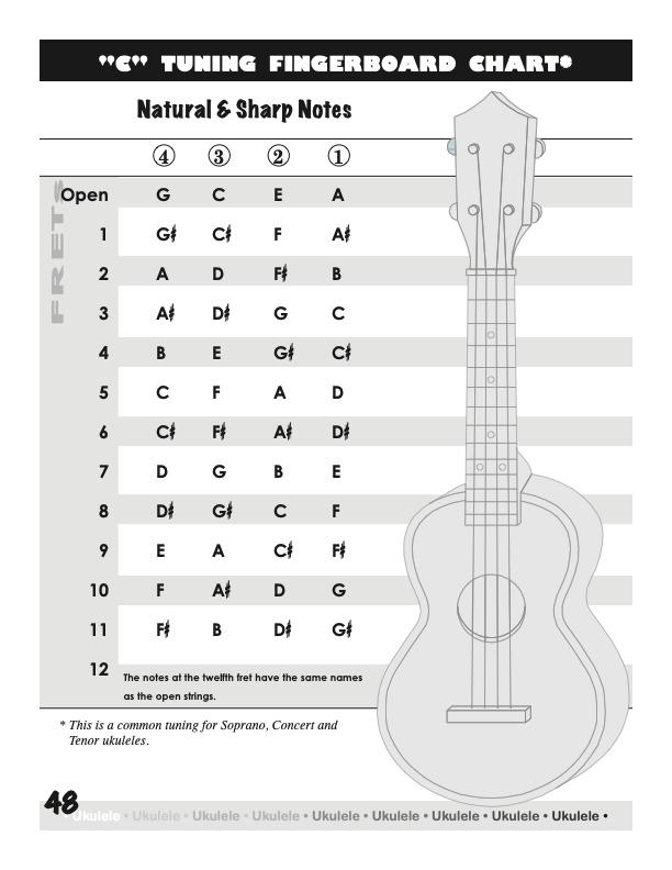 Ukulele Fingerboard Chart for C Tuning, Low or High G – G C E A