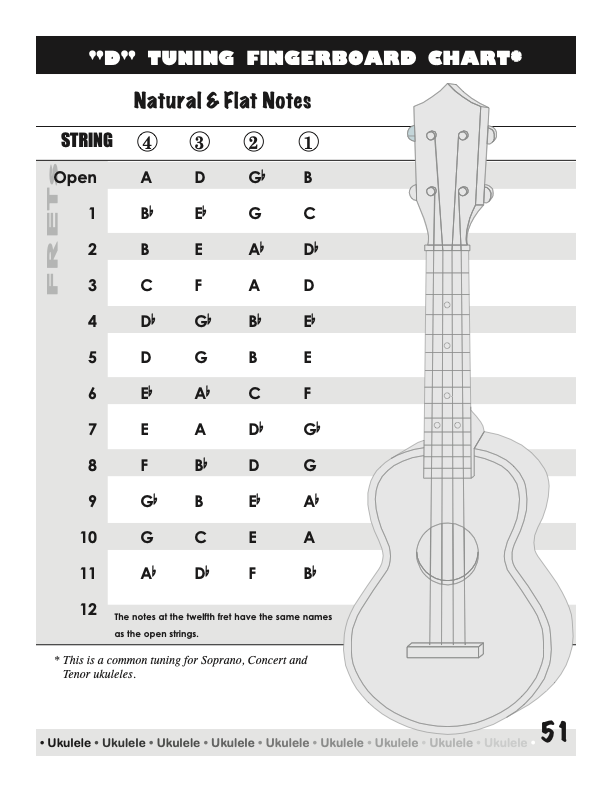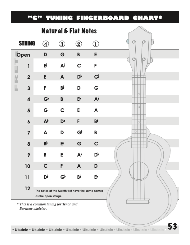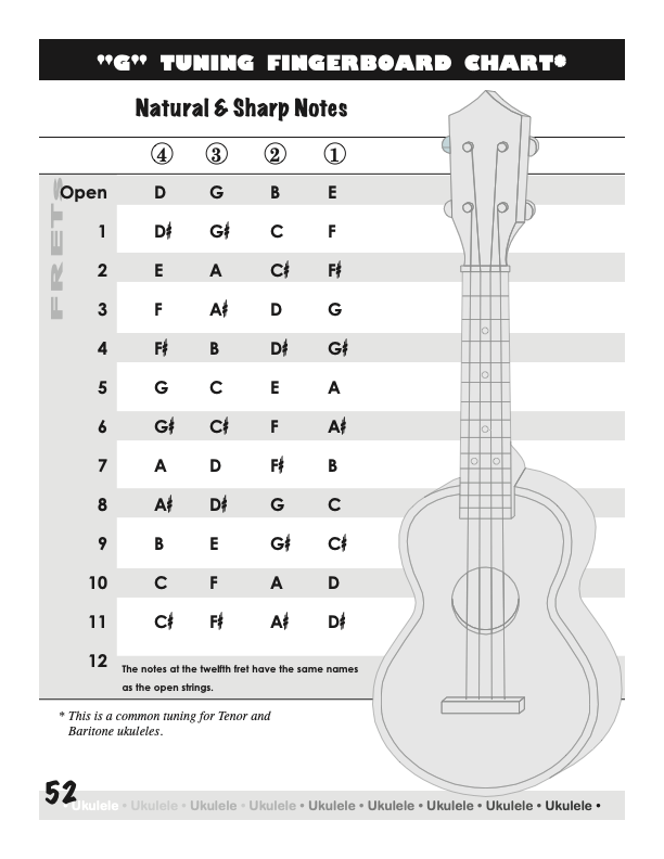 Ukulele Fingerboard Chart for G Tuning, Low or High A – D G B E