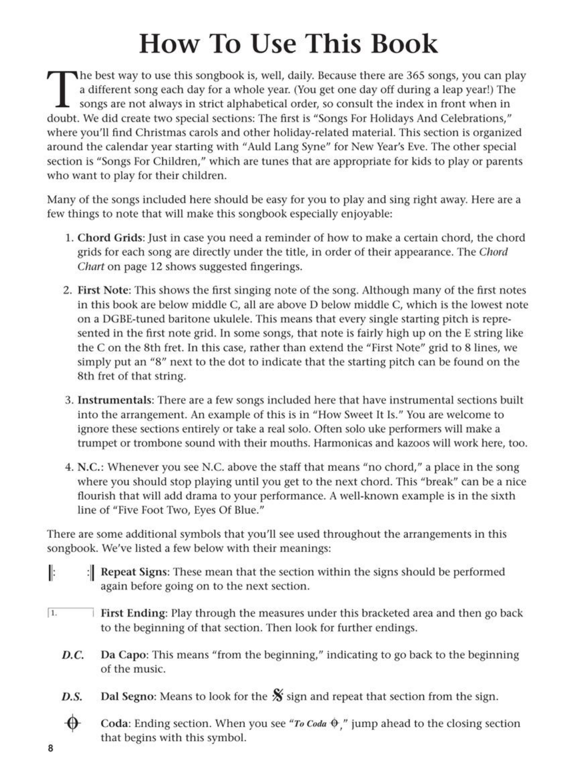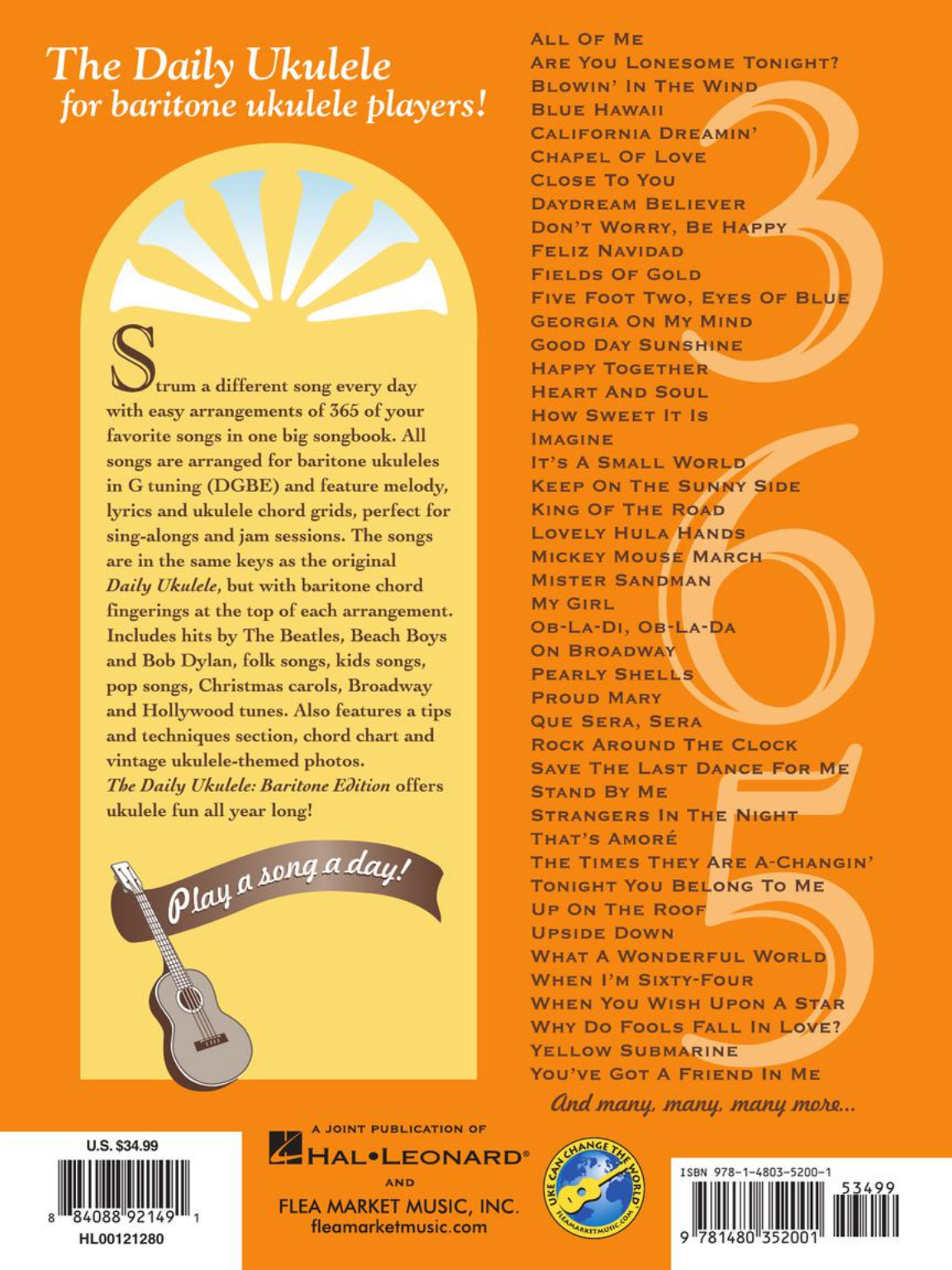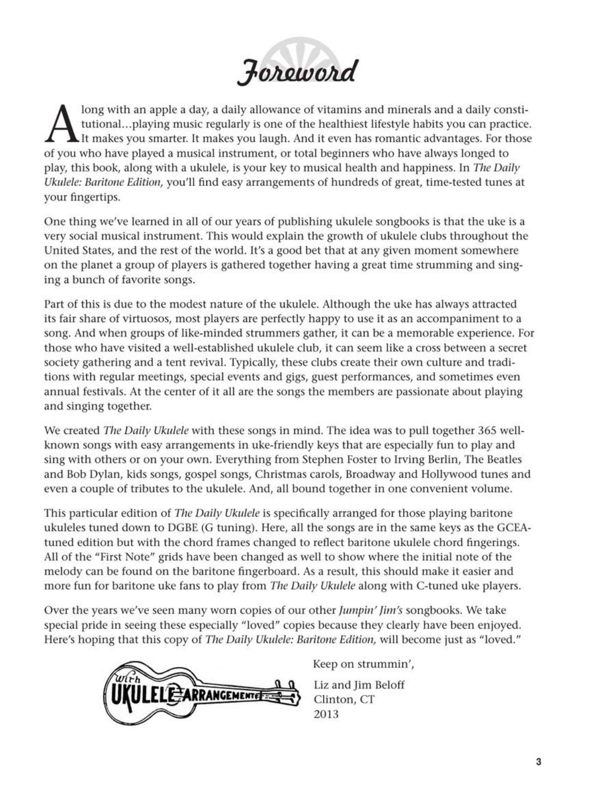 Now baritone ukulele players can have fun every day, too! Strum a different song every day with easy arrangements of 365 of your favorite songs in one big songbook! The Daily Ukulele features ukulele arrangements with melody, lyrics and uke chord grids and are in ukulele-friendly keys that are particularly suited for groups of one to one hundred to play and sing.