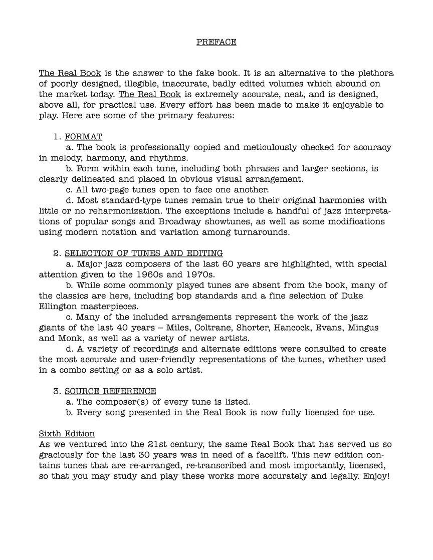 Hal Leonard is very proud to present the first legitimate and legal editions of these books ever produced. You won't even notice the difference, other than that all of the notorious errors have been fixed: the covers and typeface look the same, the song list is nearly identical, and the price for our edition is even cheaper than the original! Every conscientious musician will appreciate that these books are now produced accurately and ethically, benefiting the songwriters that we owe for some of the greatest tunes of all time! Includes 400 songs: All Blues • Au Privave • Autumn Leaves • Black Orpheus • Bluesette • Body and Soul • Bright Size Life • Con Alma • Dolphin Dance • Don't Get Around Much Anymore • Easy Living • Epistrophy • Falling in Love with Love • Footprints • Four on Six • Giant Steps • Have You Met Miss Jones? • How High the Moon • I'll Remember April • Impressions • Lullaby of Birdland • Misty • My Funny Valentine • Oleo • Red Clay • Satin Doll • Sidewinder • Stella by Starlight • Take Five • There Is No Greater Love • Wave • and hundreds more! Editions also available in B-flat, E-flat, and Bass Clef.