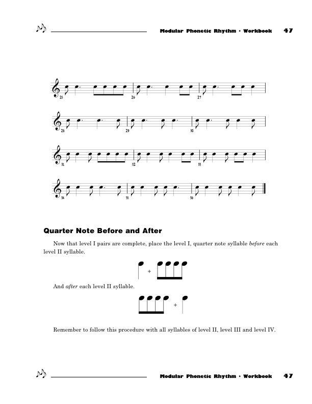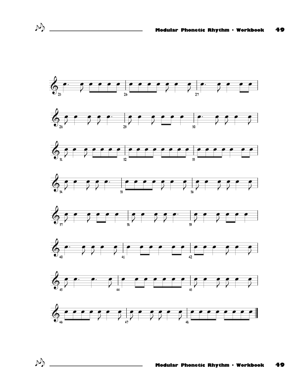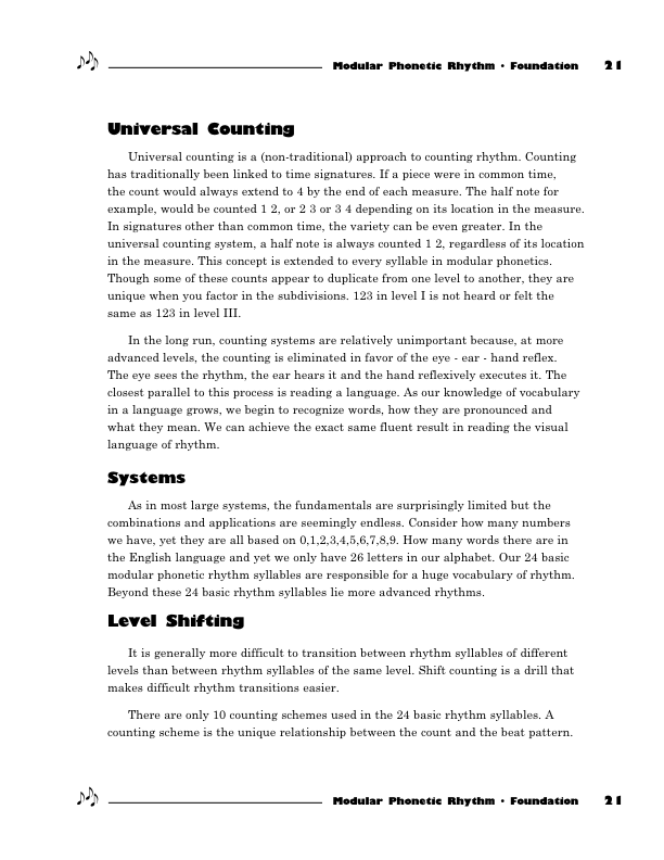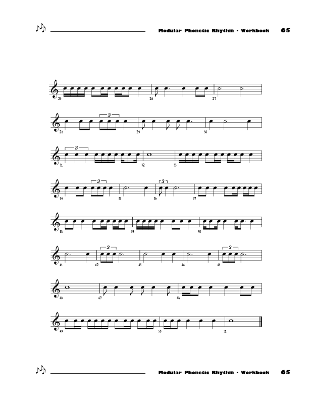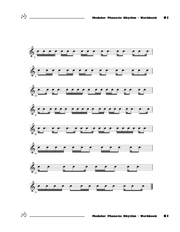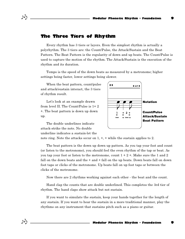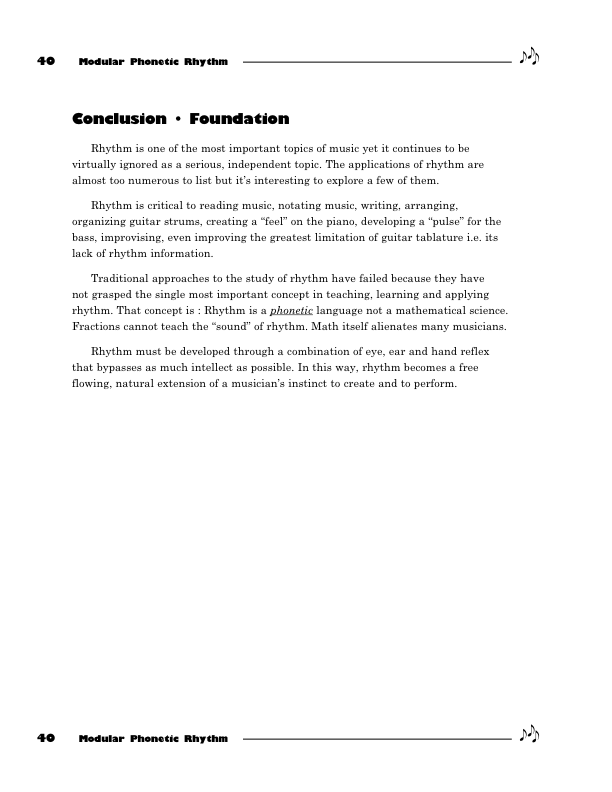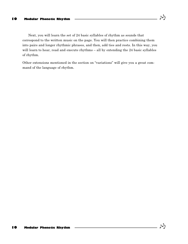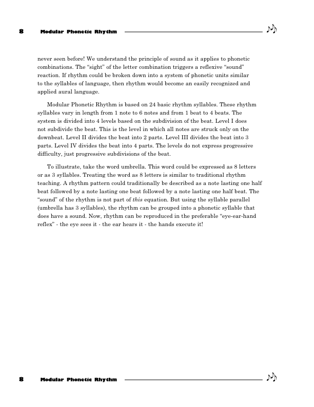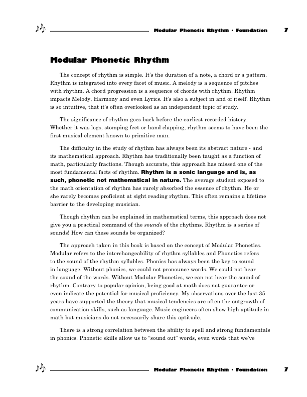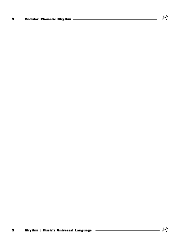 Modular Phonetic Rhythm represents a significant advance in the teaching and application of rhythm. Eliminating many inefficient aspects of rhythm education, Modular Phonetic Rhythm streamlines the traditional educational approach, resulting in a reflexive reaction to rhythm.