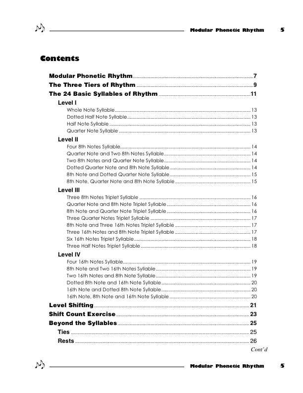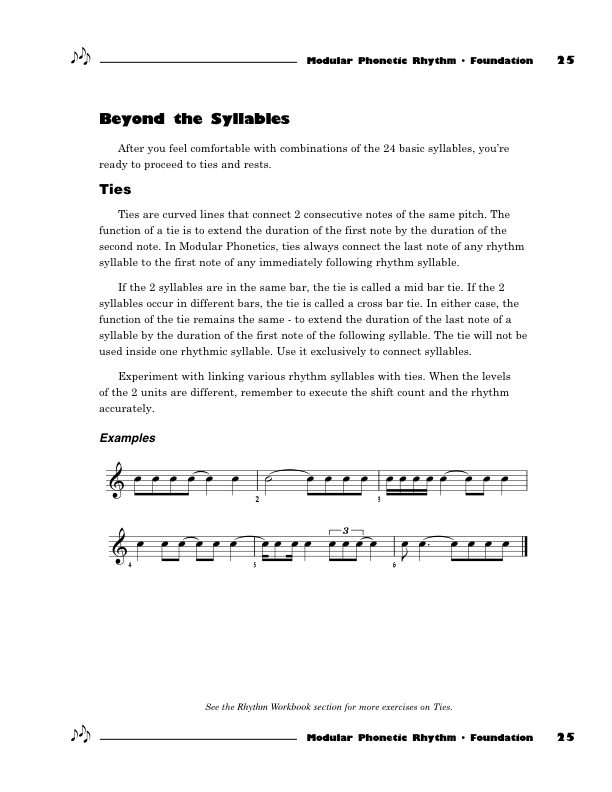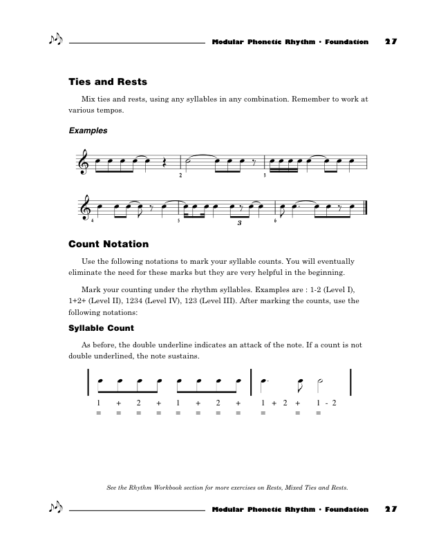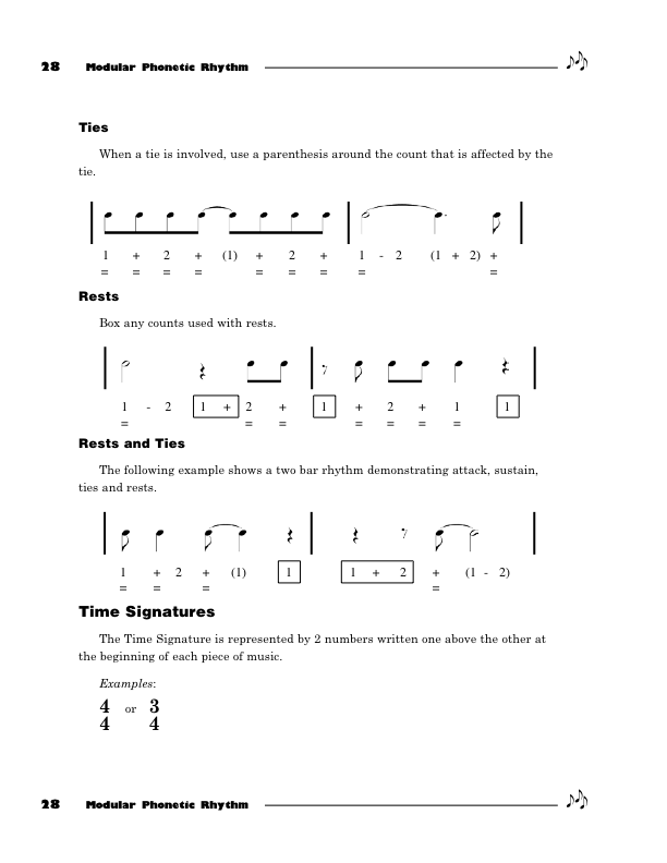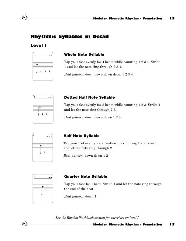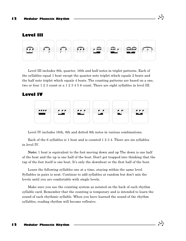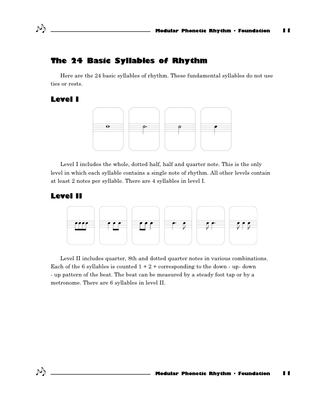 Modular Phonetic Rhythm is based on 26 basic rhythm syllables. These rhythm syllables vary from 1 note to 6 notes and from 1 beat to 4 beats. It is divided into 4 levels based on the subdivision of the beat. Ties and rests are approached as extensions or displacements respectively.