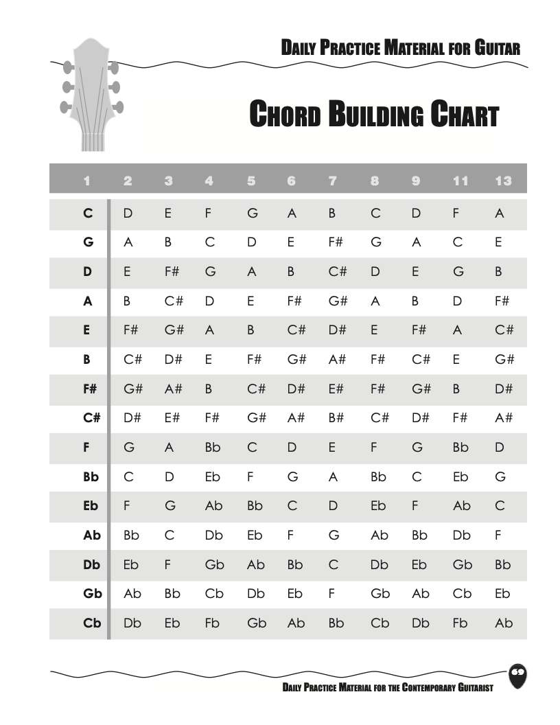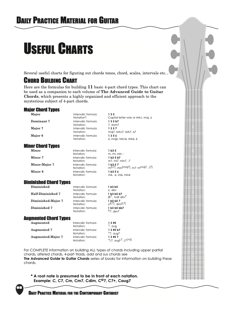Chords can be categorized into four basic chord types; Major, Minor, Diminished and Augmented. Here are the formulas for building the 11 basic 4-part chord types as well as the traditional triads. This chart can be used as a companion to any volume of The Advanced Guide to Guitar Chords and A Guide to Advanced Chords for Ukulele, which presents a highly organized and efficient approach to the mysterious subject of 4-part chords.