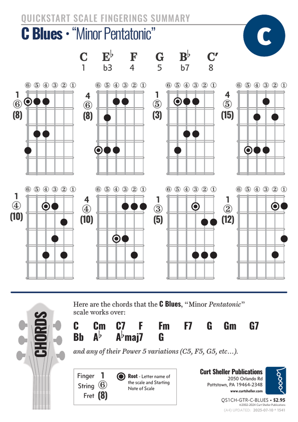 QuickStart Scale Fingerings Summary for Guitar: C Blues - "Minor Pentatonic" (C Eb F G Bb C') scale.