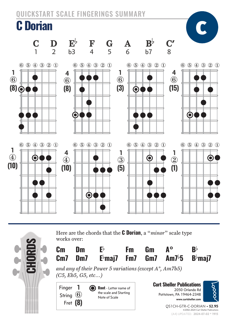 QuickStart Scale Fingerings Summary for Guitar: C Dorian - (C D Eb F G A Bb C') scale.