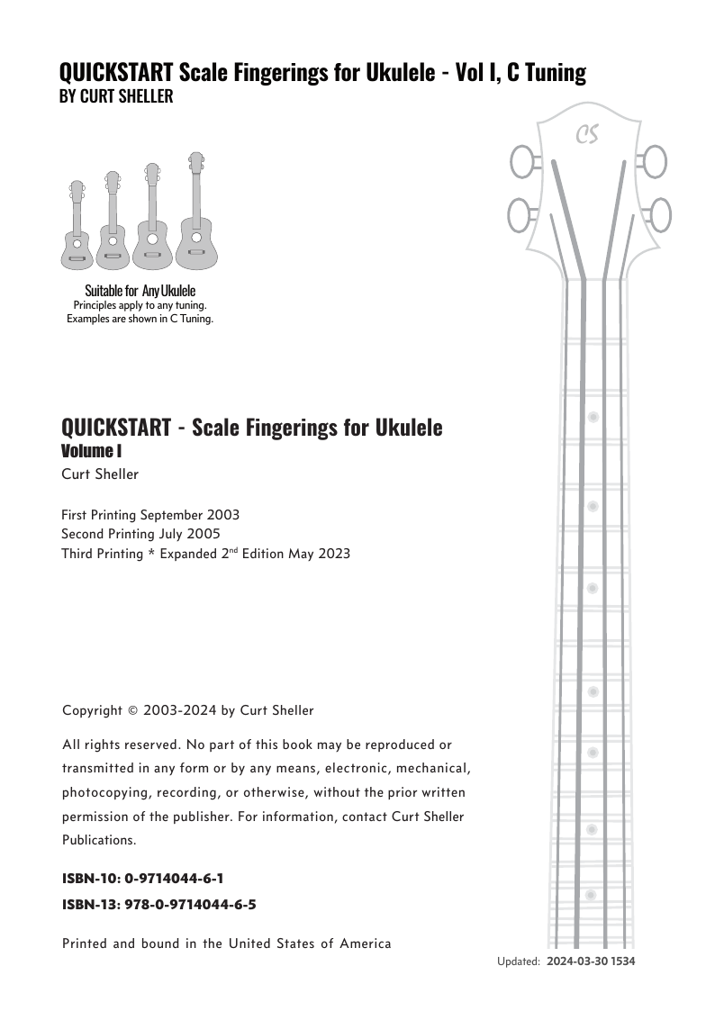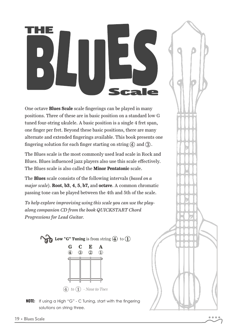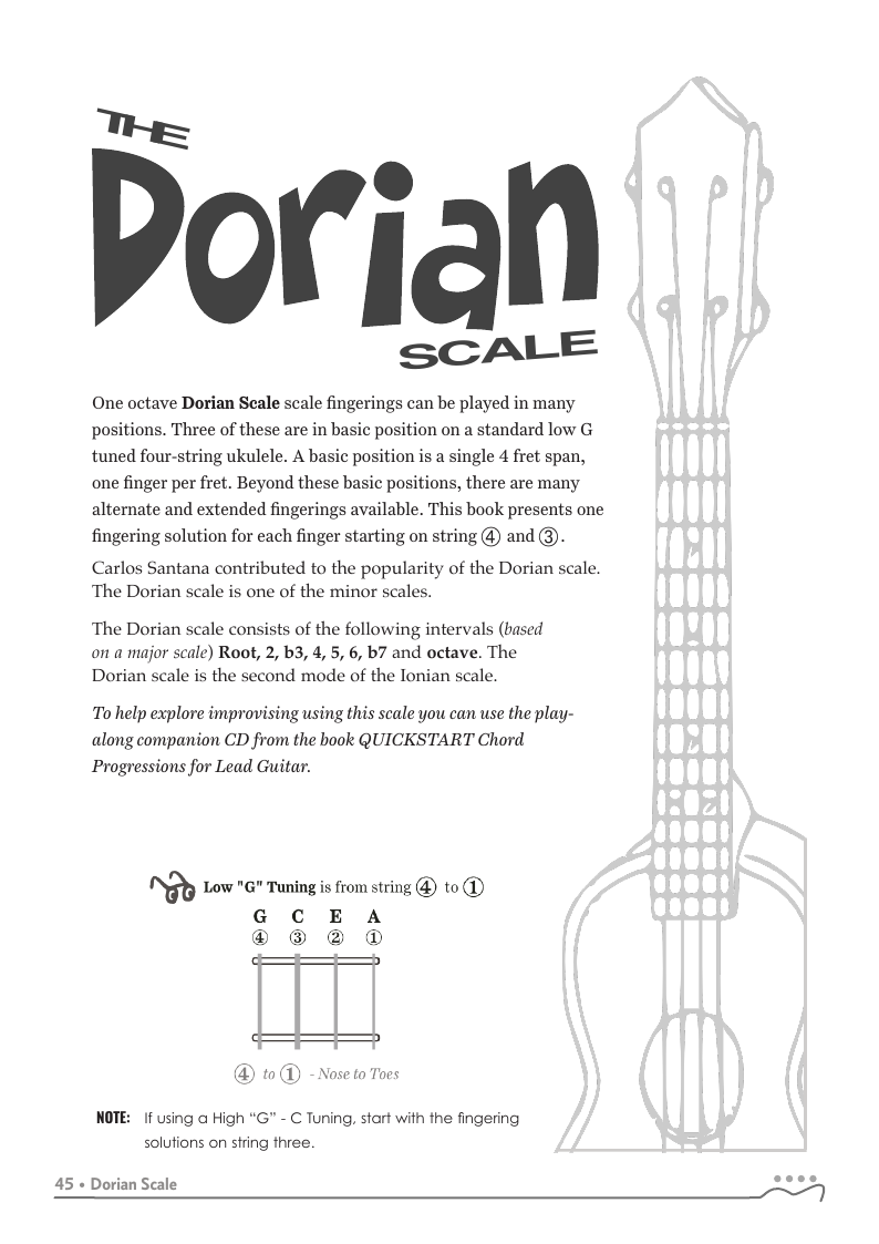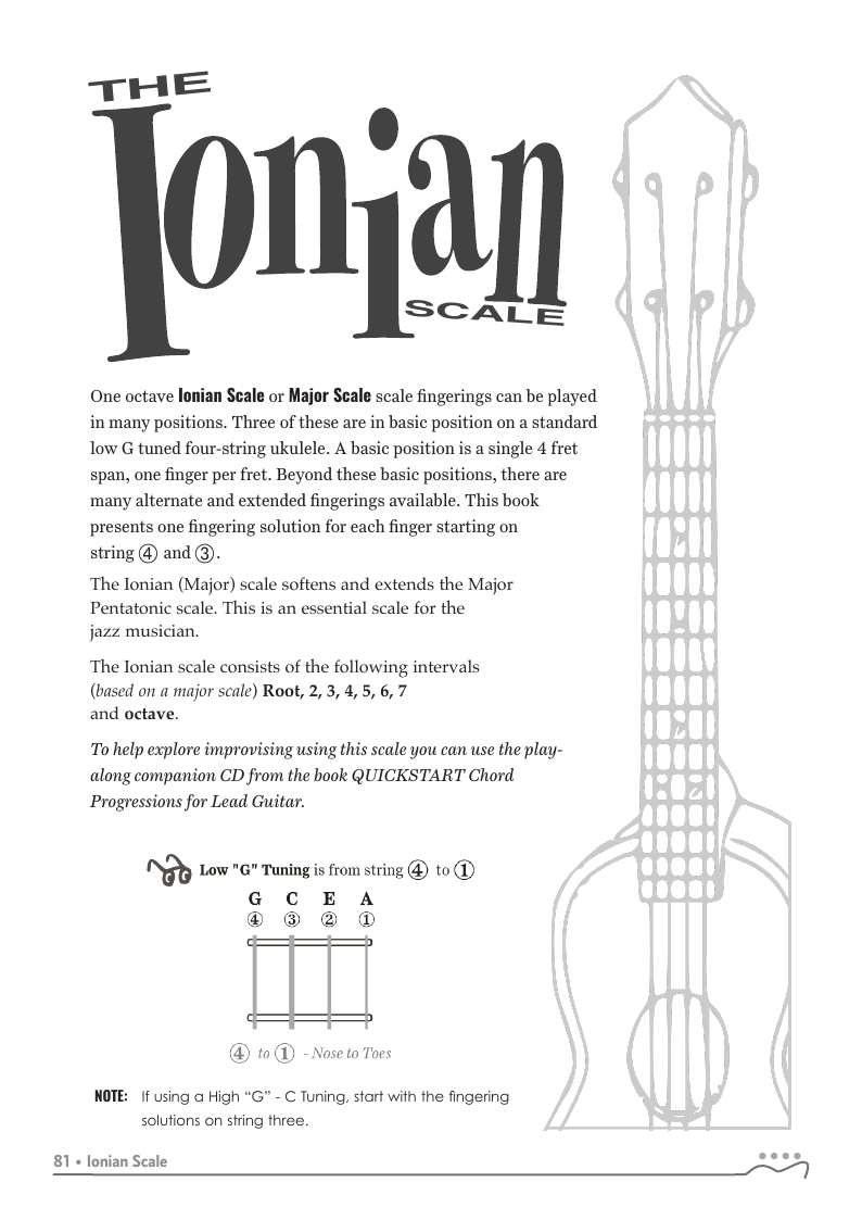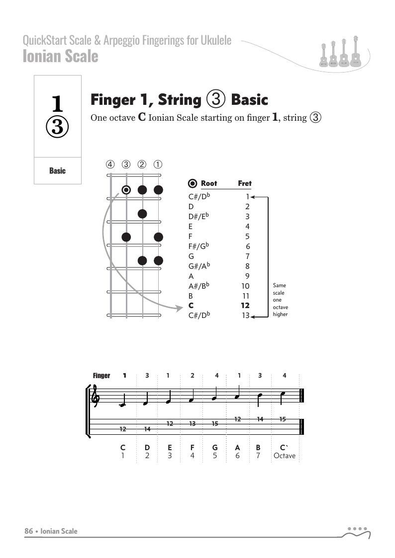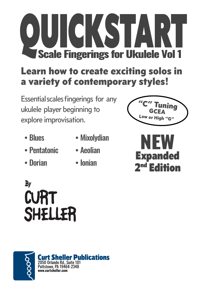 QUICKSTART - Scale Fingerings for Ukulele is a highly organized, efficient system of scale fingerings. Each fingering pattern is shown with a fingerboard shape, TAB and standard music notation. Related chords are also explained for each scale.