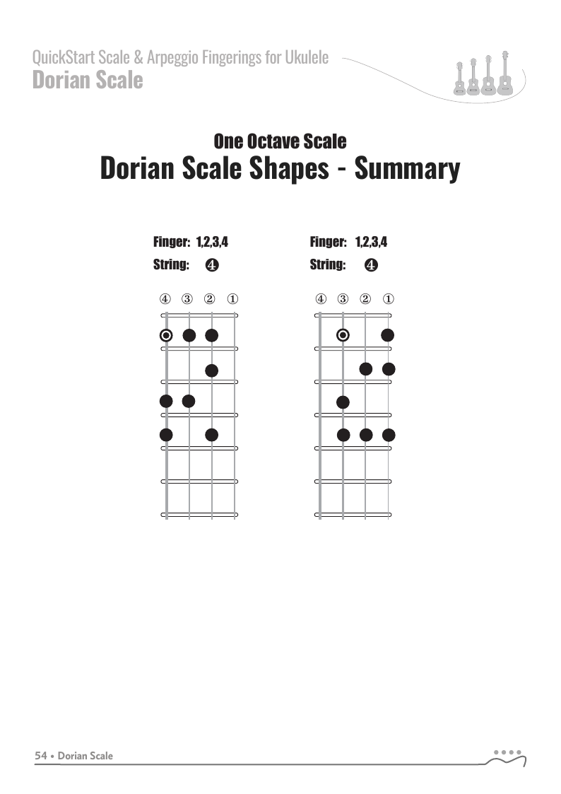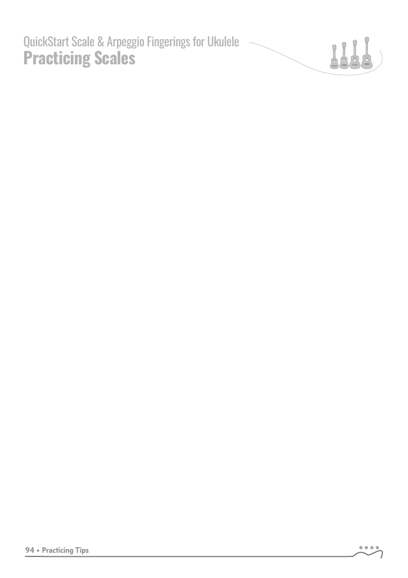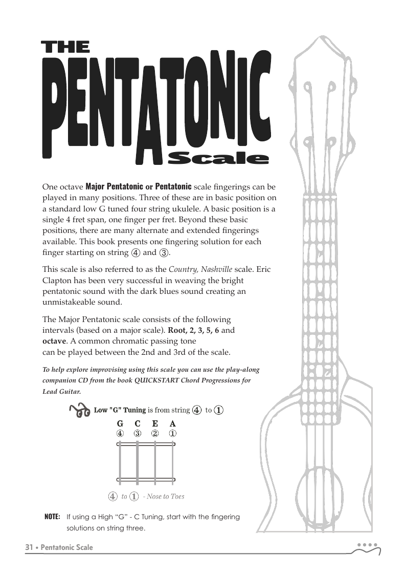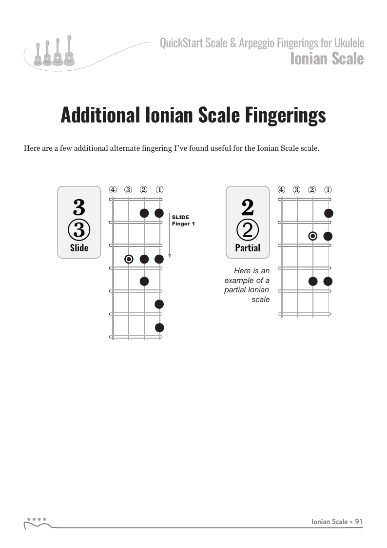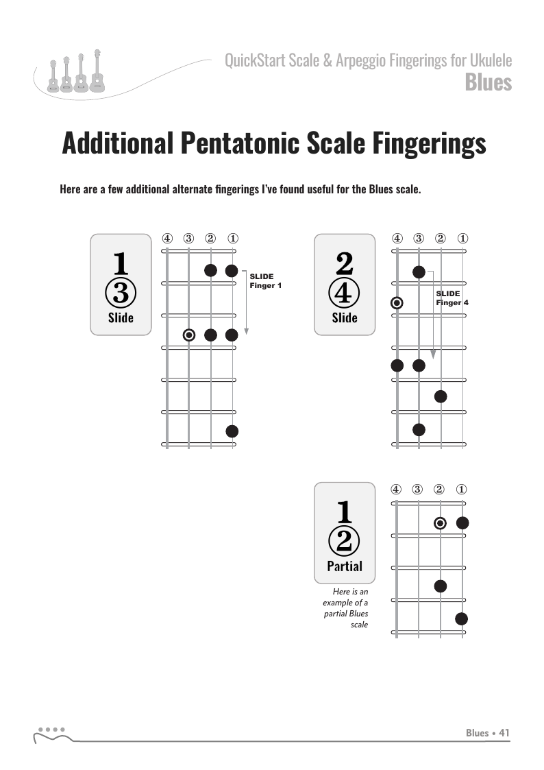 QUICKSTART - Scale Fingerings for Ukulele is a highly organized, efficient system of scale fingerings. Each fingering pattern is shown with a fingerboard shape, TAB and standard music notation. Related chords are also explained for each scale.