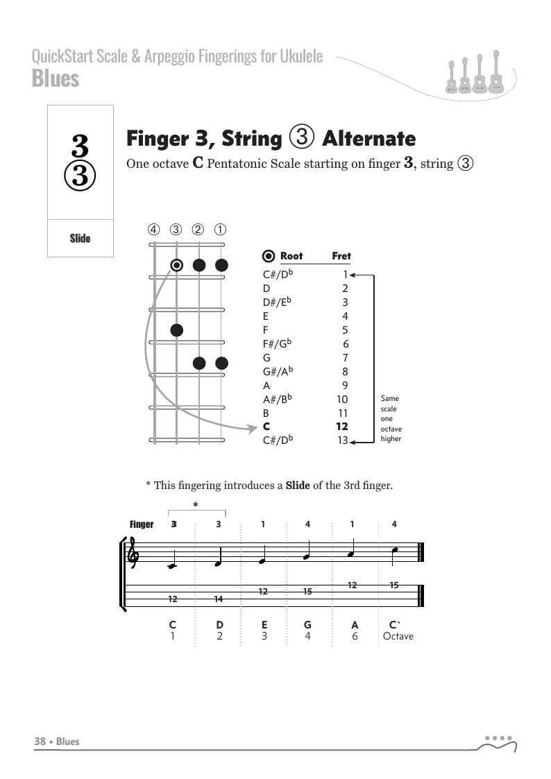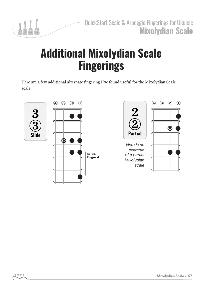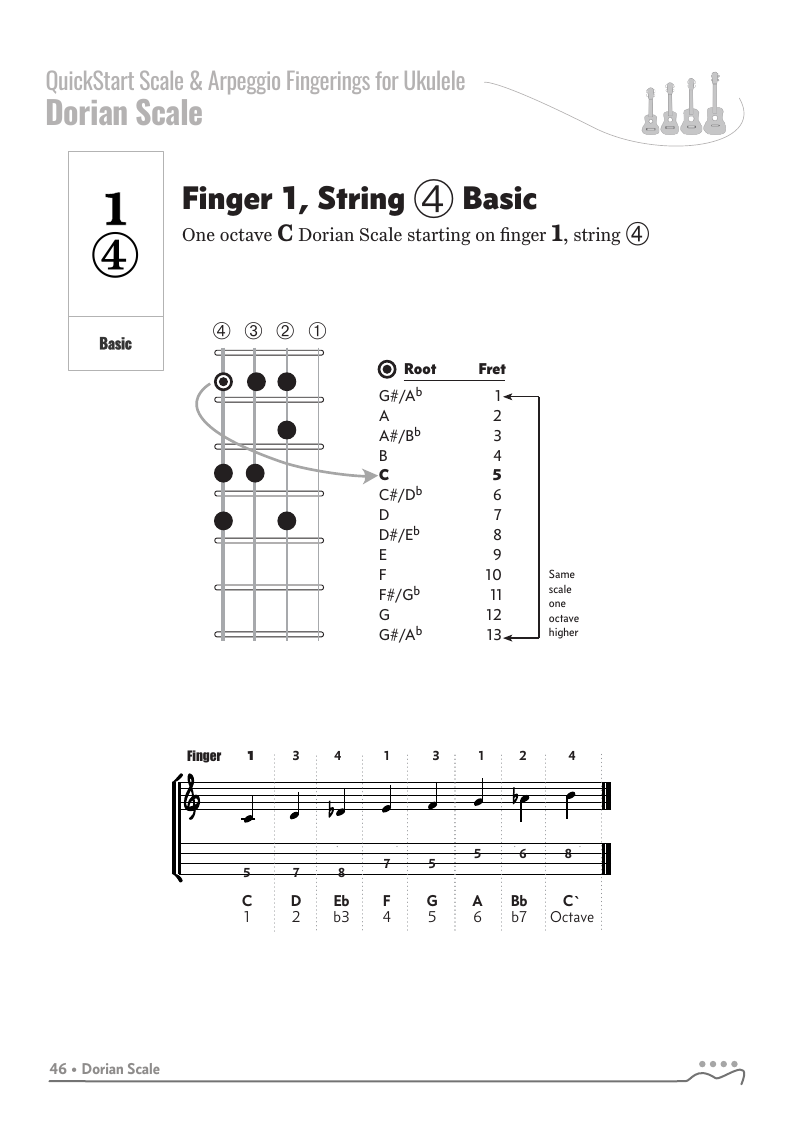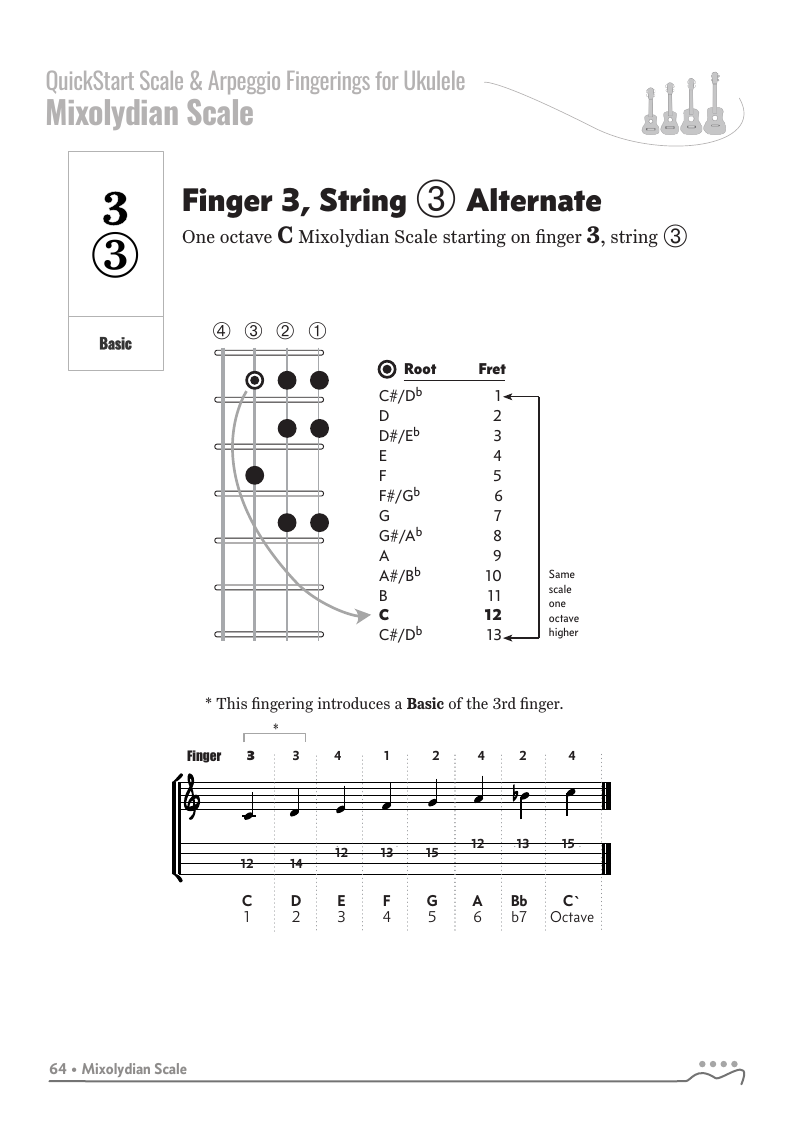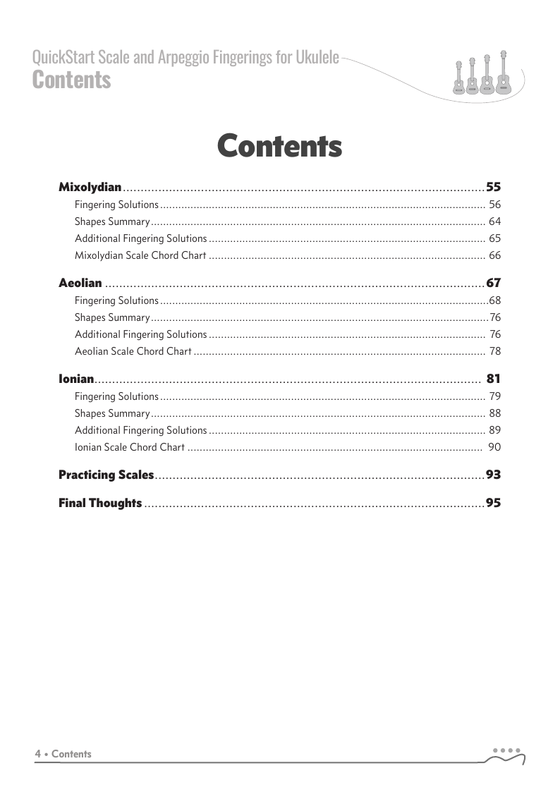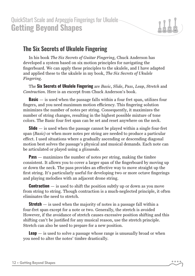 QUICKSTART - Scale Fingerings for Ukulele is a highly organized, efficient system of scale fingerings. Each fingering pattern is shown with a fingerboard shape, TAB and standard music notation. Related chords are also explained for each scale.