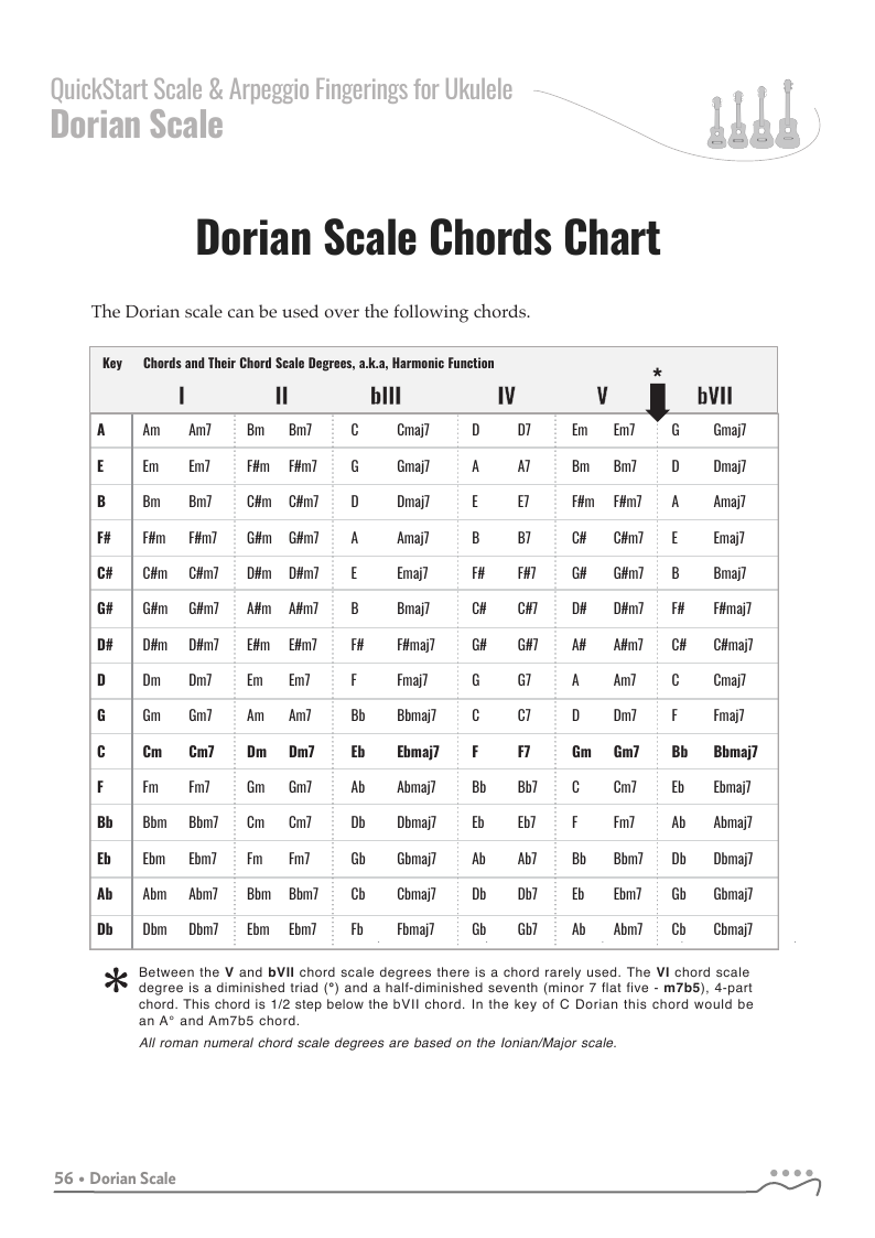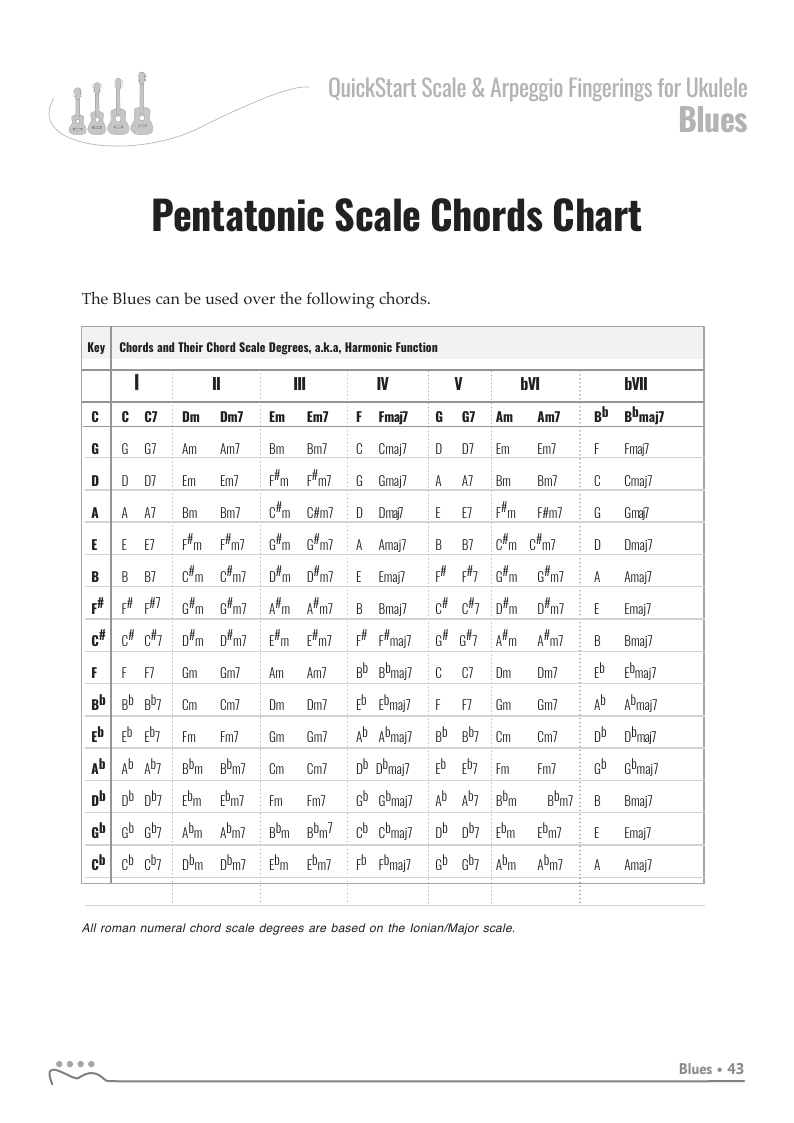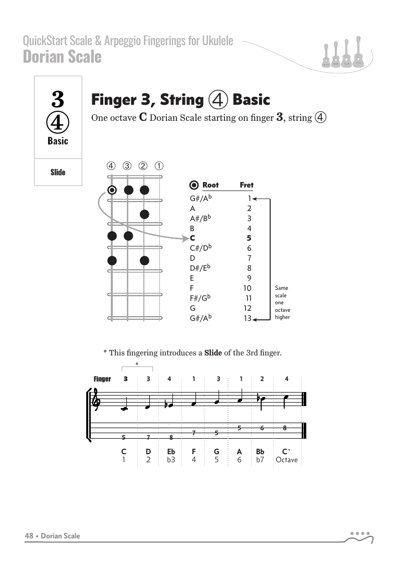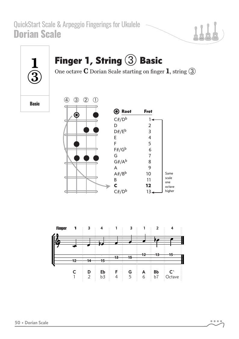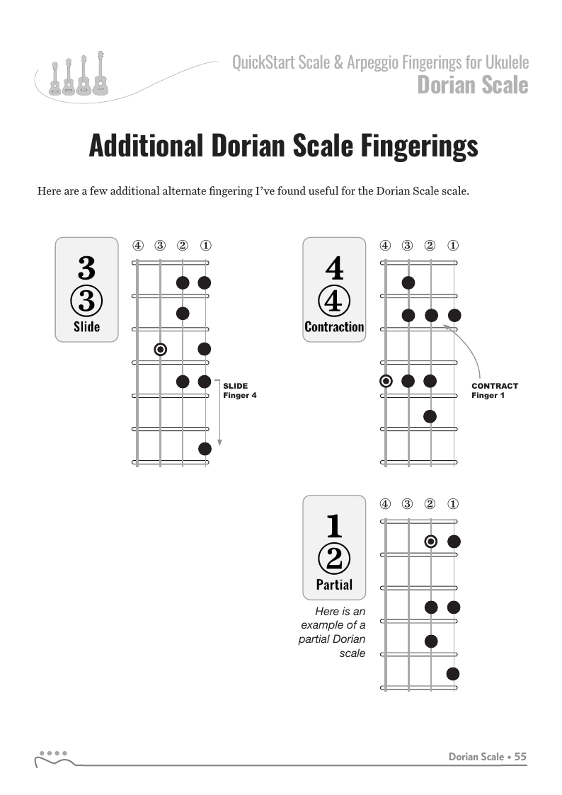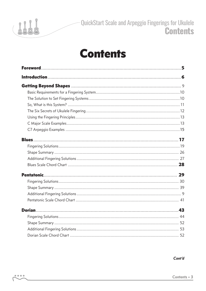 QUICKSTART - Scale Fingerings for Ukulele is a highly organized, efficient system of scale fingerings. Each fingering pattern is shown with a fingerboard shape, TAB and standard music notation. Related chords are also explained for each scale.