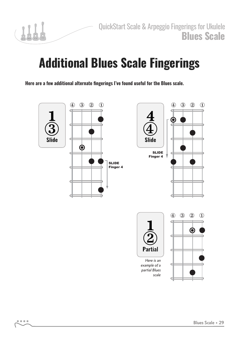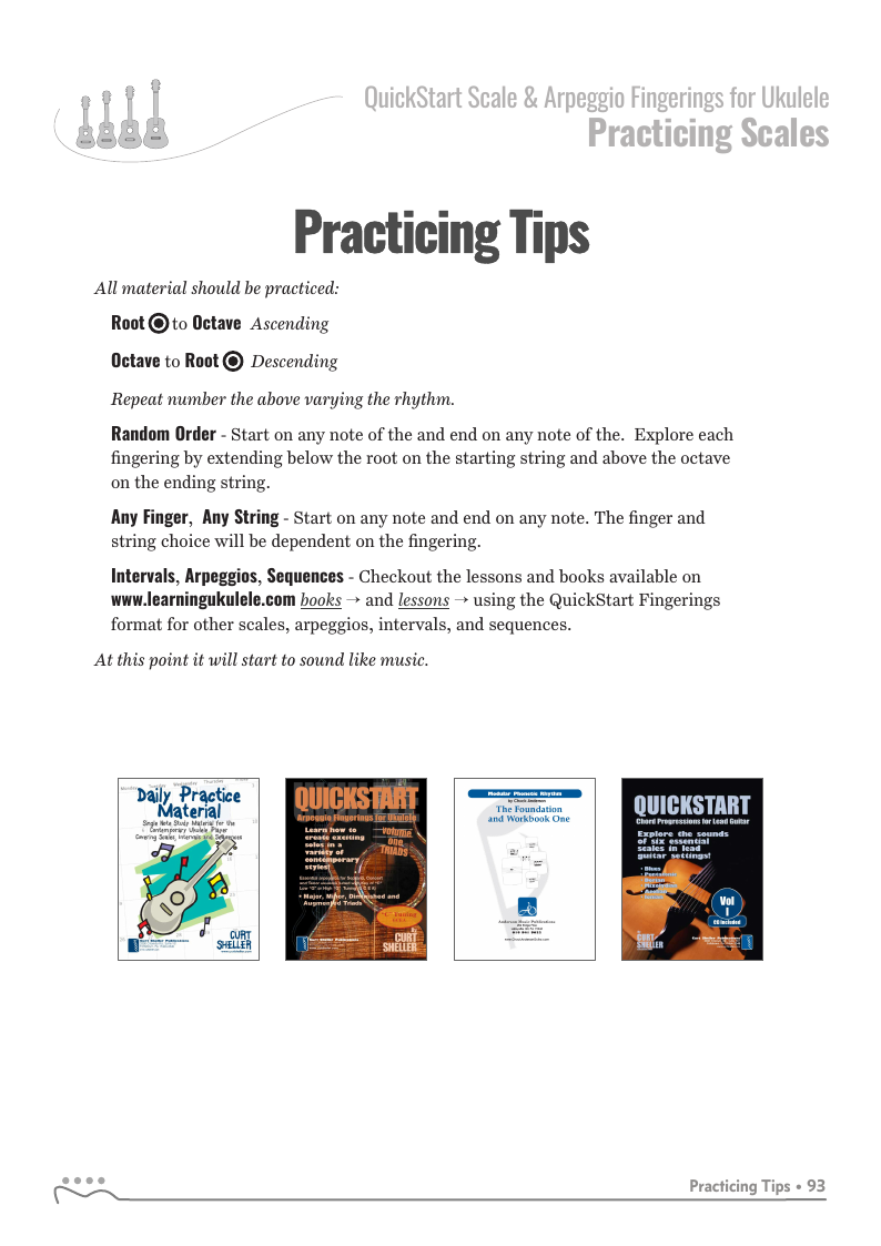 The QuickStart series of scale fingering books are available in a variety of tunings for ukulele, guitar and bass guitar.