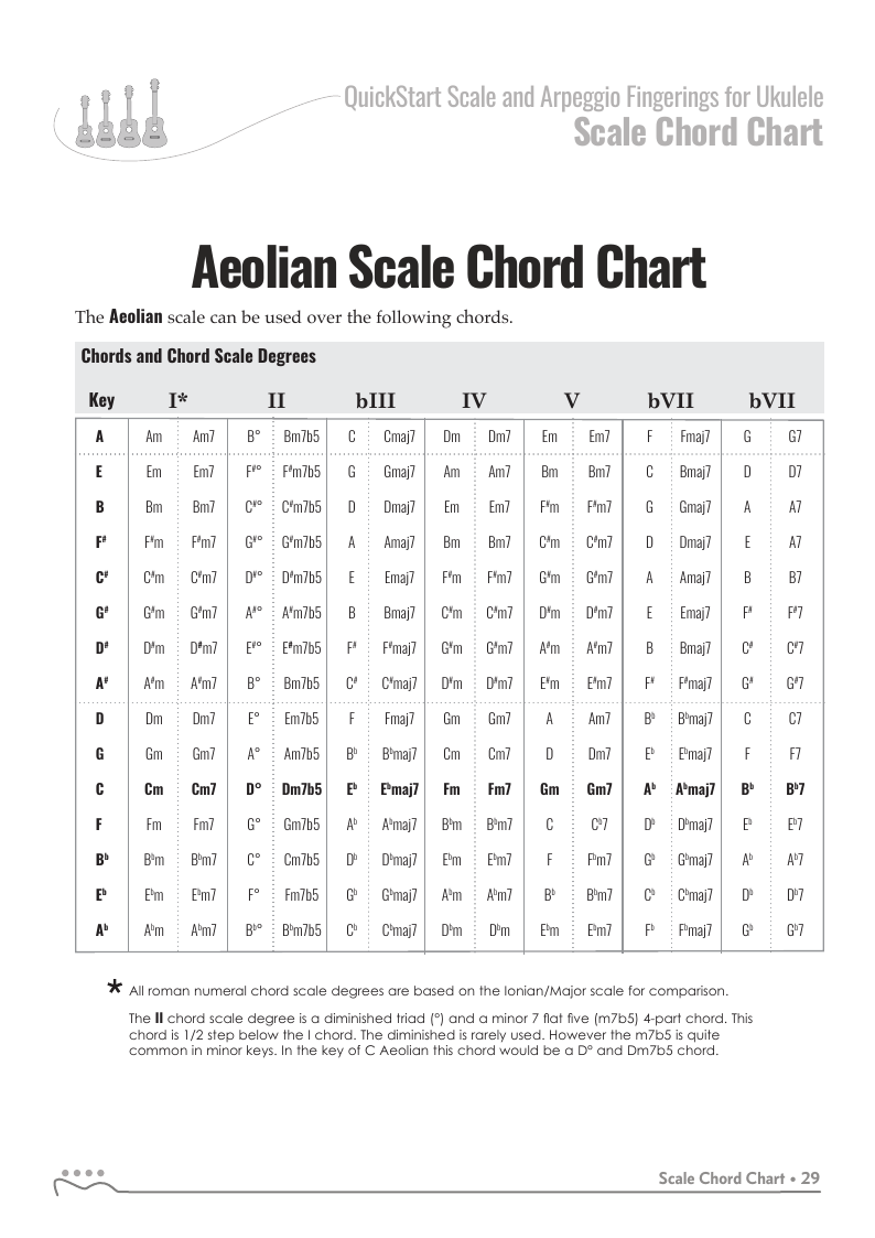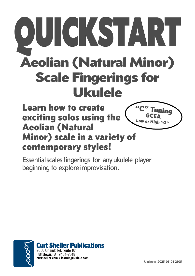 The Aeolian or Natural Minor is one of six essential scales for ALL ukulele players. One octave scale fingering solutions for strings four and three and any finger with the Aeolian scale chords are covered in all keys. Sample chord progressions for practice are included.