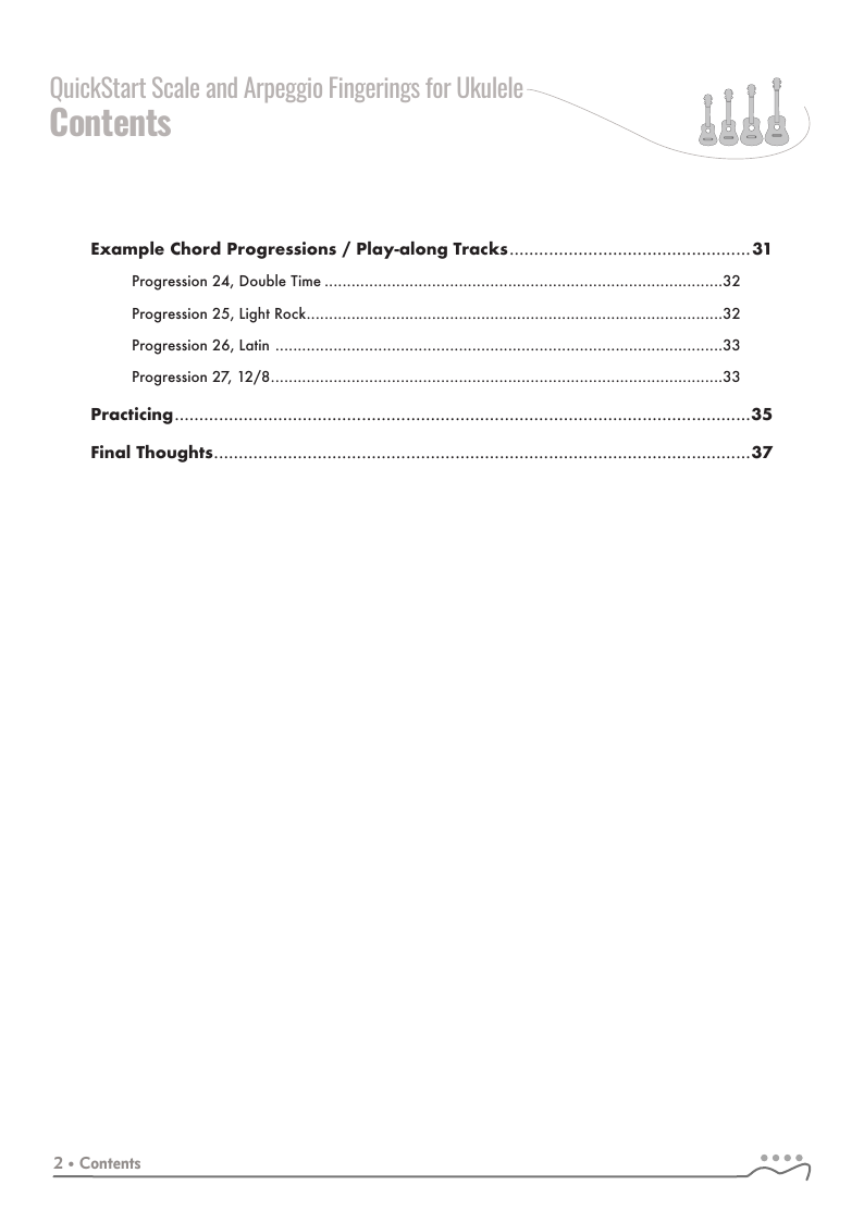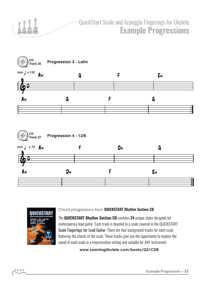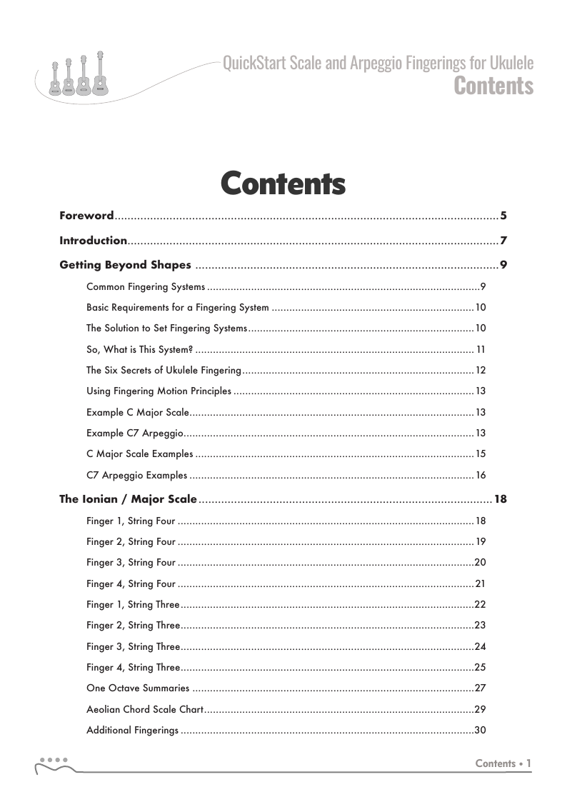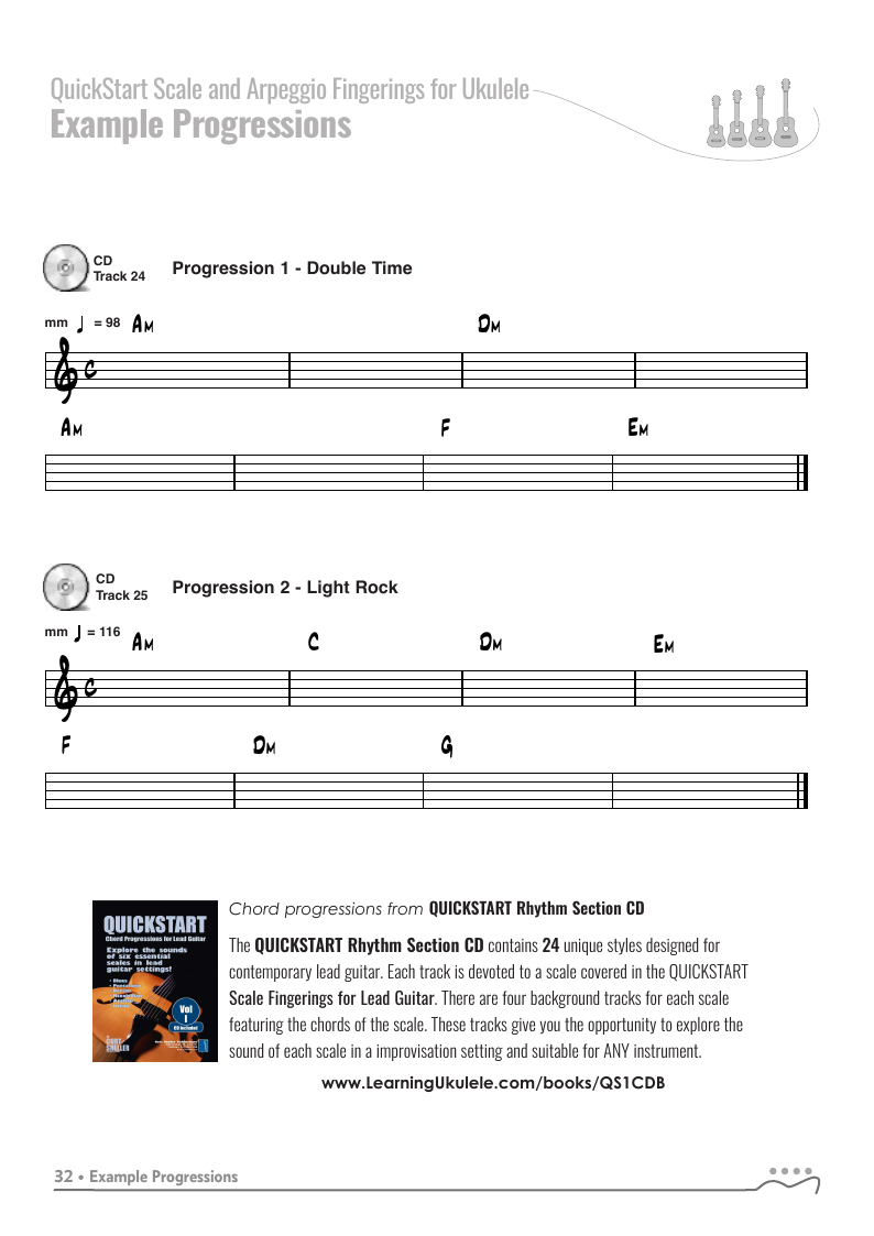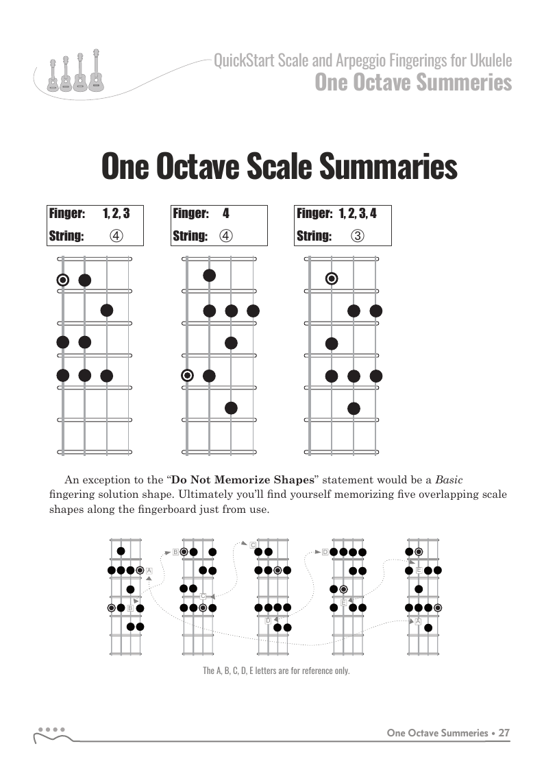 The QUICKSTART — Scale and Arpeggio Fingerings Series is a concise, well-organized series of books, lessons, and workshops ideal for any guitar, ukulele, or bass player beginning to explore “improvisation”. Unlike so many other instructional materials on the market, The QUICKSTART — Scale and Arpeggio Fingerings Series keeps a sharp focus on the essential scales and arpeggios, their fingerings and their related chords. All material is covered in every key.