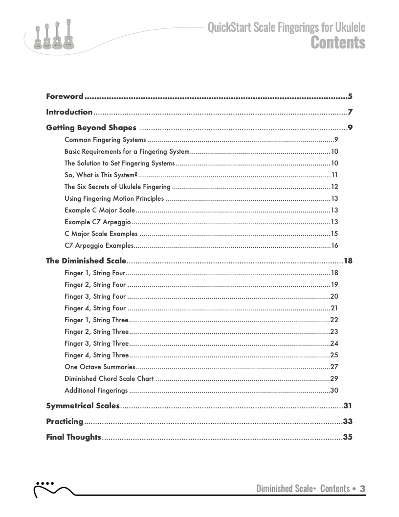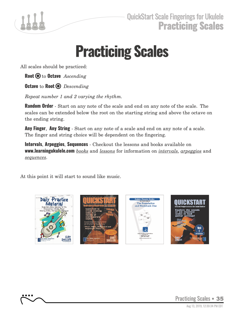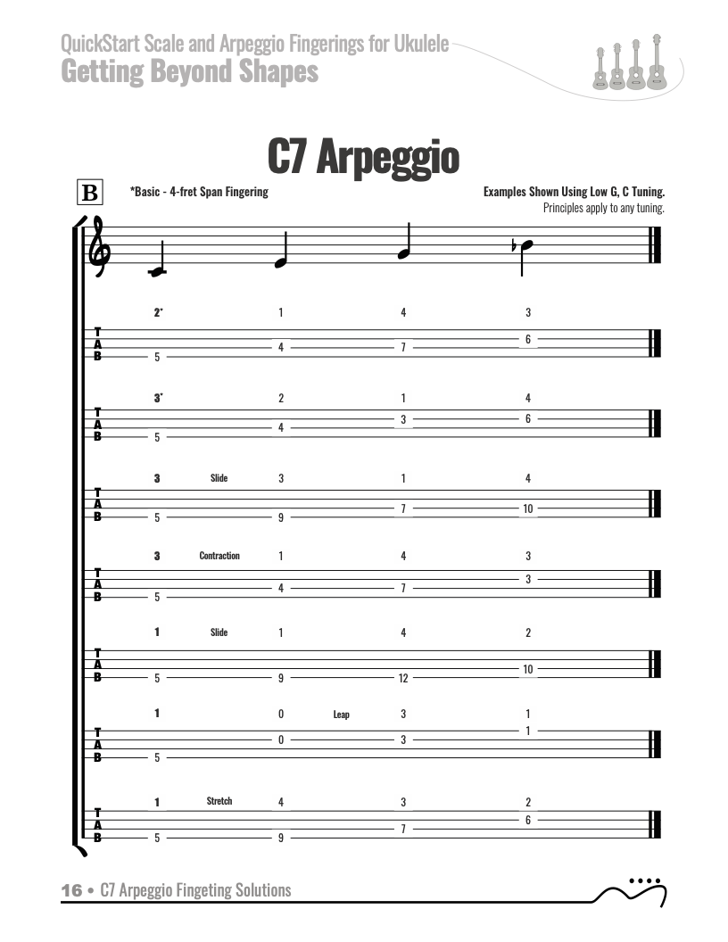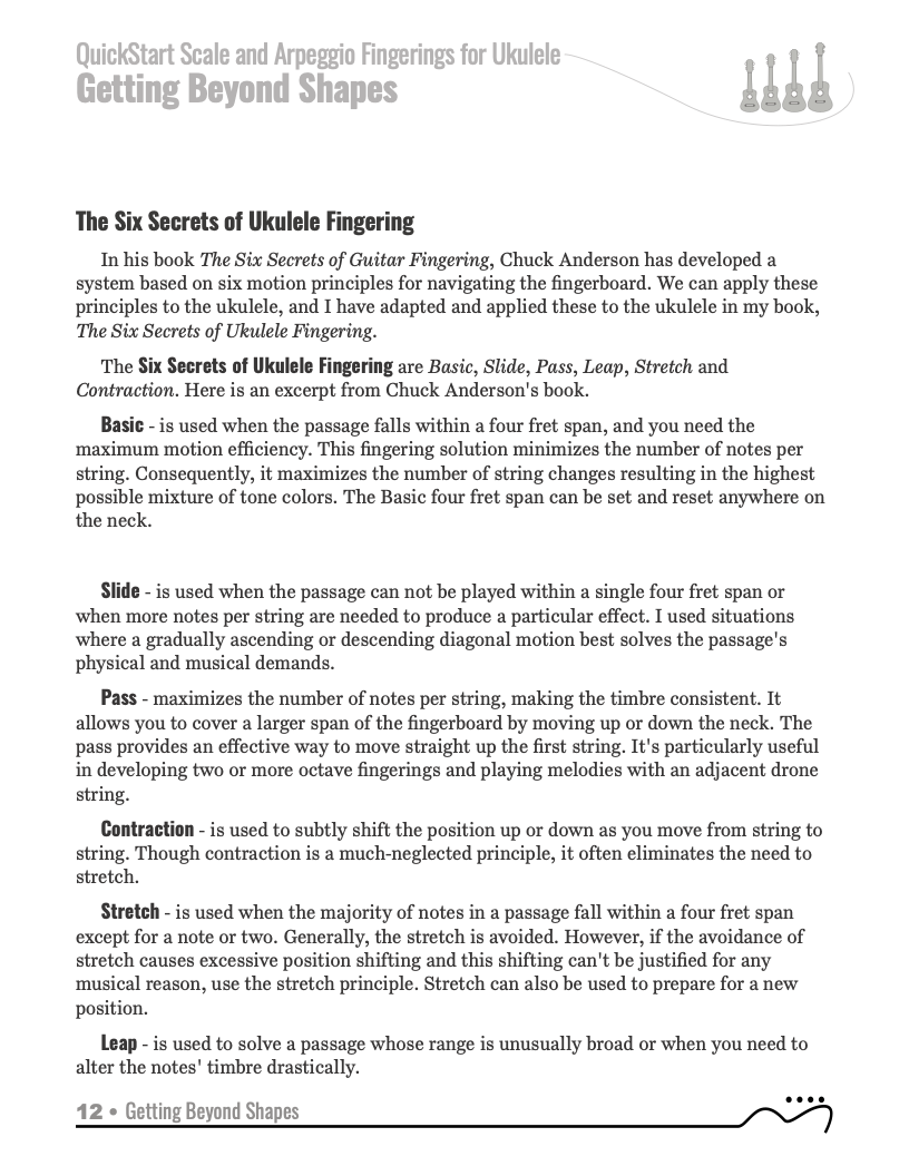 The QUICKSTART — Scale and Arpeggio Fingerings Series is a concise, well-organized series of books, lessons, and workshops ideal for any guitar, ukulele, or bass player beginning to explore “improvisation”. Unlike so many other instructional materials on the market, The QUICKSTART — Scale and Arpeggio Fingerings Series keeps a sharp focus on the essential scales and arpeggios, their fingerings and their related chords. All material is covered in every key.