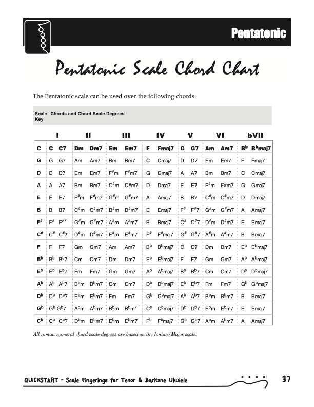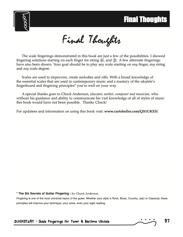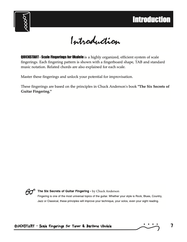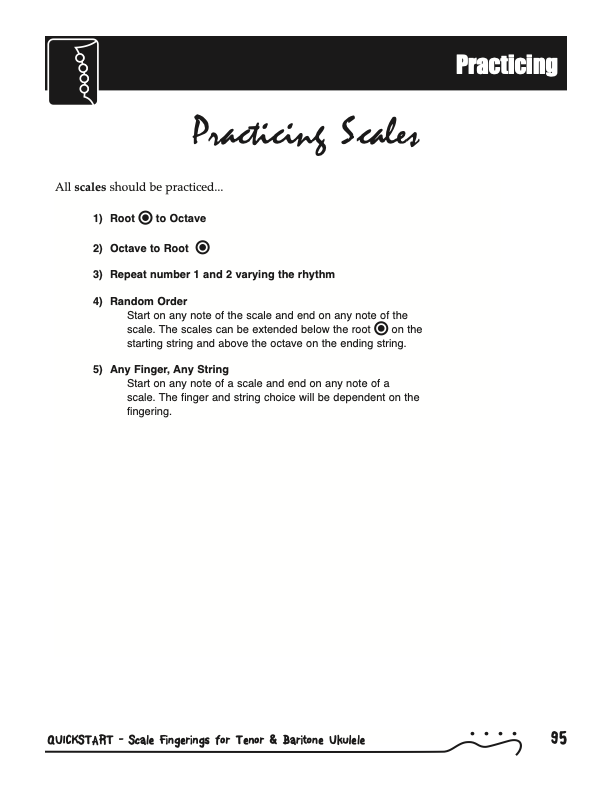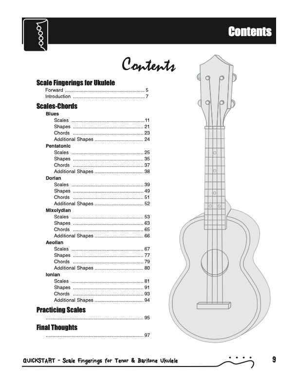QuickStart Scale and Arpeggio Fingering Series are a concise, well-organized series of books and lessons ideal for any ukulele, guitar or fretted string player beginning to explore scales and arpeggios. Unlike so many other instruction books on the market, QuickStart Scale and Arpeggio Fingering Series keeps a sharp focus on the six critical scales, their fingerings and their related chords. All material is covered in every key.