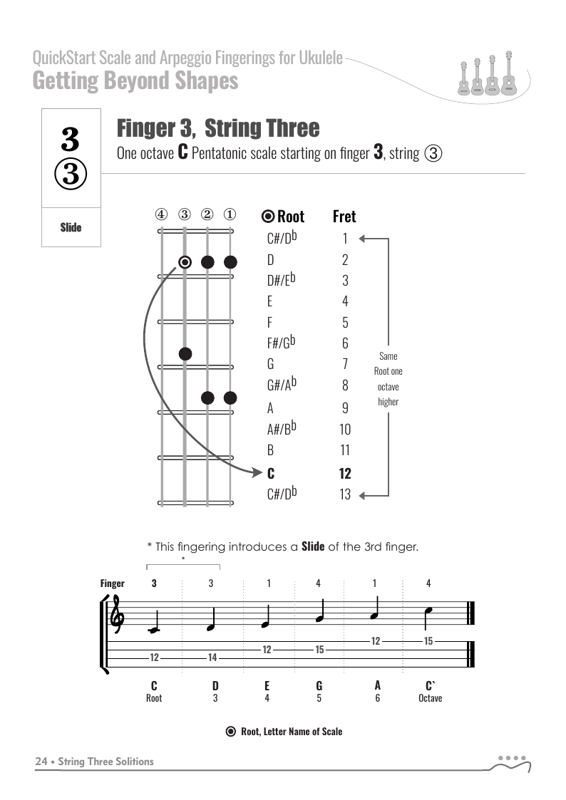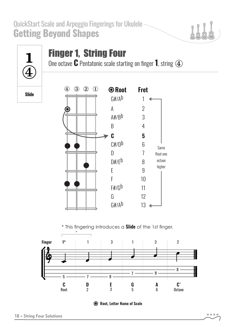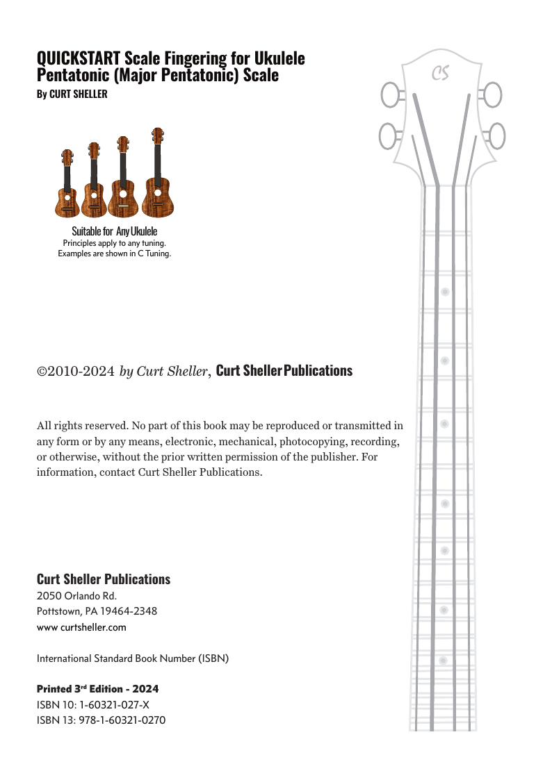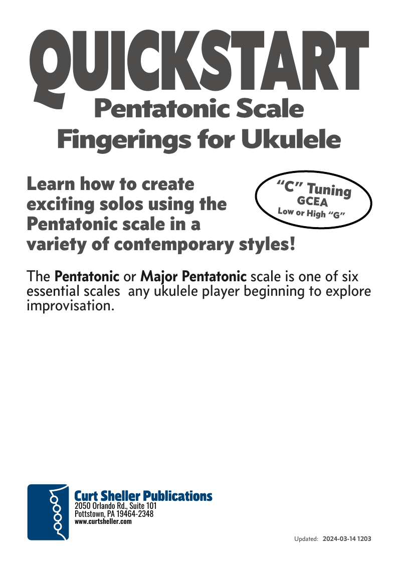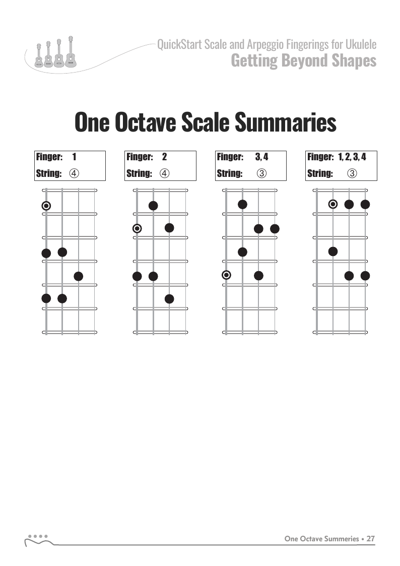QUICKSTART – Scale Fingerings for Ukulele is a highly organized, efficient system of scale fingerings. Each fingering pattern is shown with a fingerboard shape, TAB and standard music notation. Related chords are also explained for each scale.