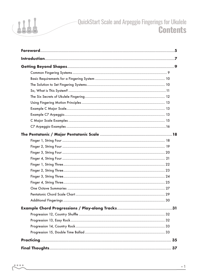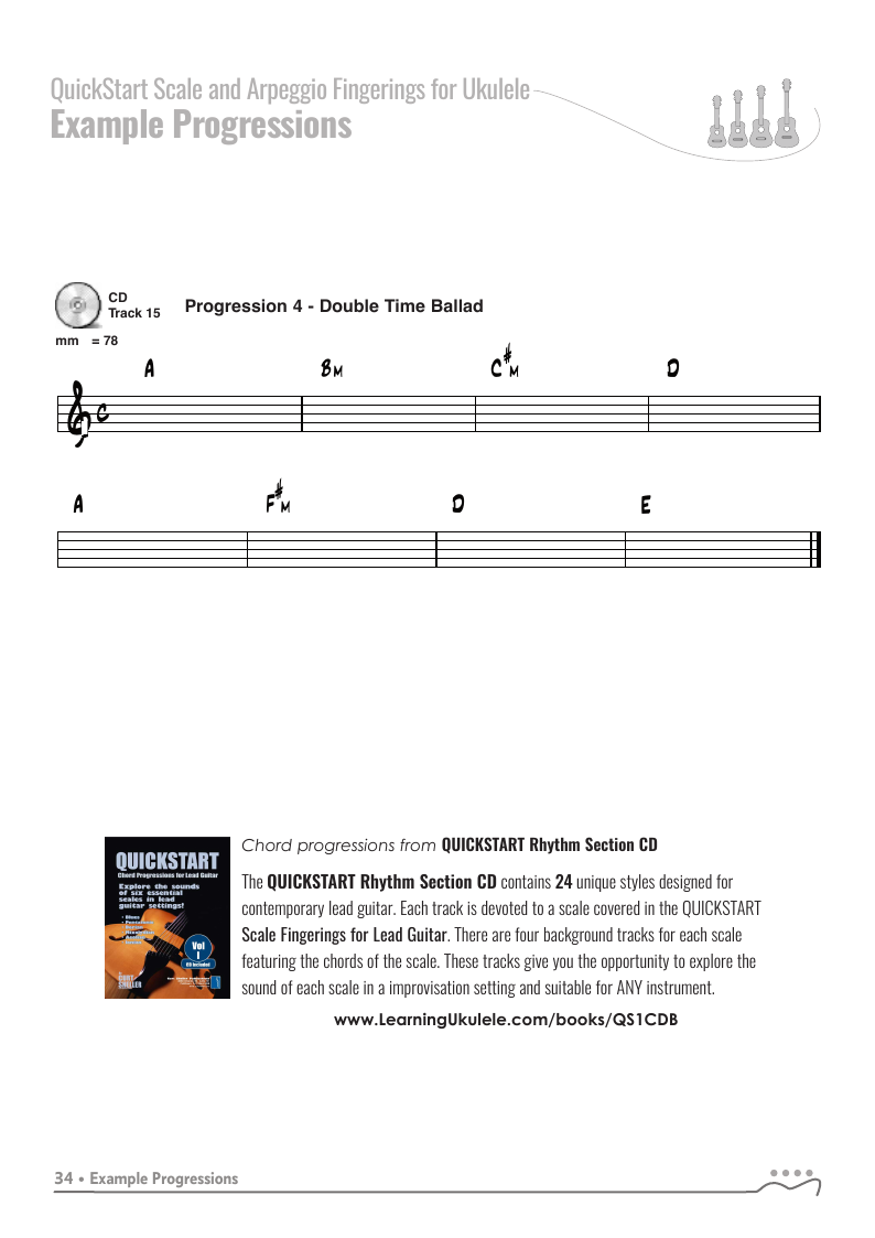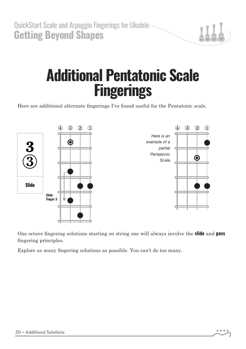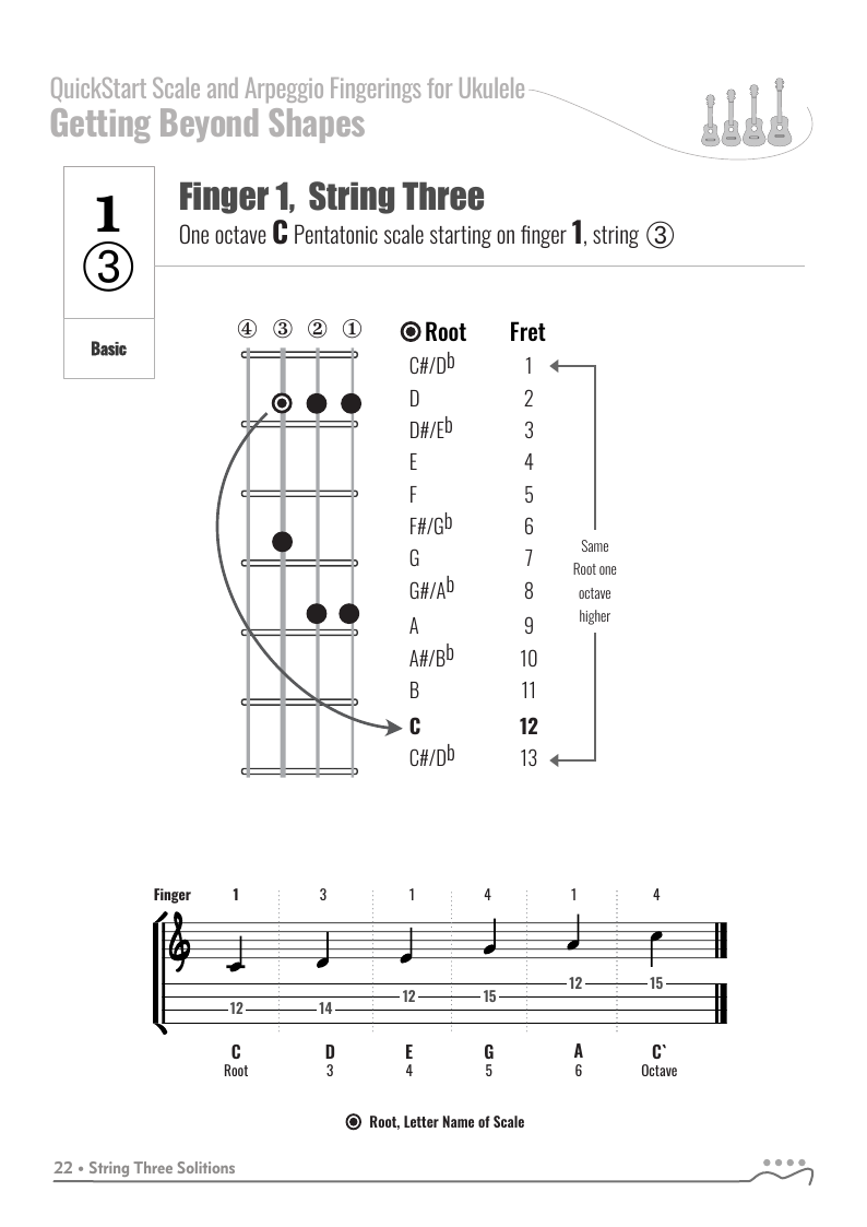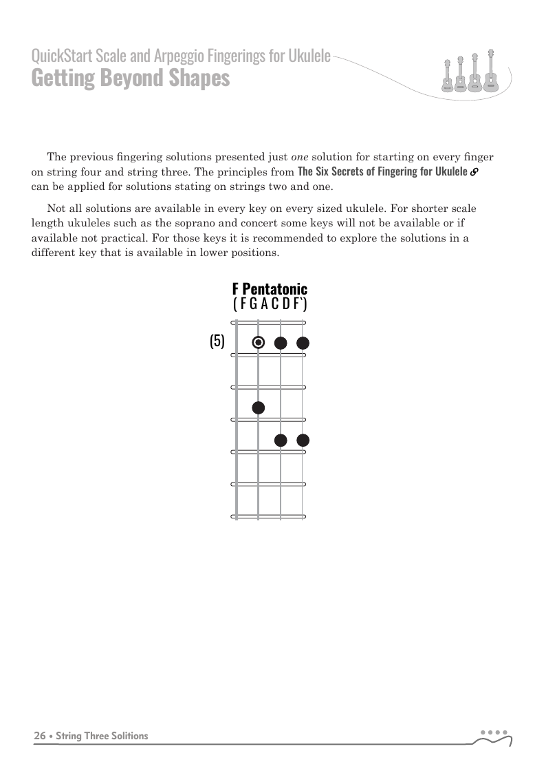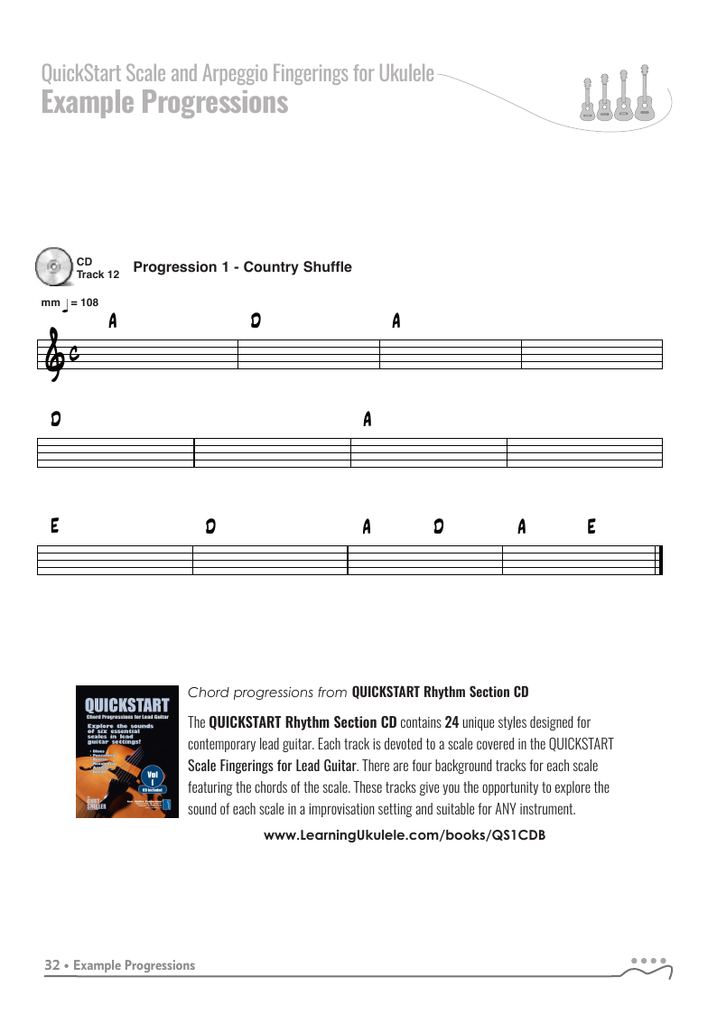 QUICKSTART – Scale Fingerings for Ukulele is a highly organized, efficient system of scale fingerings. Each fingering pattern is shown with a fingerboard shape, TAB and standard music notation. Related chords are also explained for each scale.