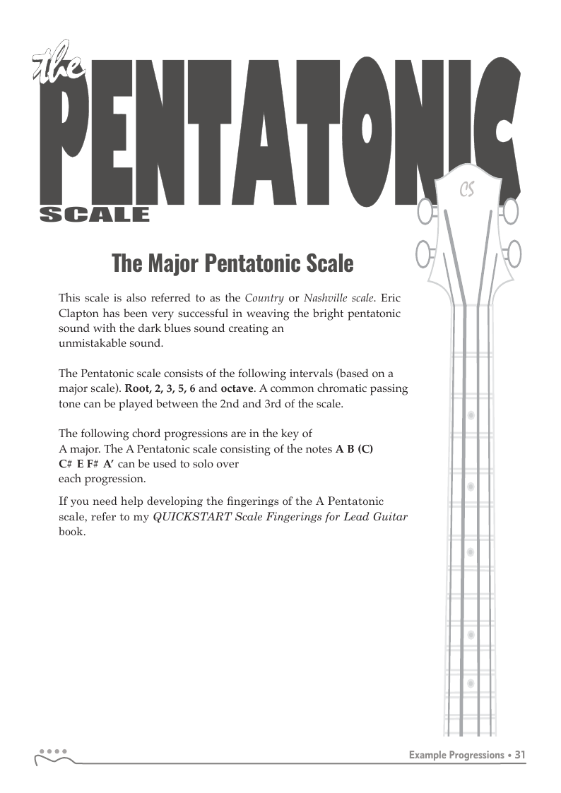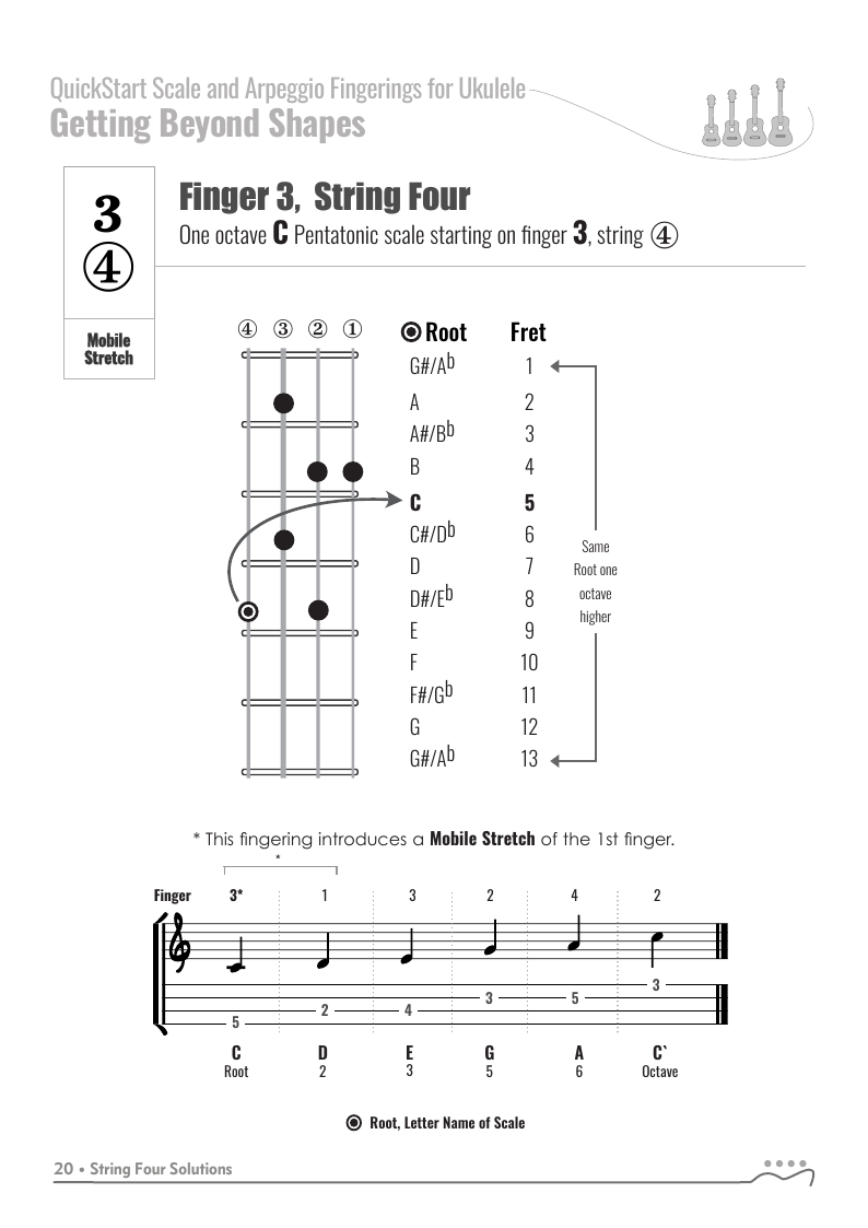 One octave scale fingering solutions for strings four and three and any finger with the Pentatonic scale chords are covered in all keys. Sample chord progressions for practice are included.