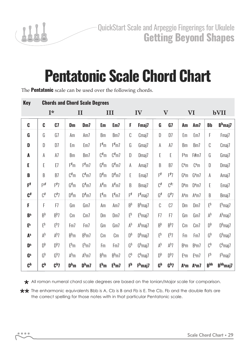 The Pentatonic or Major Pentatonic is one of six essential scales for ALL ukulele players. One octave scale fingering solutions covering strings four and three using any finger. Pentatonic (Major Pentatonic) scale chords are covered in all keys.