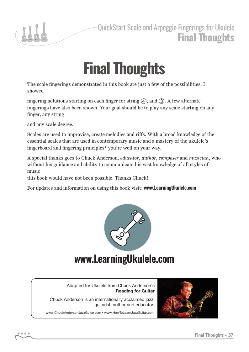 QuickStart Scale and Arpeggio Fingering Series are a concise, well-organized series of books and lessons ideal for any ukulele, guitar or fretted string player beginning to explore scales and arpeggios. Unlike so many other instruction books on the market, QuickStart Scale and Arpeggio Fingering Series keeps a sharp focus on the six critical scales, their fingerings and their related chords. All material is covered in every key.