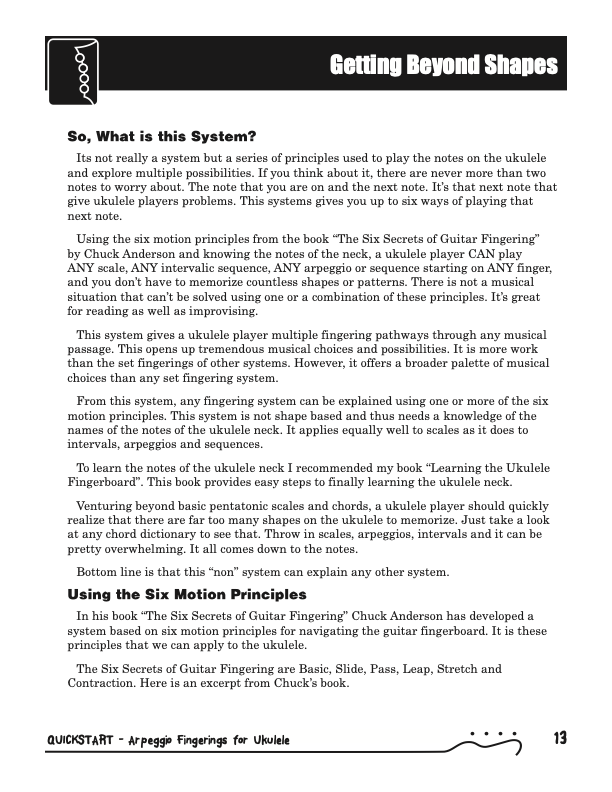 Over the years, people have come up with various fingering systems, patterns, and even gadgets to make learning the ukulele easier. Most systems are shape and pattern based and geared to the beginning student and do not require any knowledge of the ukulele fingerboard beyond what a fret is and the location of strings.