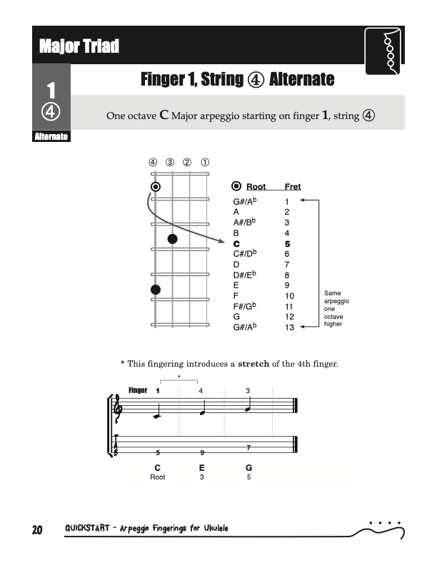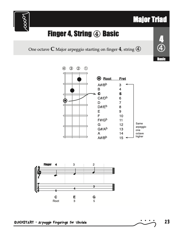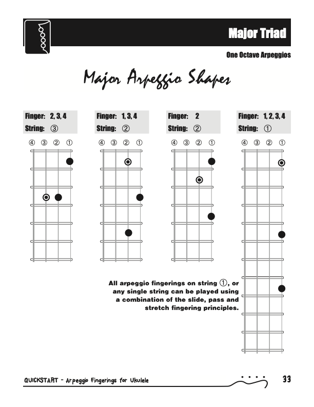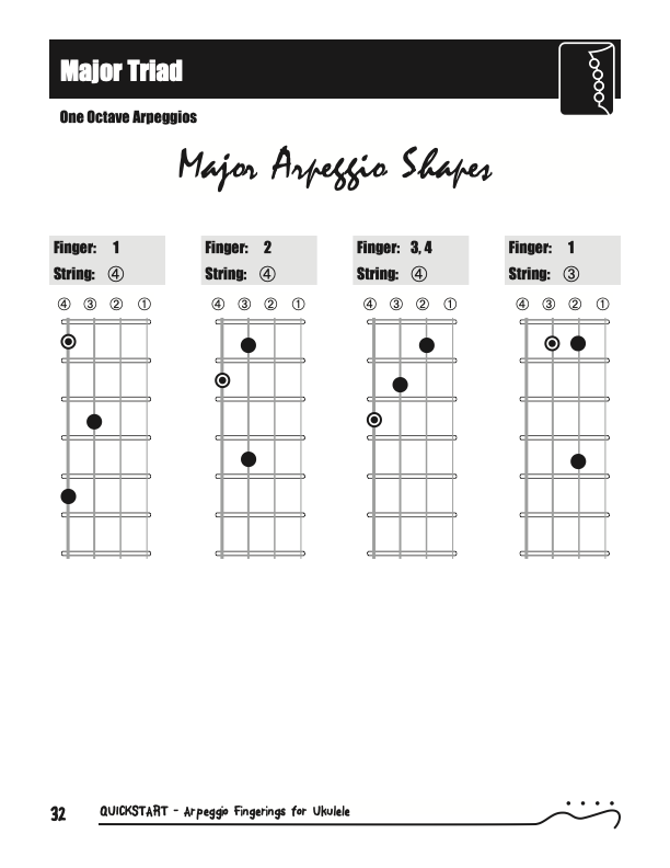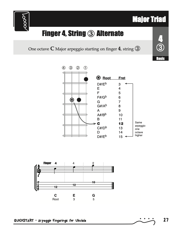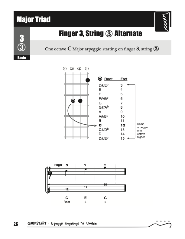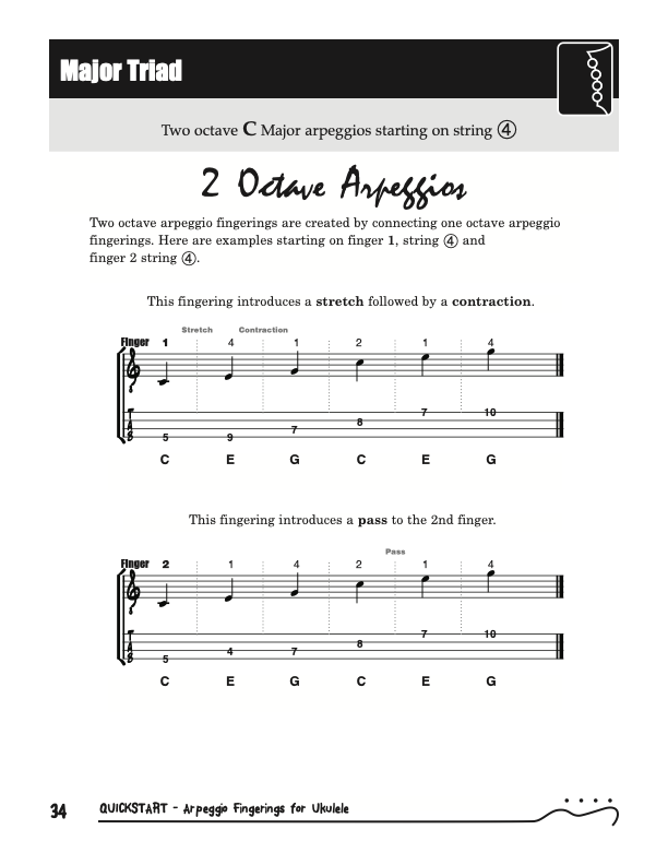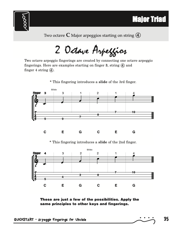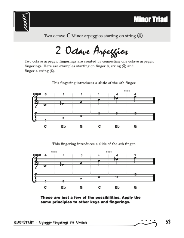 QuickStart Scale Arpeggio Fingerings for Ukulele - Triads is a concise, well organized book ideal for any ukulele player beginning to explore the ukulele's full potential as a musical instrument. Arpeggio Fingerings for Ukulele - Triads keeps a sharp focus on essential arpeggios and their fingerings. All material is covered in every key.