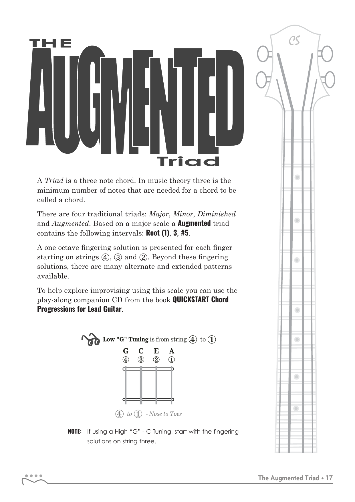There are four traditional triads: Major, Minor, Diminished and Augmented. Based on a major scale a Major triad contains the following intervals: Root (1), 3, . A one octave fingering solution is presented for each finger starting on strings ➃, ➂ and ➁.