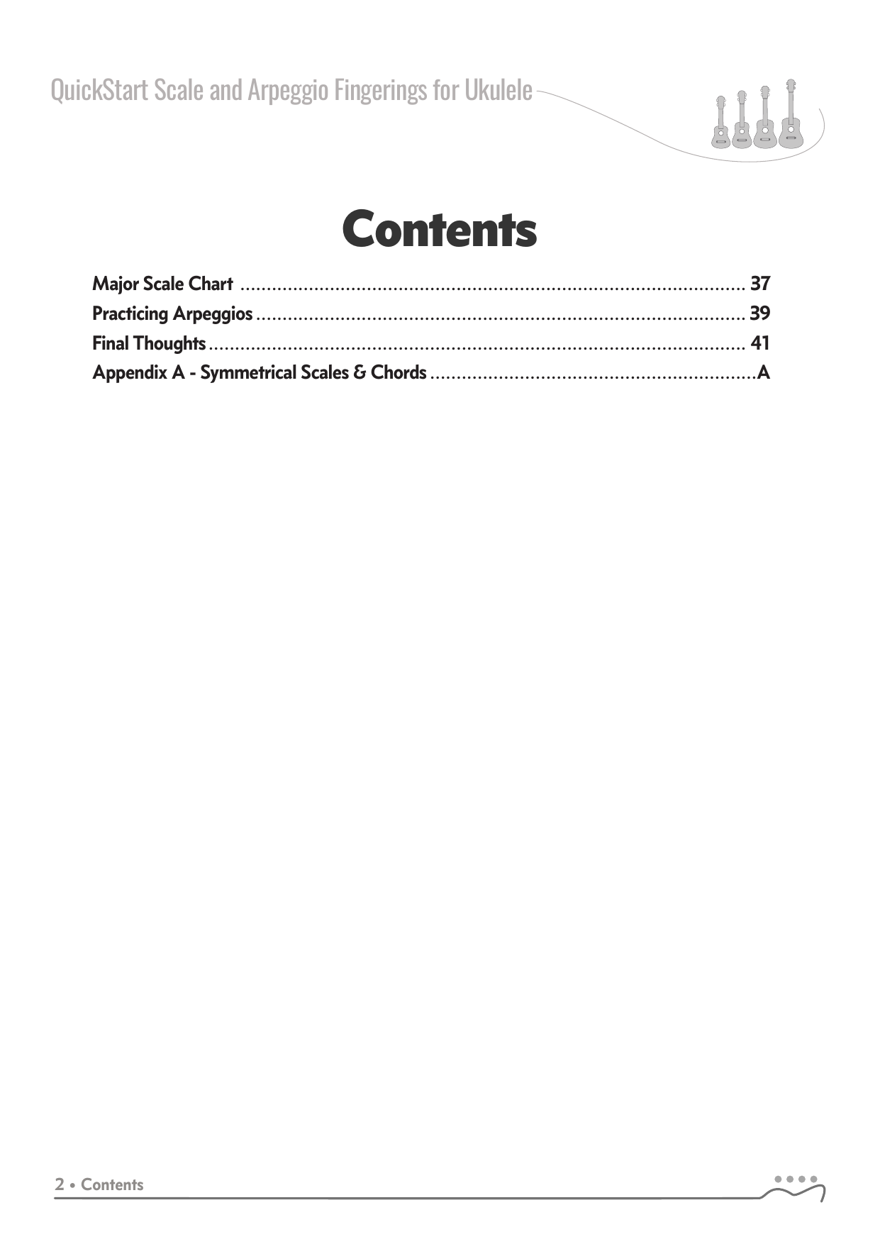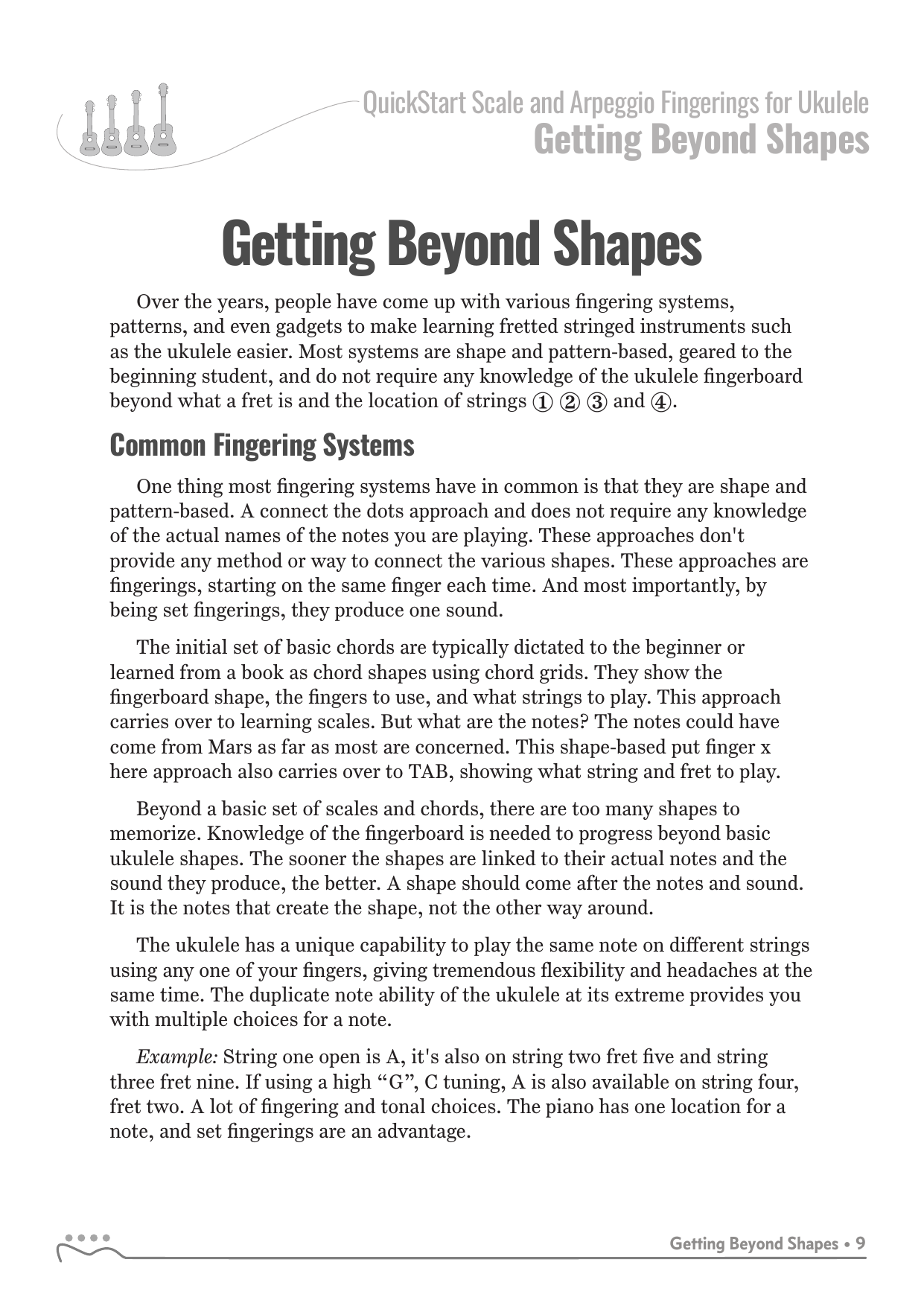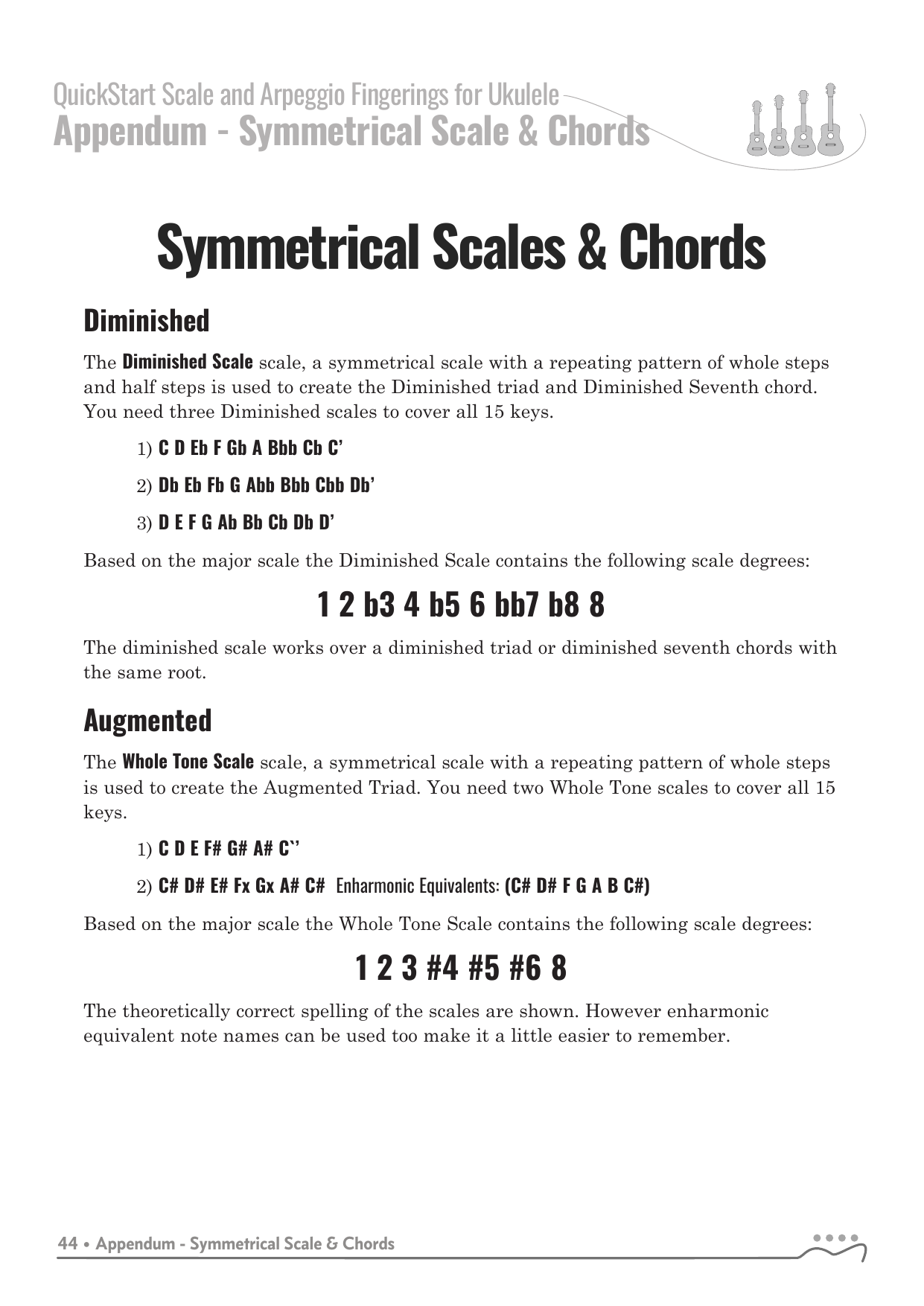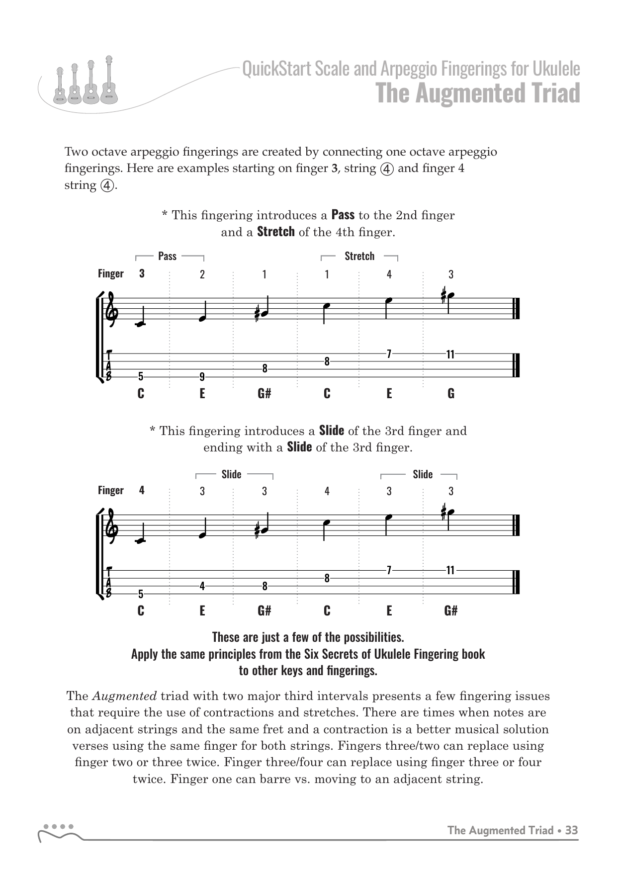 QuickStart Scale and Arpeggio Fingering Series are a concise, well-organized series of books and lessons ideal for any ukulele, guitar or fretted string player beginning to explore scales and arpeggios. Unlike so many other instruction books on the market, QuickStart Scale and Arpeggio Fingering Series keeps a sharp focus on the six critical scales, their fingerings and their related chords. All material is covered in every key.