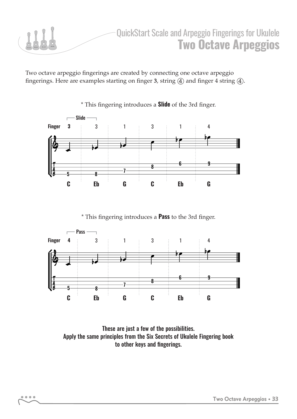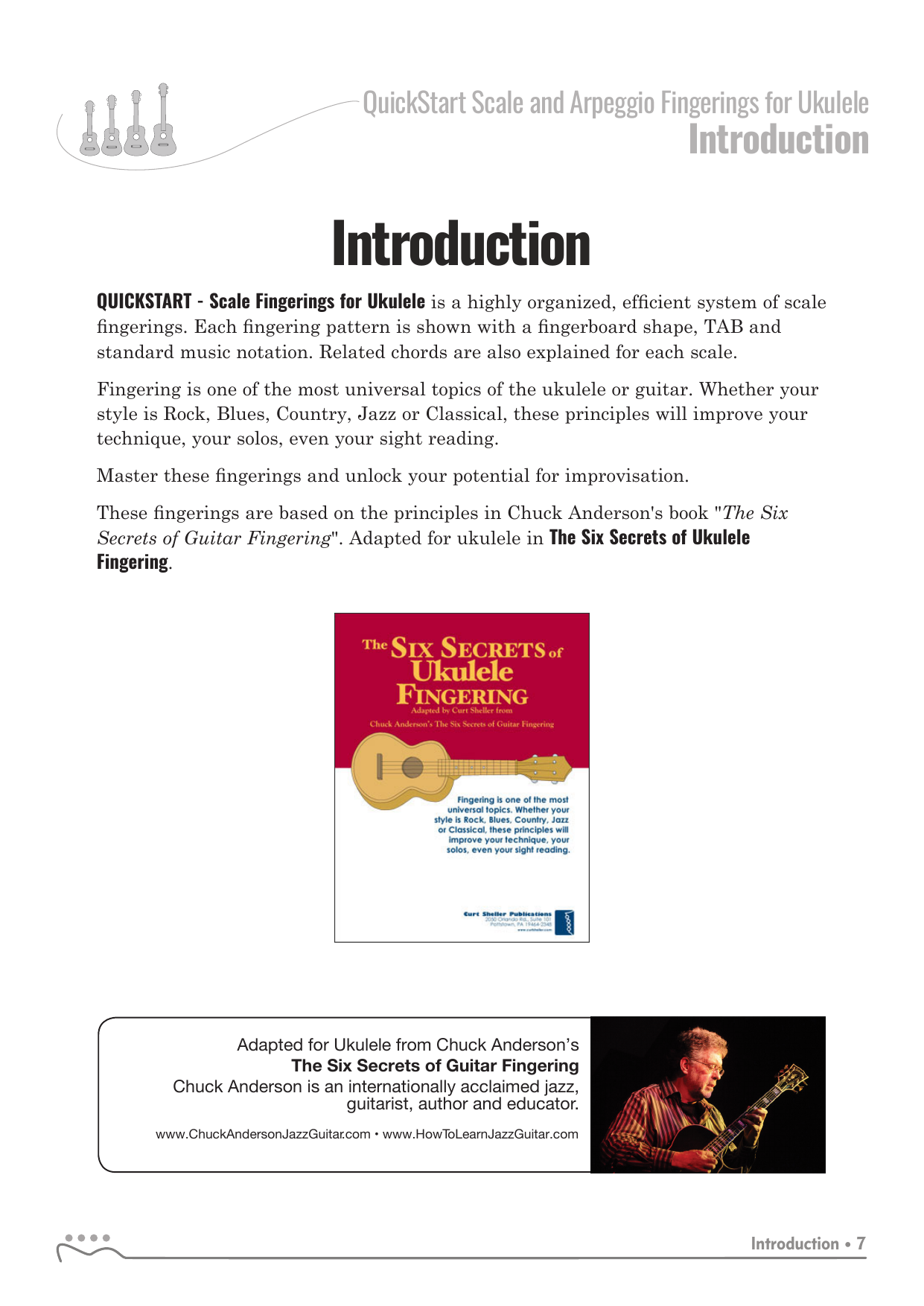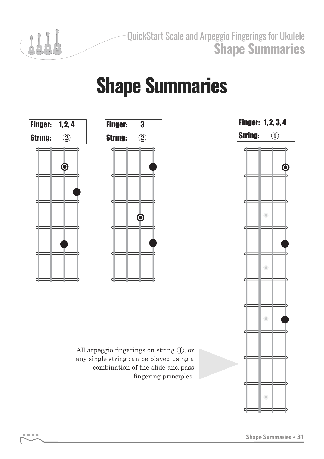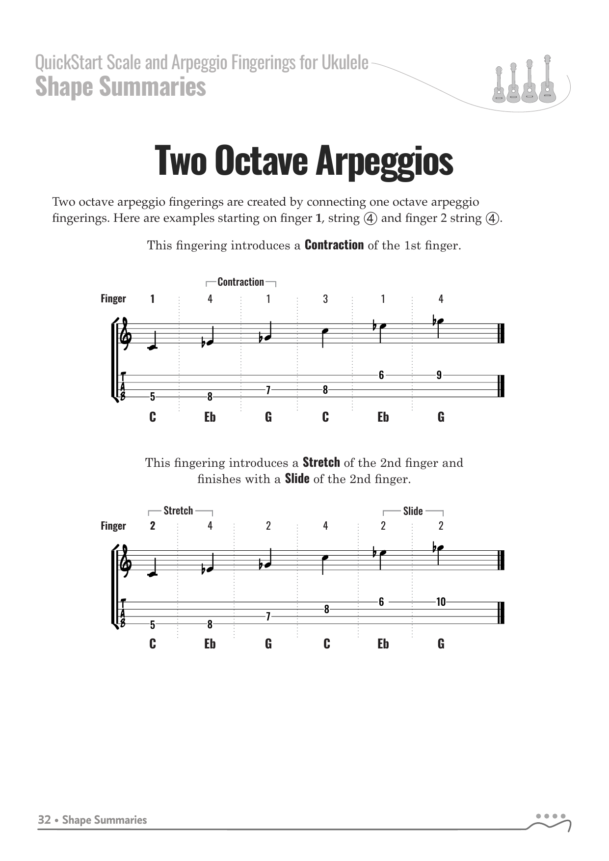 QuickStart Scale and Arpeggio Fingering Series are a concise, well-organized series of books and lessons ideal for any ukulele, guitar or fretted string player beginning to explore scales and arpeggios. Unlike so many other instruction books on the market, QuickStart Scale and Arpeggio Fingering Series keeps a sharp focus on the six critical scales, their fingerings and their related chords. All material is covered in every key.