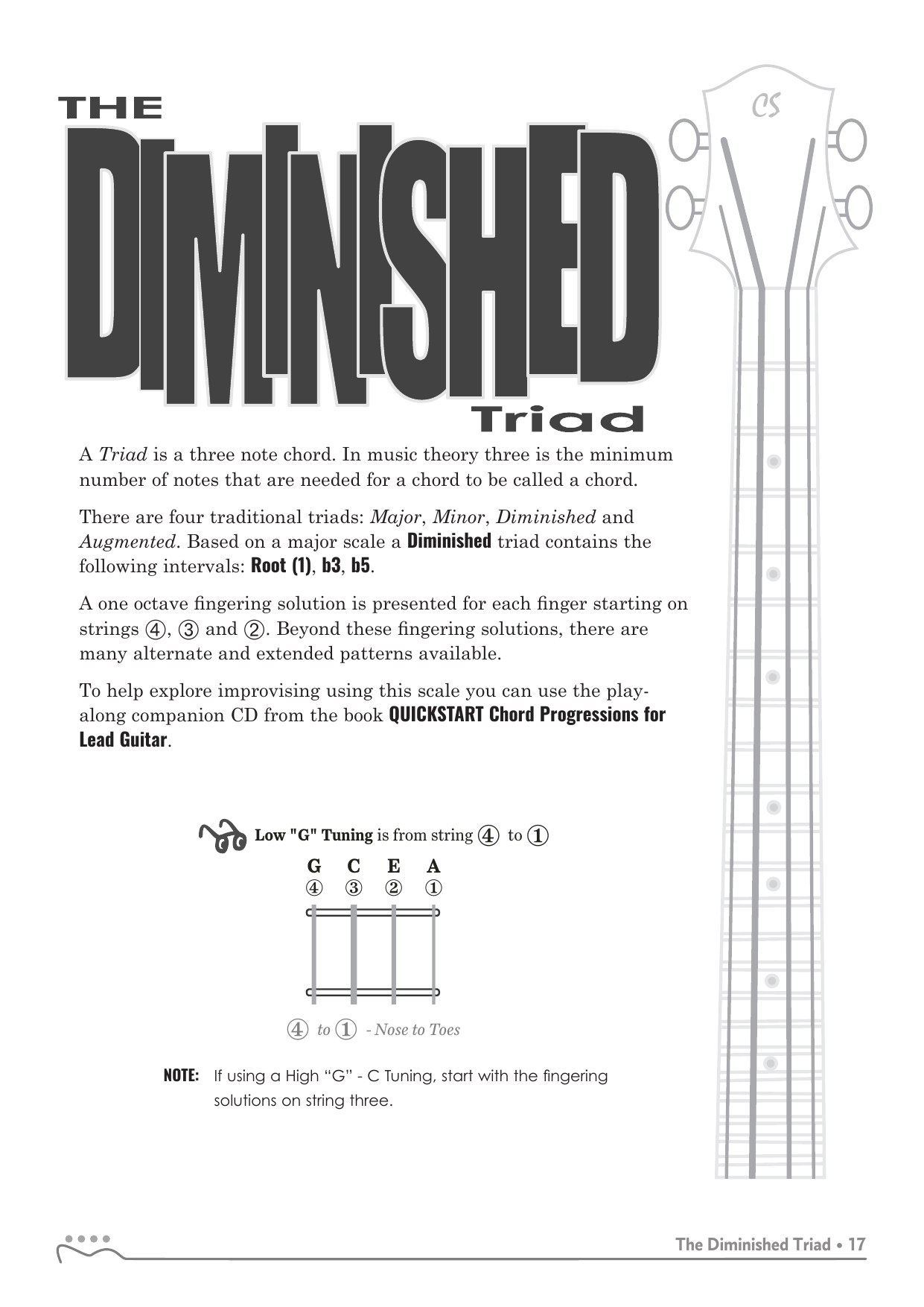 There are four traditional triads: Major, Minor, Diminished and Augmented. Based on a major scale a Major triad contains the following intervals: Root (1), 3, . A one octave fingering solution is presented for each finger starting on strings ➃, ➂ and ➁.
