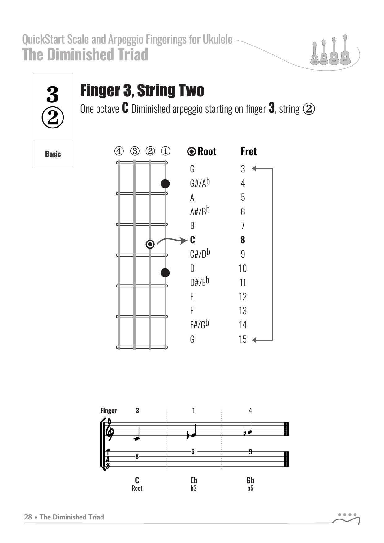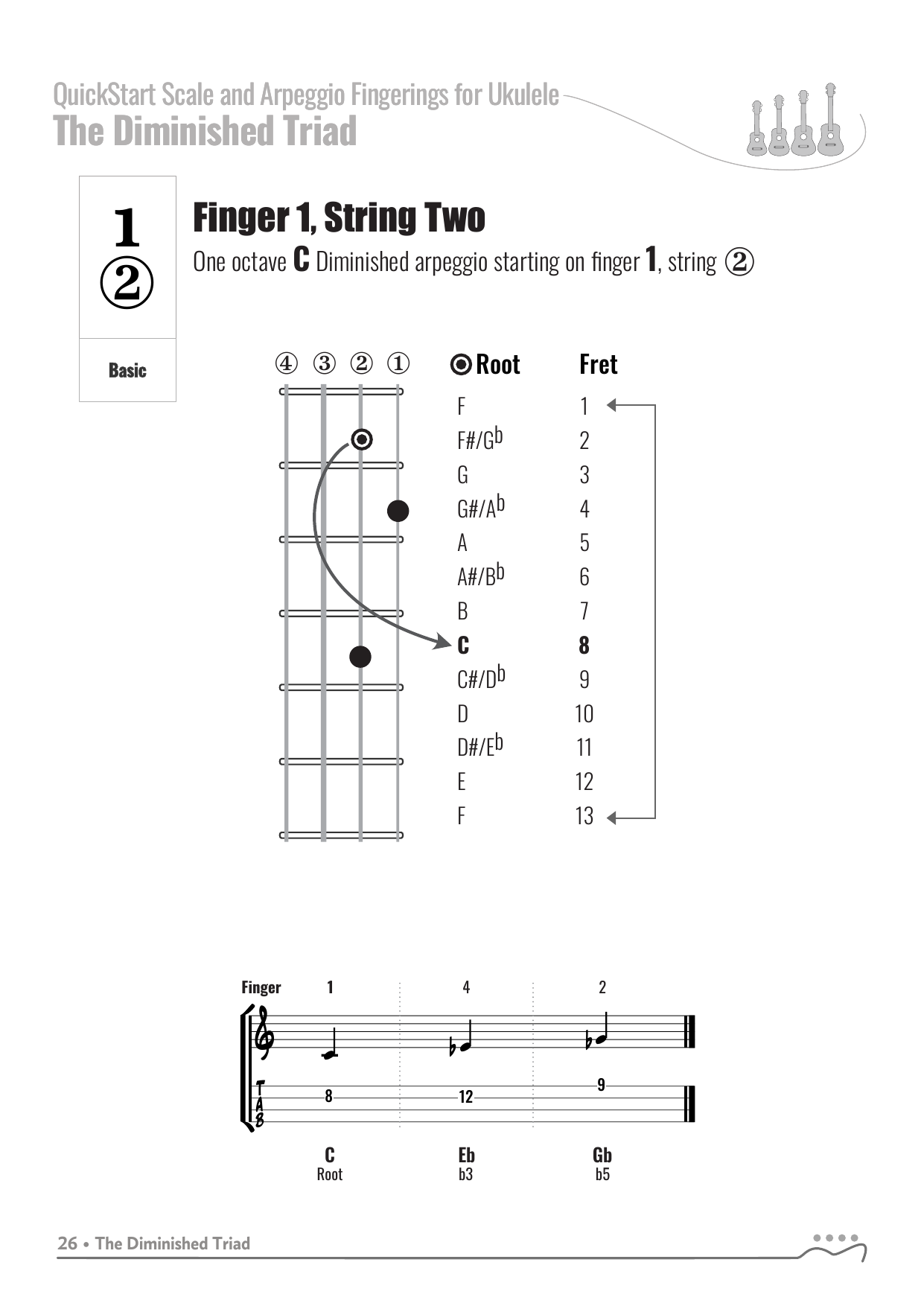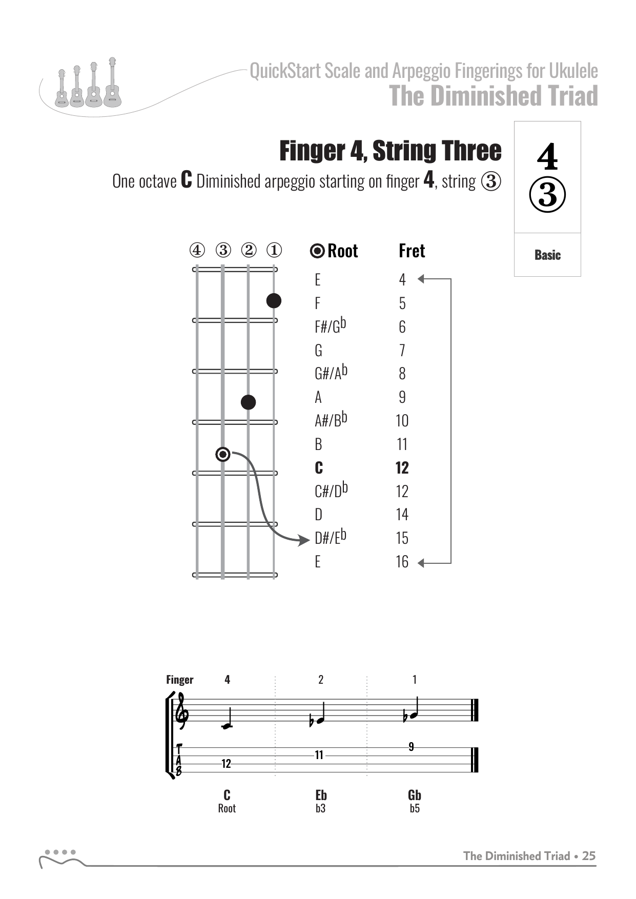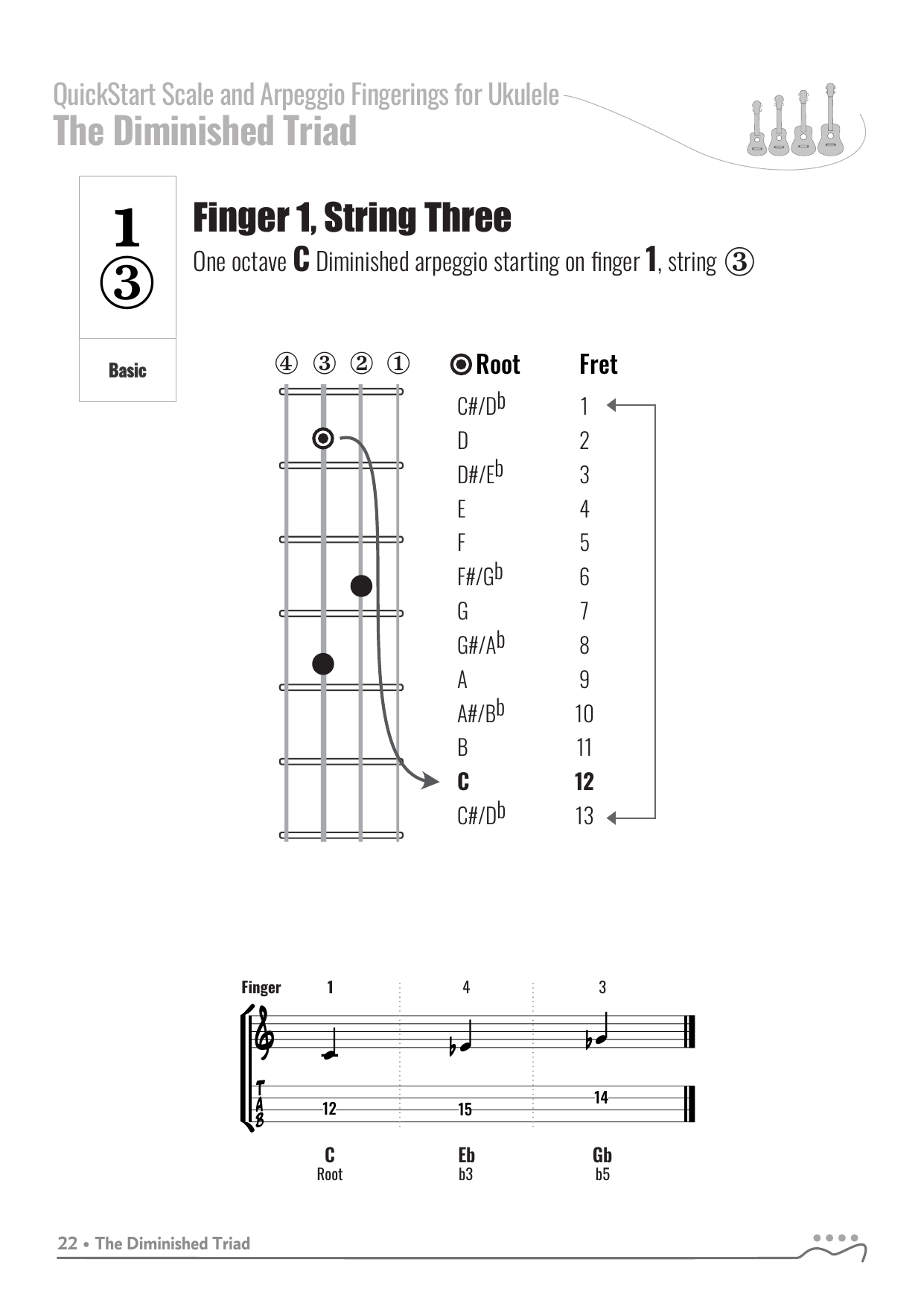 QuickStart Arpeggio Fingerings for Ukulele, C Tuning - Diminished Triad.