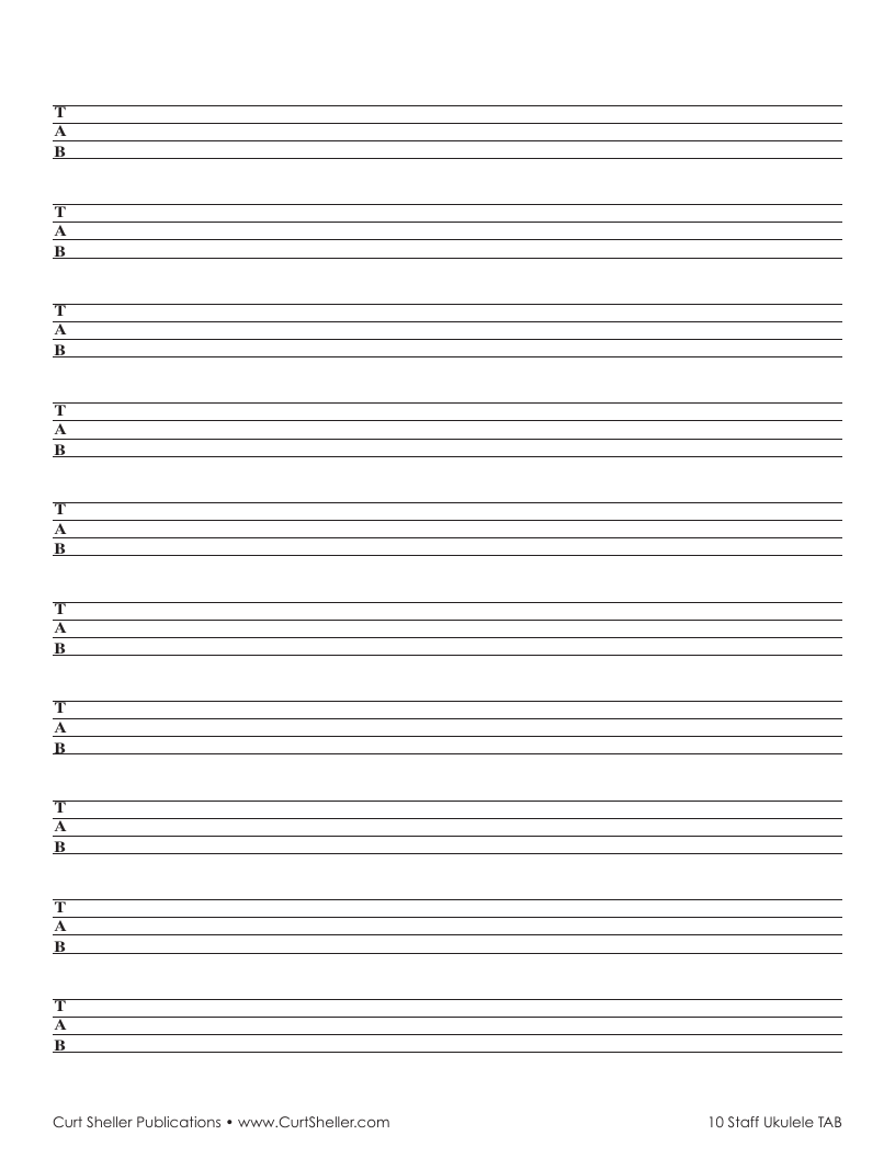 Blank 10 Staves of Ukulele TAB for taking "Notes" (pun intended), notating your licks, riffs, melodies, fingerings, etc. Useful for any four-stringed instrument.