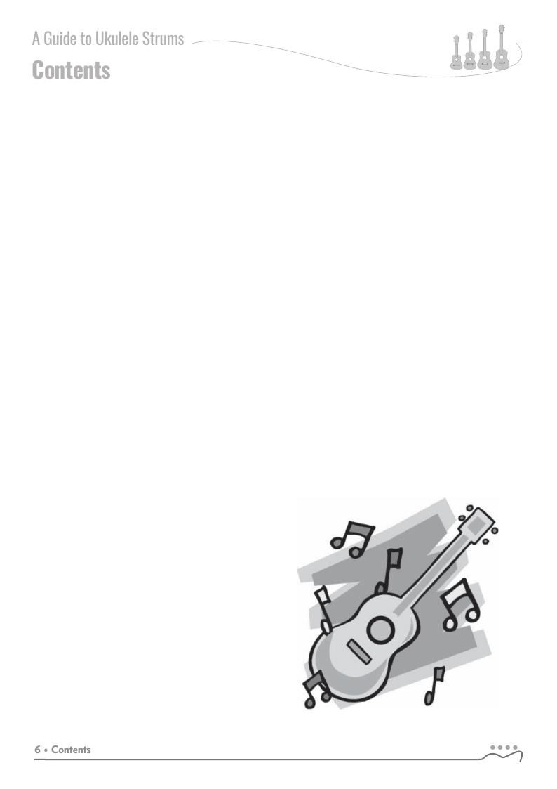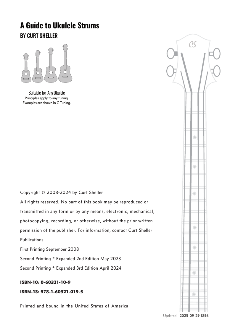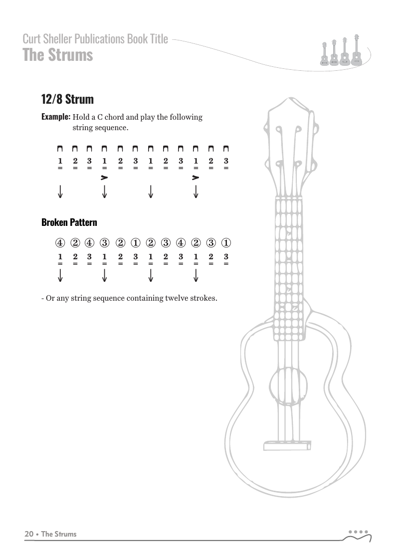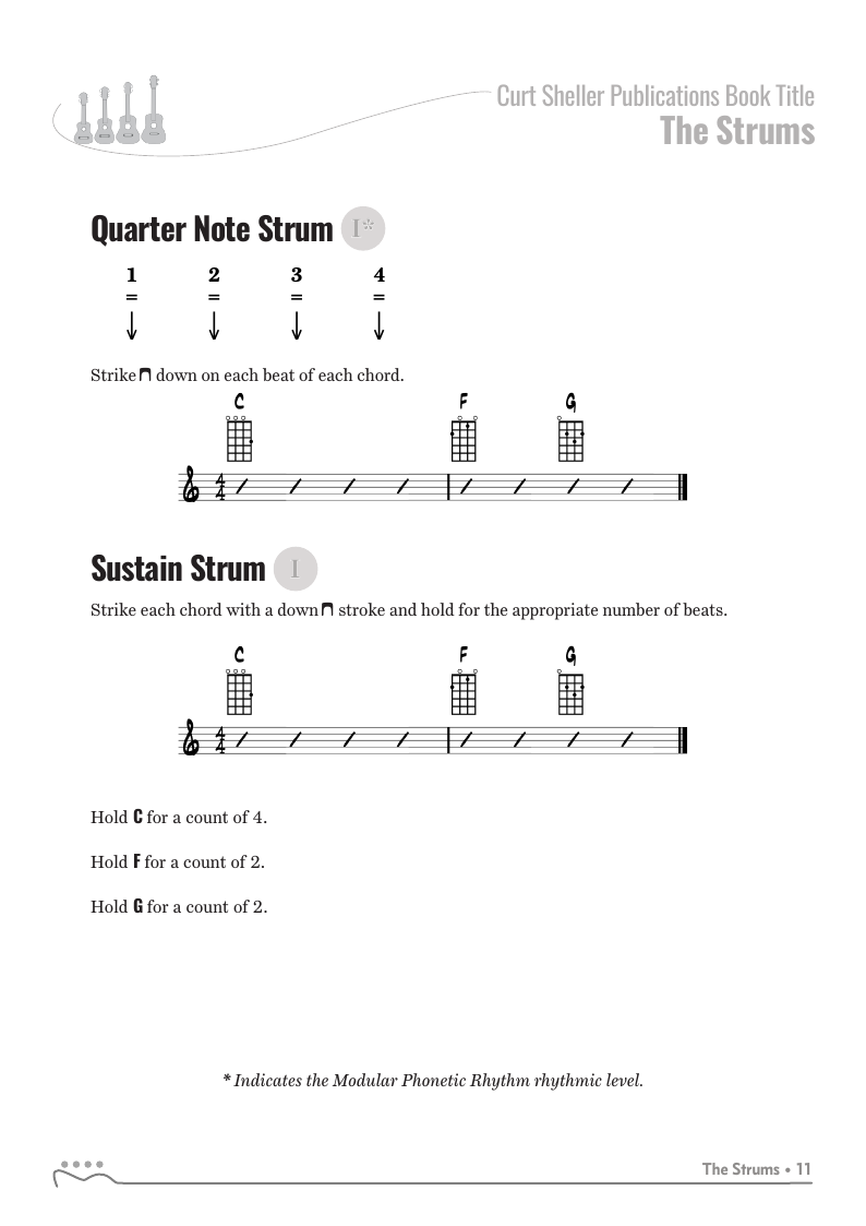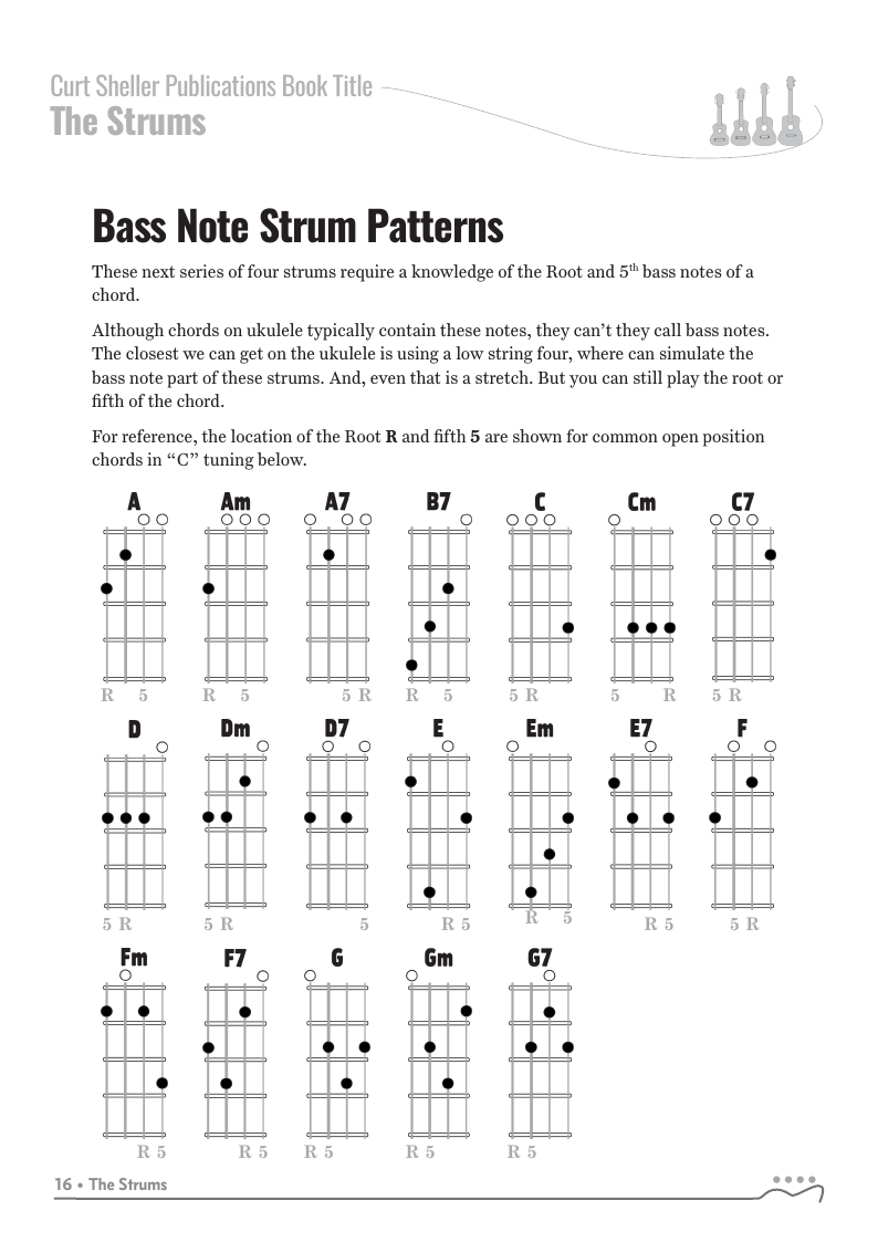 The strums in this book work in any tuning or instrument. Chord examples shown for ukuleles in C tuning.